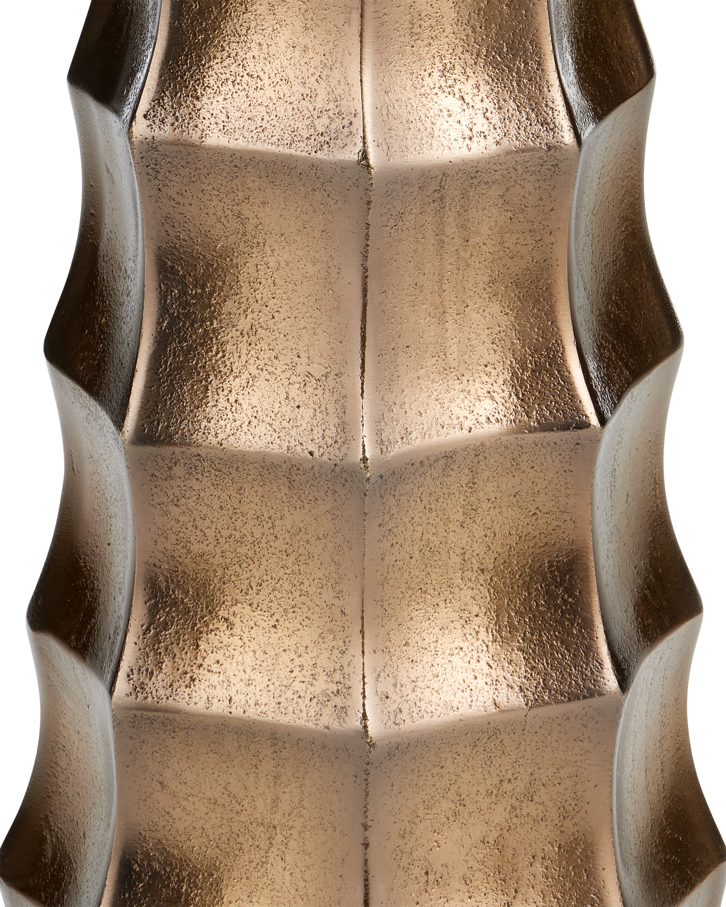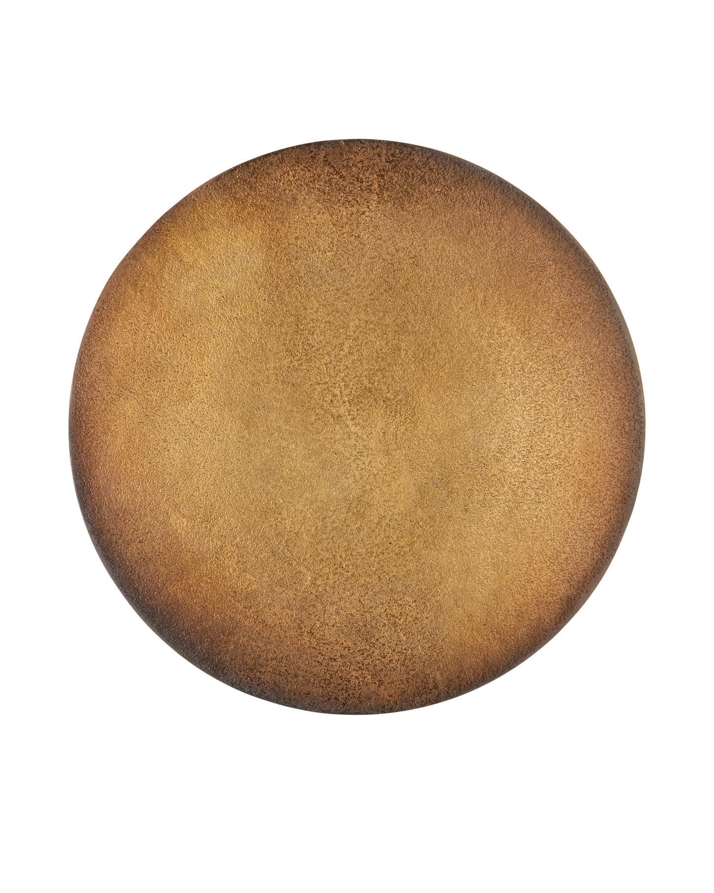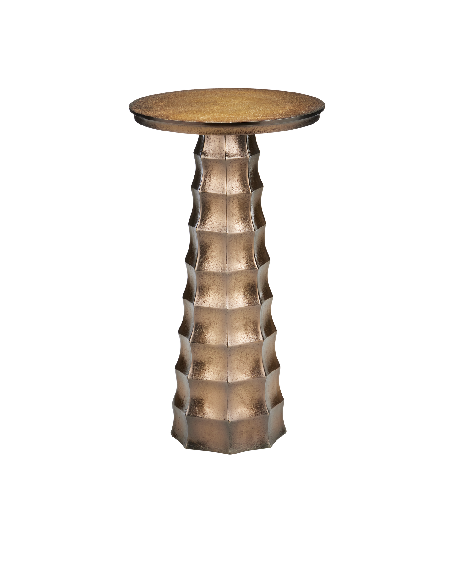 The Gridiron Drinks Table is crafted from cast aluminum in an antique brass finish. Its round tabletop is supported by a gracefully tapered pedestal that narrows as it ascends. The fluted design with convex shapes that diminish in size as they rise toward the top create a subtle sense of rhythm and sophistication. The warm gold drinks table, which has a vintage appeal, stands 23.5 inches tall and is 13 inches in diameter.