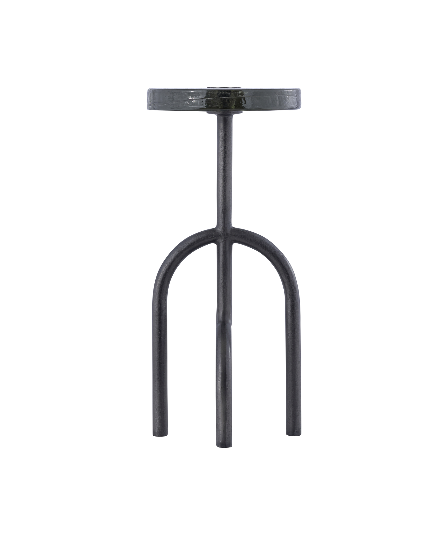 The Grove Drinks Table has legs designed to be a clean, contemporary version of mangrove roots. The aluminum shape in a black nickel finish holds a cast glass top that is extremely artisanal given it is made by hand in a mold. This artisal effect brings this black drinks table a strong appeal for such a small piece of furniture.