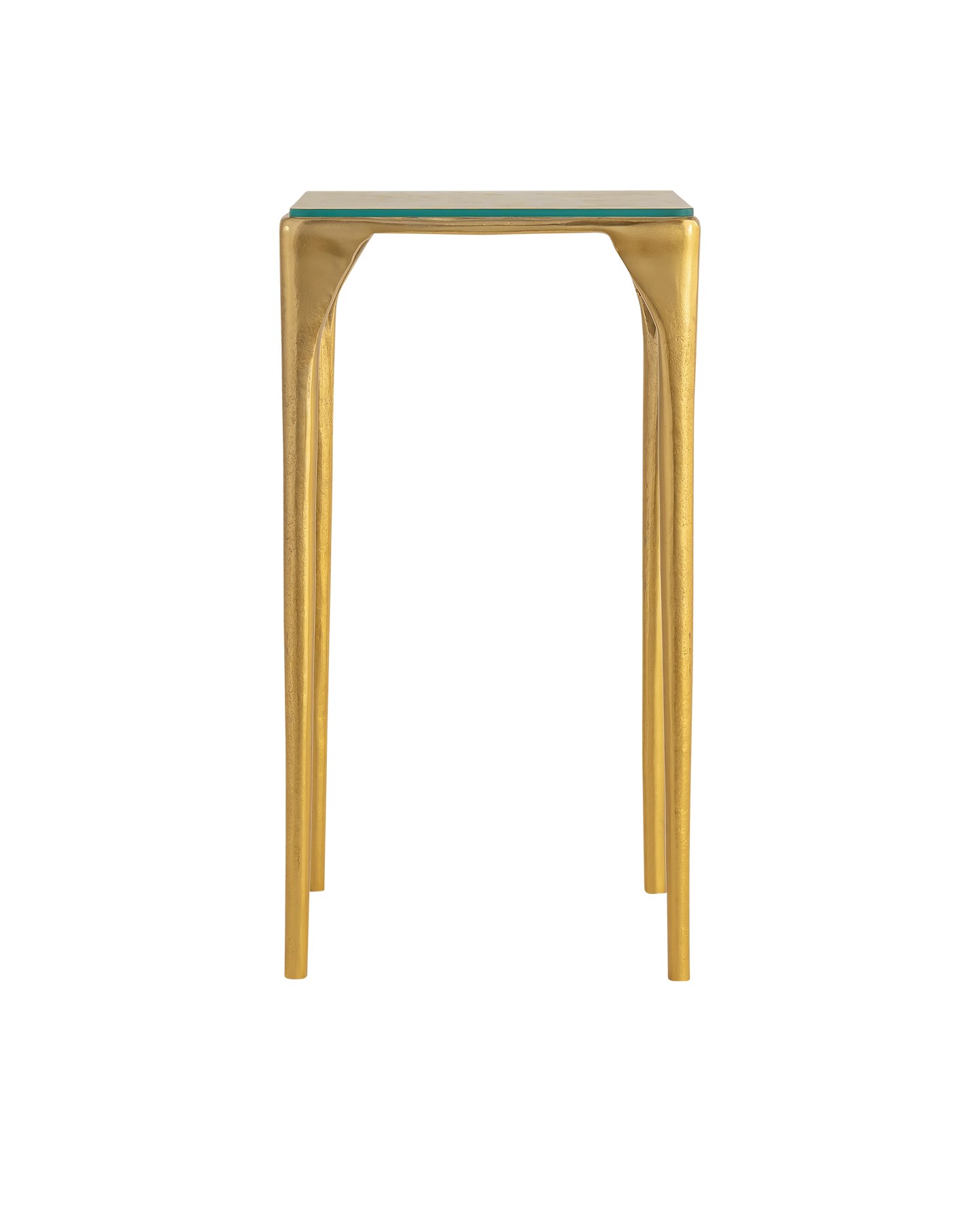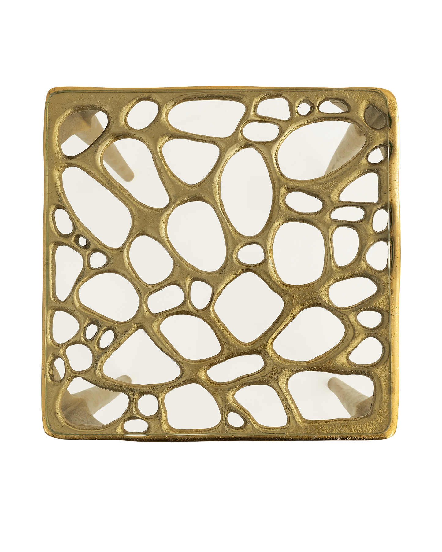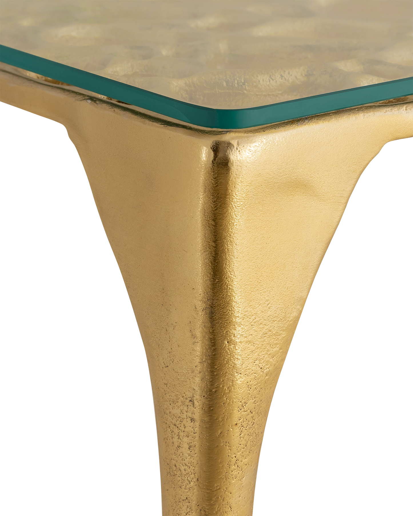The Honeycomb Drinks Table is a dainty table with a strong profile, as the tapering legs that thicken as they rise toward the top are made of cast aluminum. The glass top these surround has a honeycomb-like pattern swirling around it, thus the name. The Honeycomb is in the Marjorie Skouras Collection.