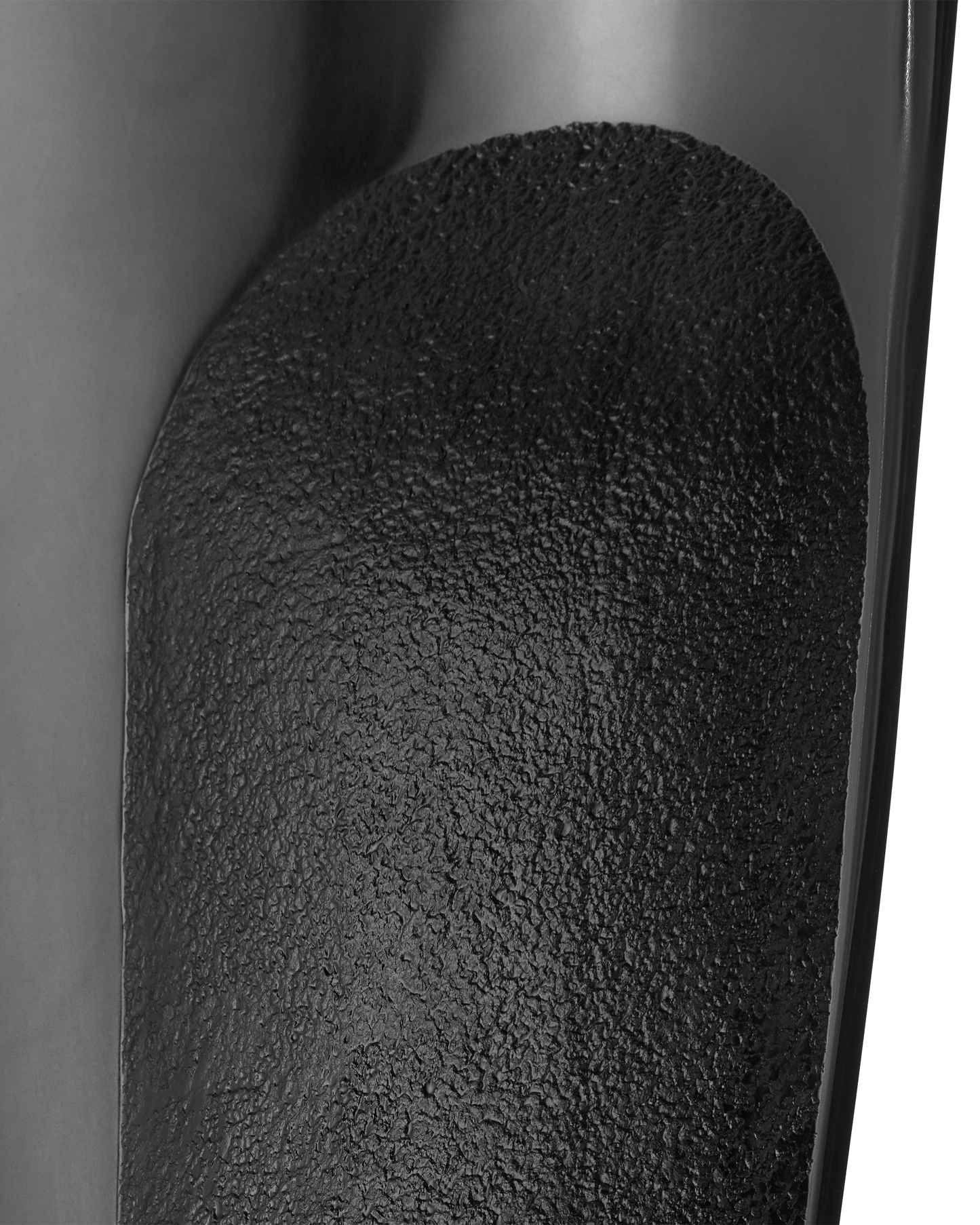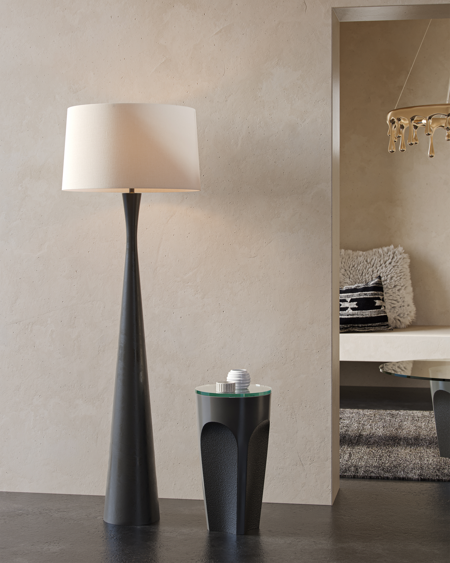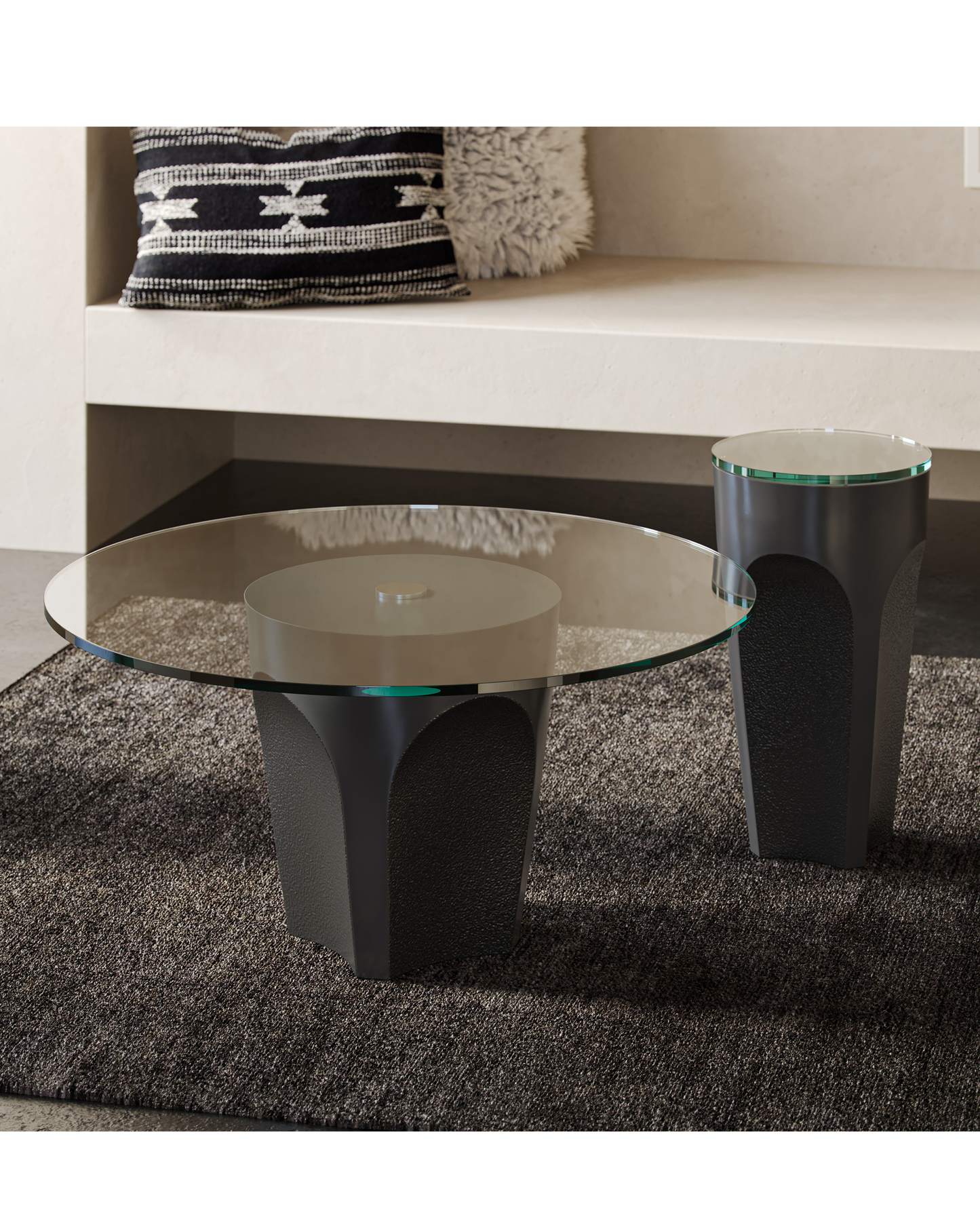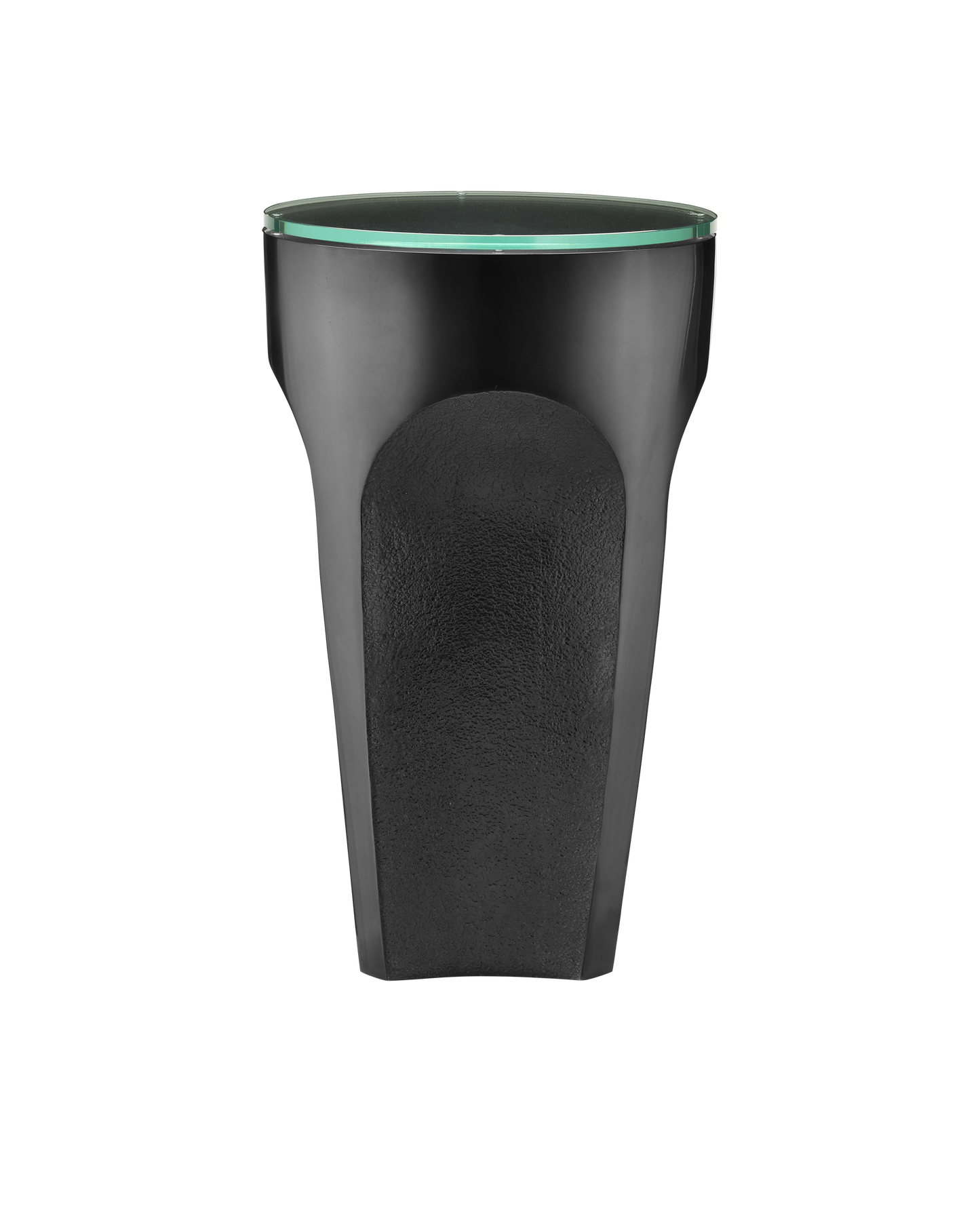 The Lemy Black Drinks Table is a mix master of shapes and textures. Made of stainless steel in a black finish, the drinks table has textural indentions that look as if they have been carved out of the metal. The contemporary piece is topped with a tempered glass top.