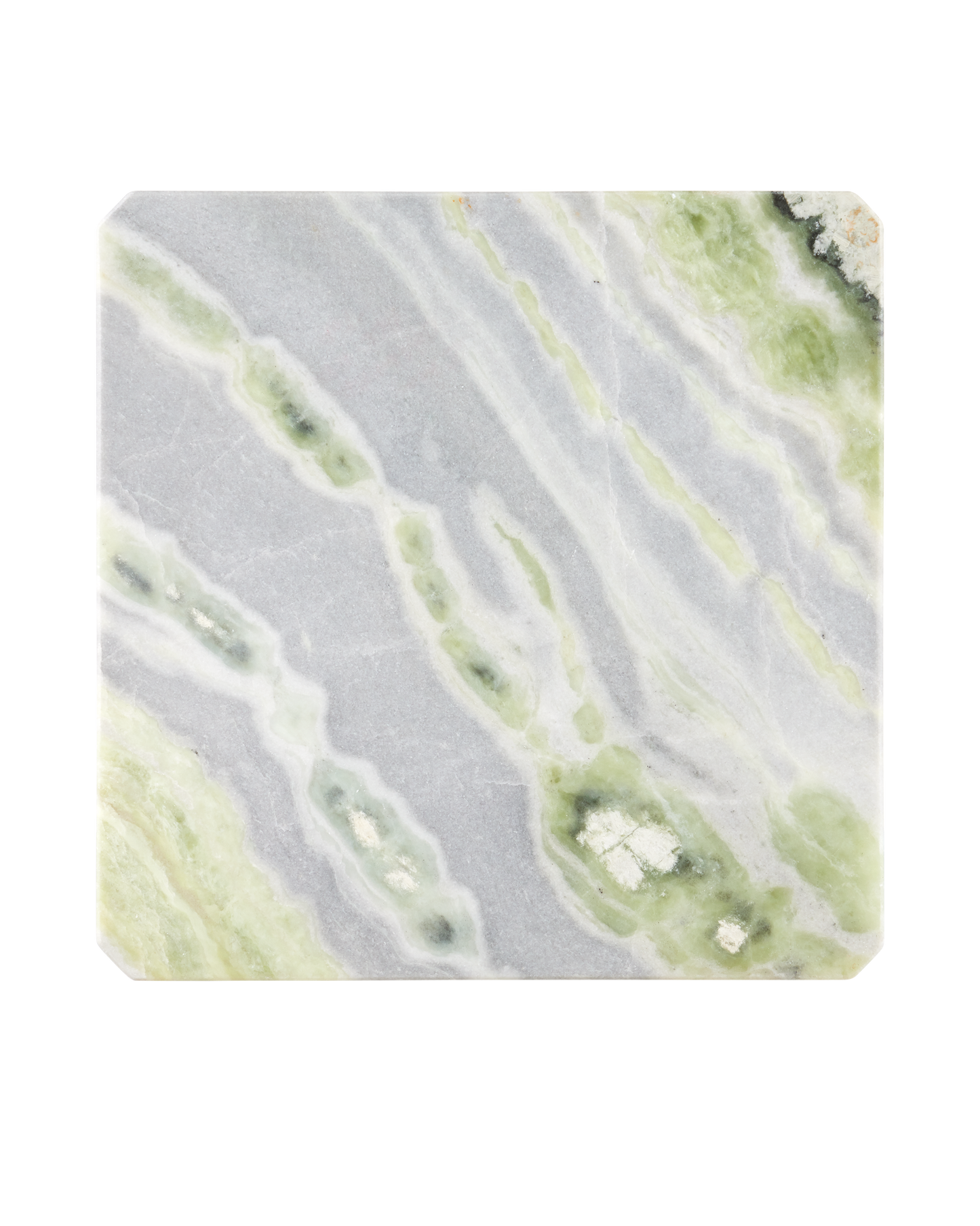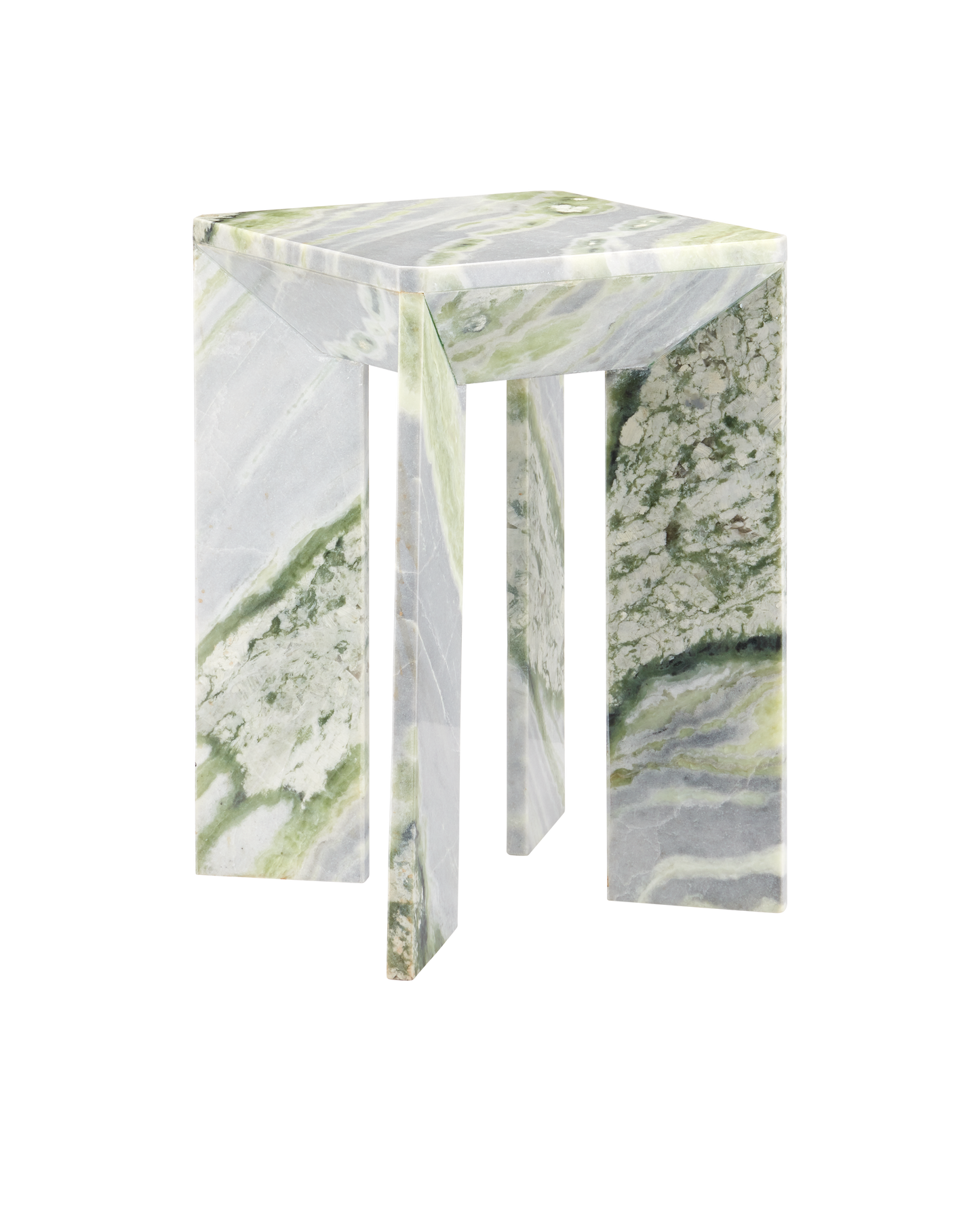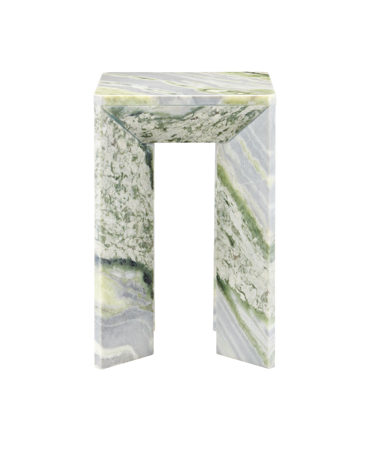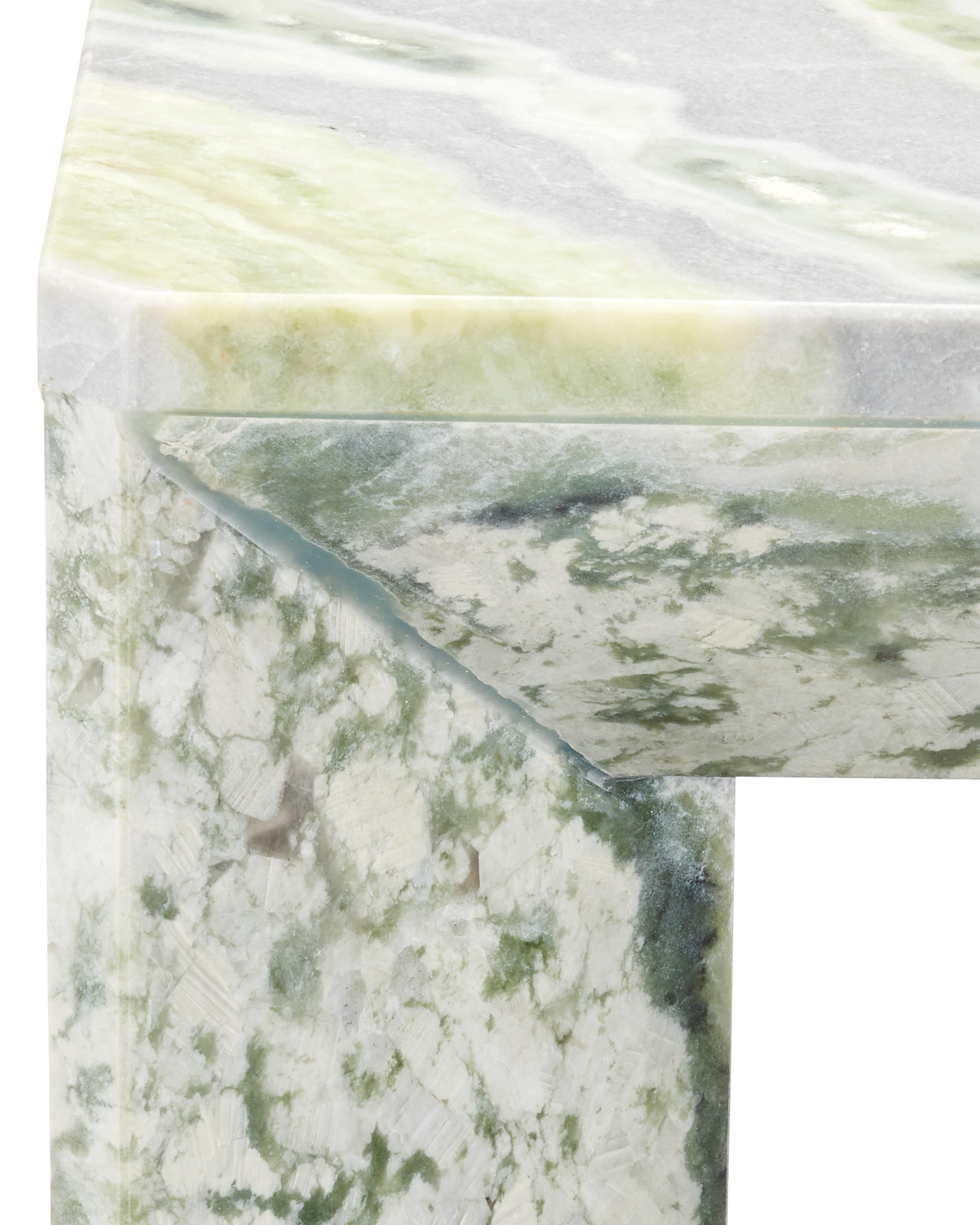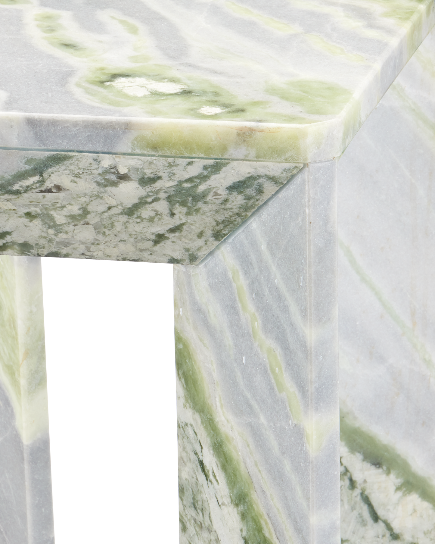 The Minerale Green Onyx Accent Table exhibits natural beauty and refined craftsmanship. Made from richly patterned green onyx, striking veins of green, gray, and beige flow along its surfaces to make each table unique. The square table has an angular design with a chamfered top that descends into a well-defined apron, a receding quality that is mirrored by its legs. At 21 inches tall, the marble table will add significant texture to its spot in a room.