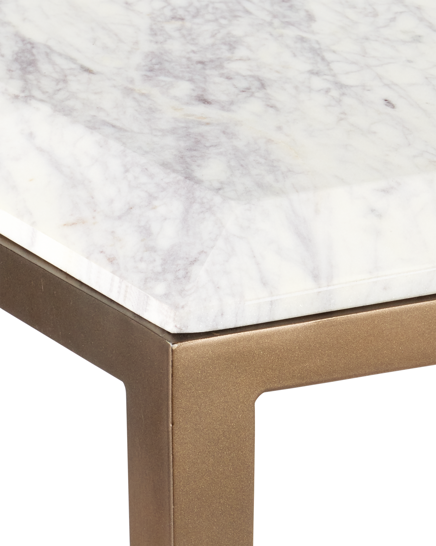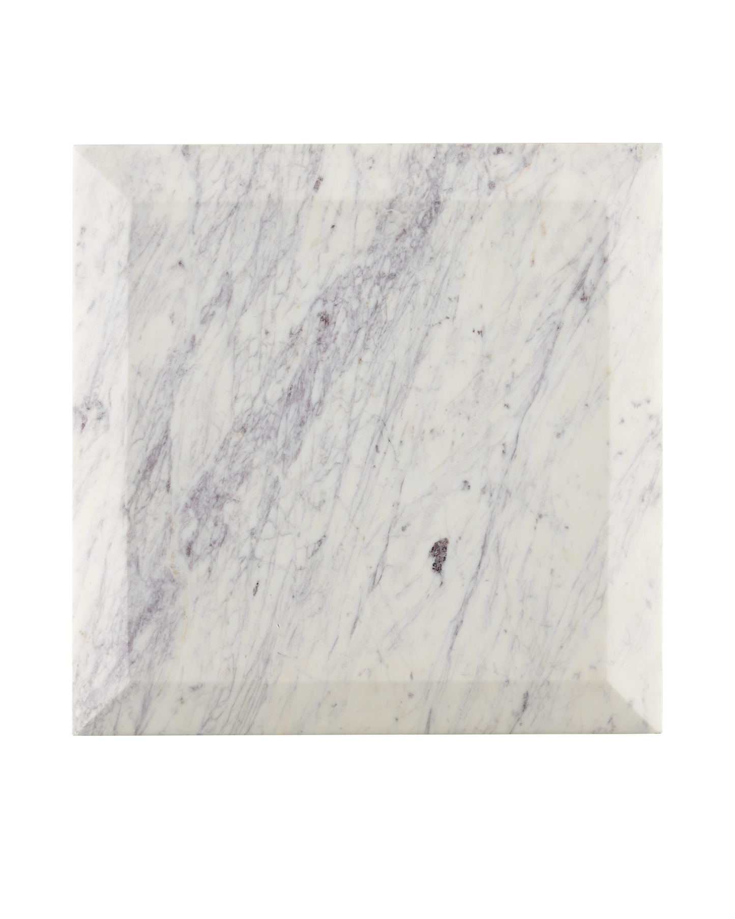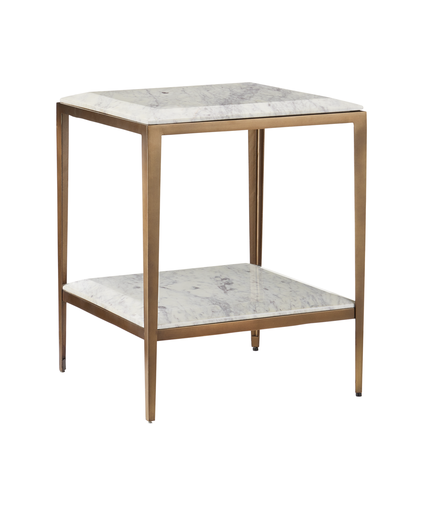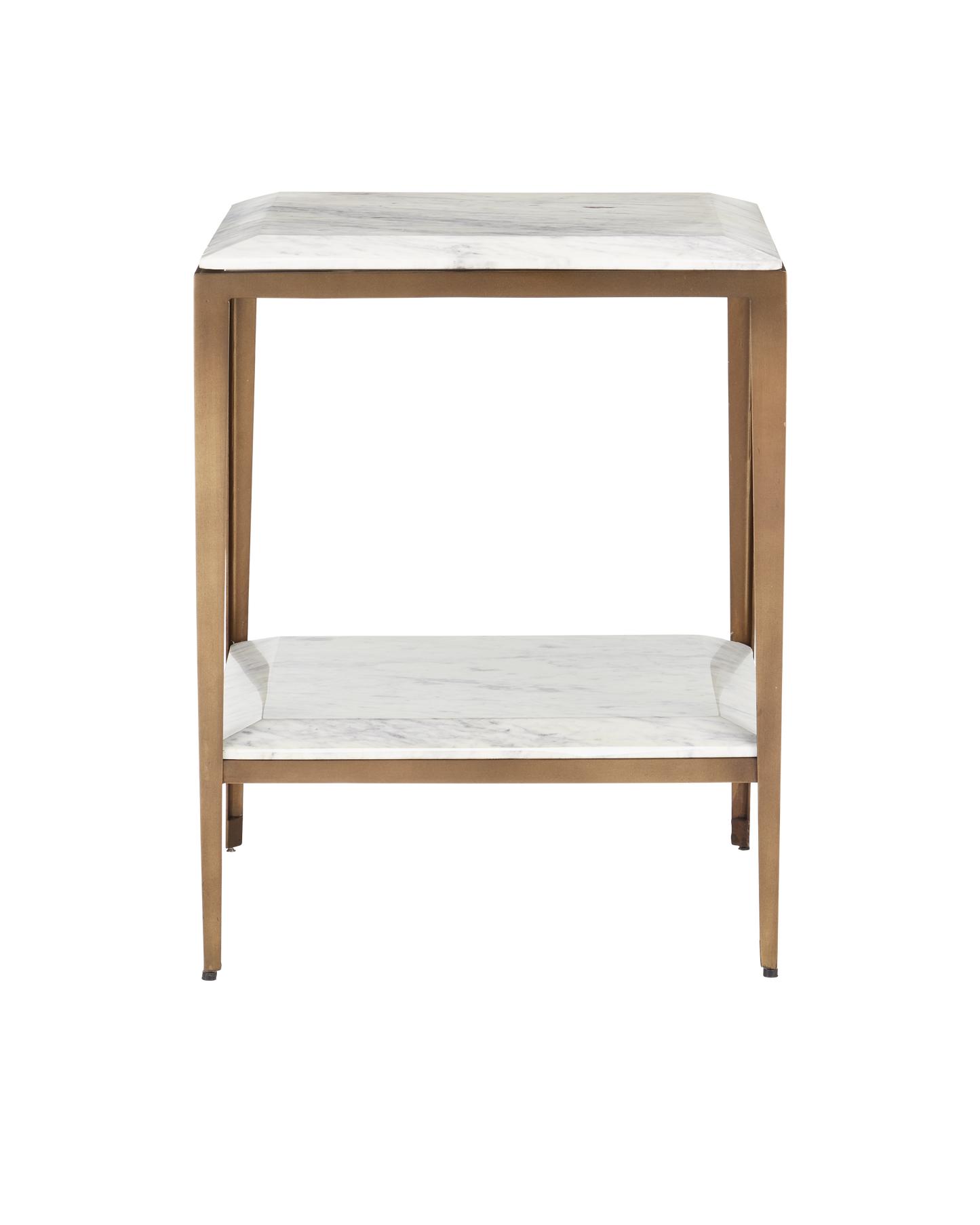 The Oblique Marble Side Table is a refined statement piece that combines masterful metalwork with luxurious stone. Its tapered legs and intersecting frames in an antique brass finish hold the chamfered top and lower shelf, each of which is made of exquisite white lilac marble and sit slightly elevated above the frame. This creates a striking floating effect. The marbles subtle veining adds a touch of natural elegance and will vary from piece to piece.