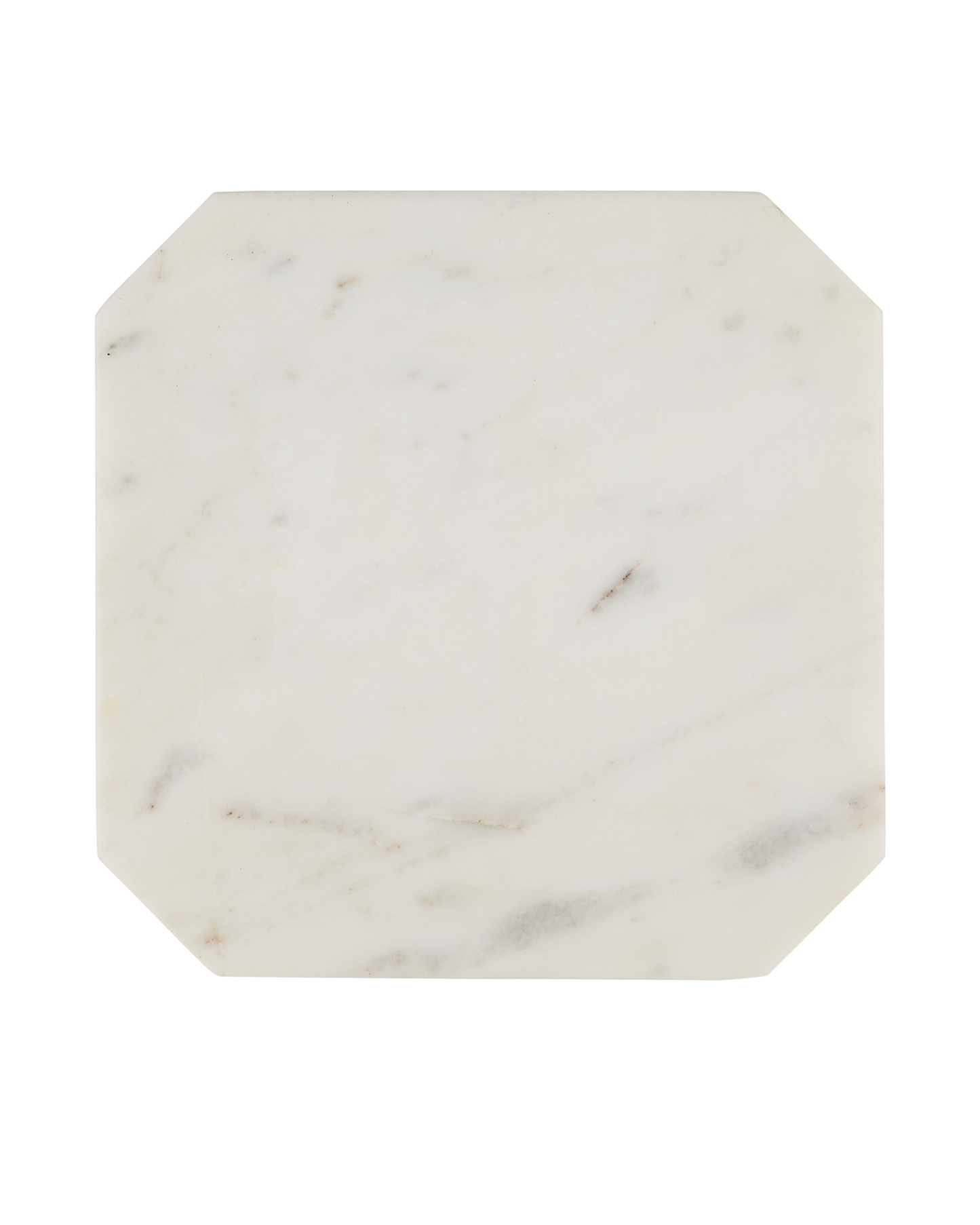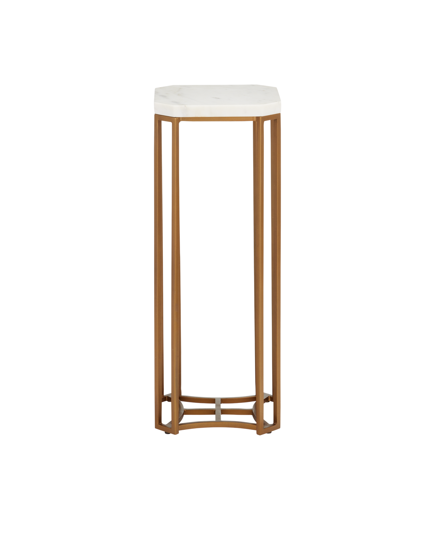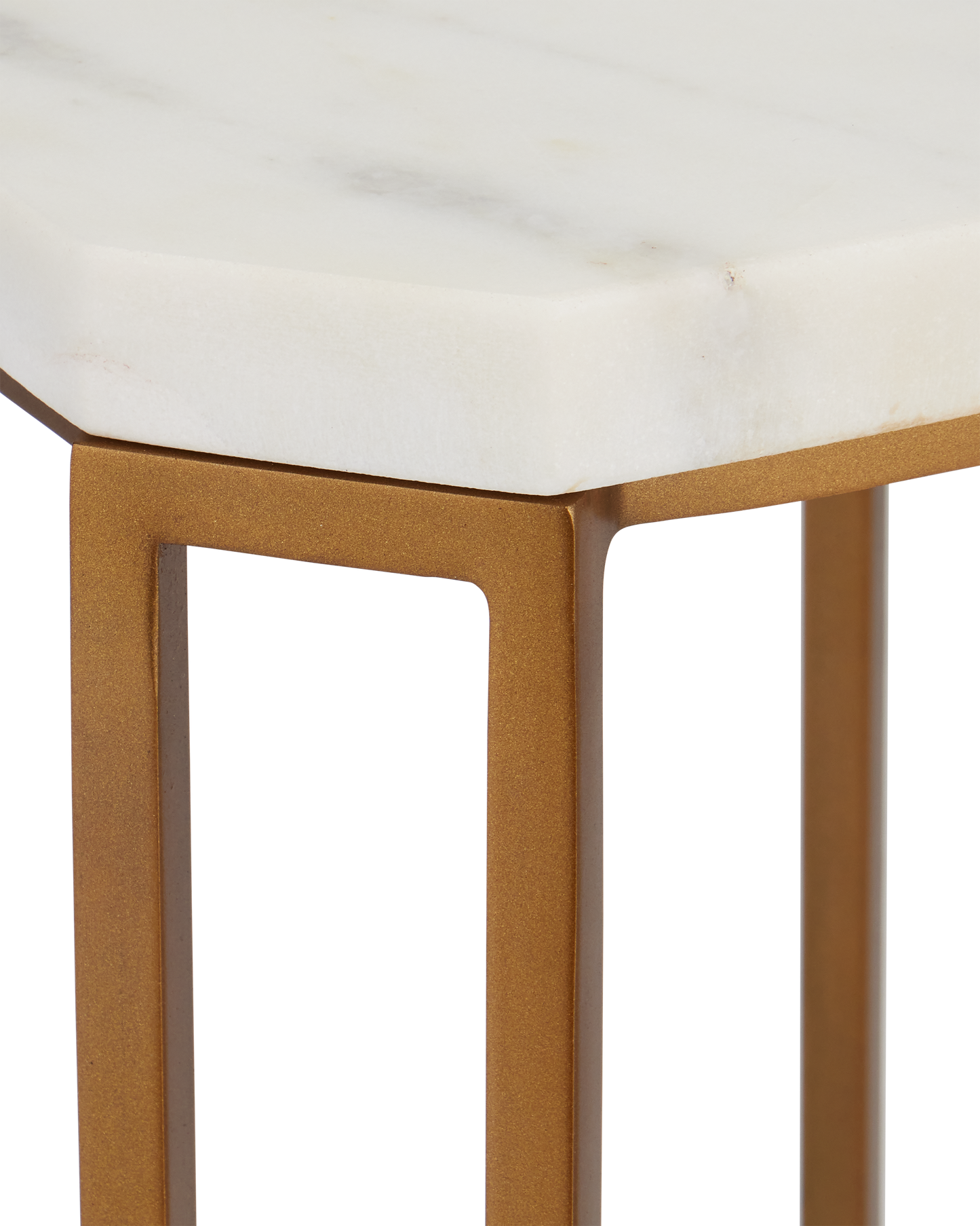 The Ocho Marble Drinks Table has a square top with rounded corners crafted from luxurious Banswara white marble. The top is supported by an iron frame in an antique brass finish, which rises gracefully from a cross-shaped base at the floor. The frame is composed of tall, rectangular shapes that add a geometric complexity to the open design. This is a petite piece that is ideal for rooms where space is limited.