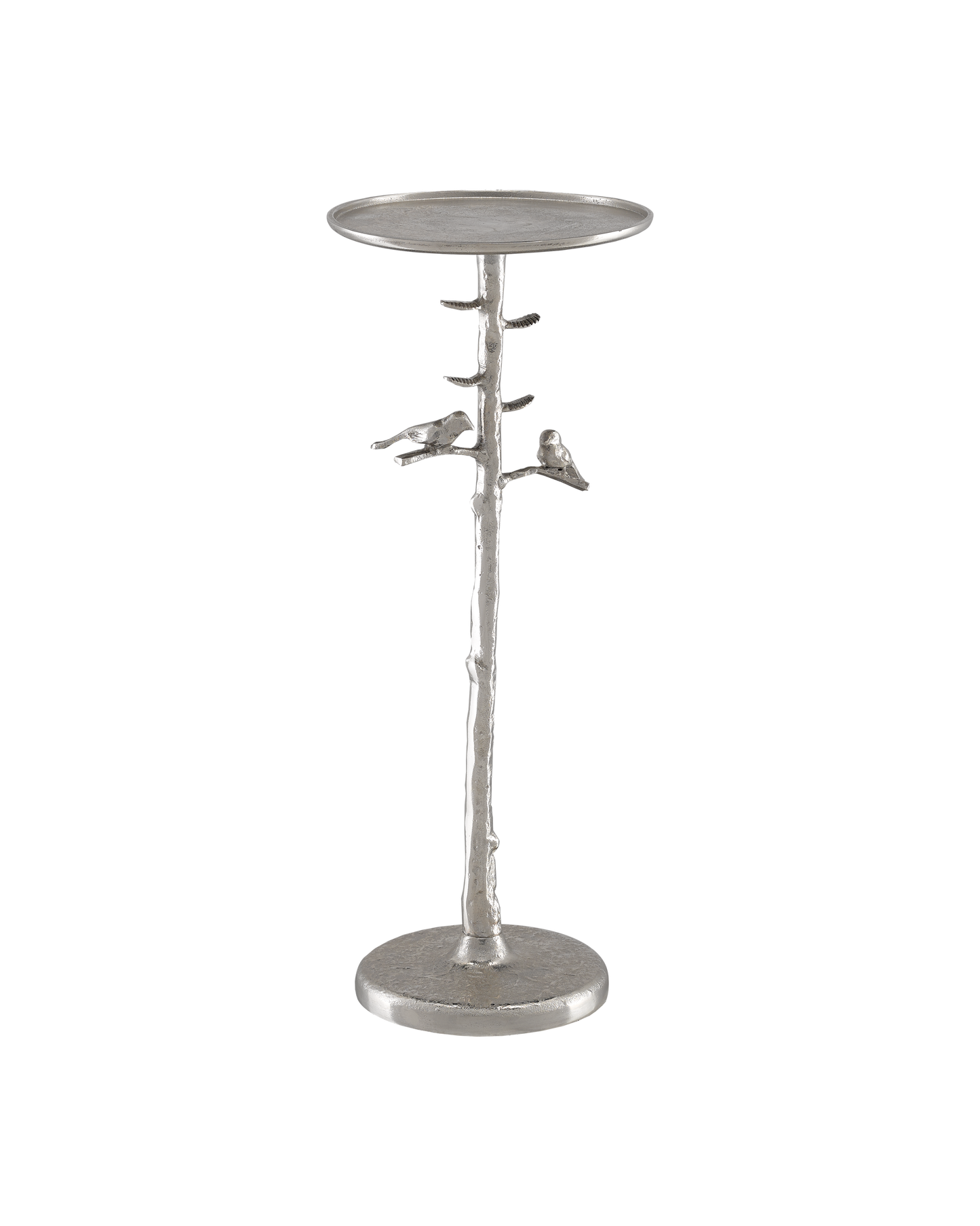 The Piaf Silver Drinks Table is a cast aluminum accent table in a luminous polished nickel finish that will make it gleam from its spot in a room. The whimsical design has two birds perched on twigs extending from a branch-like stem that holds its top.