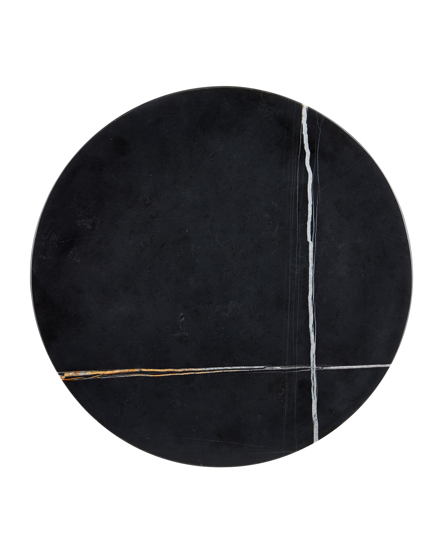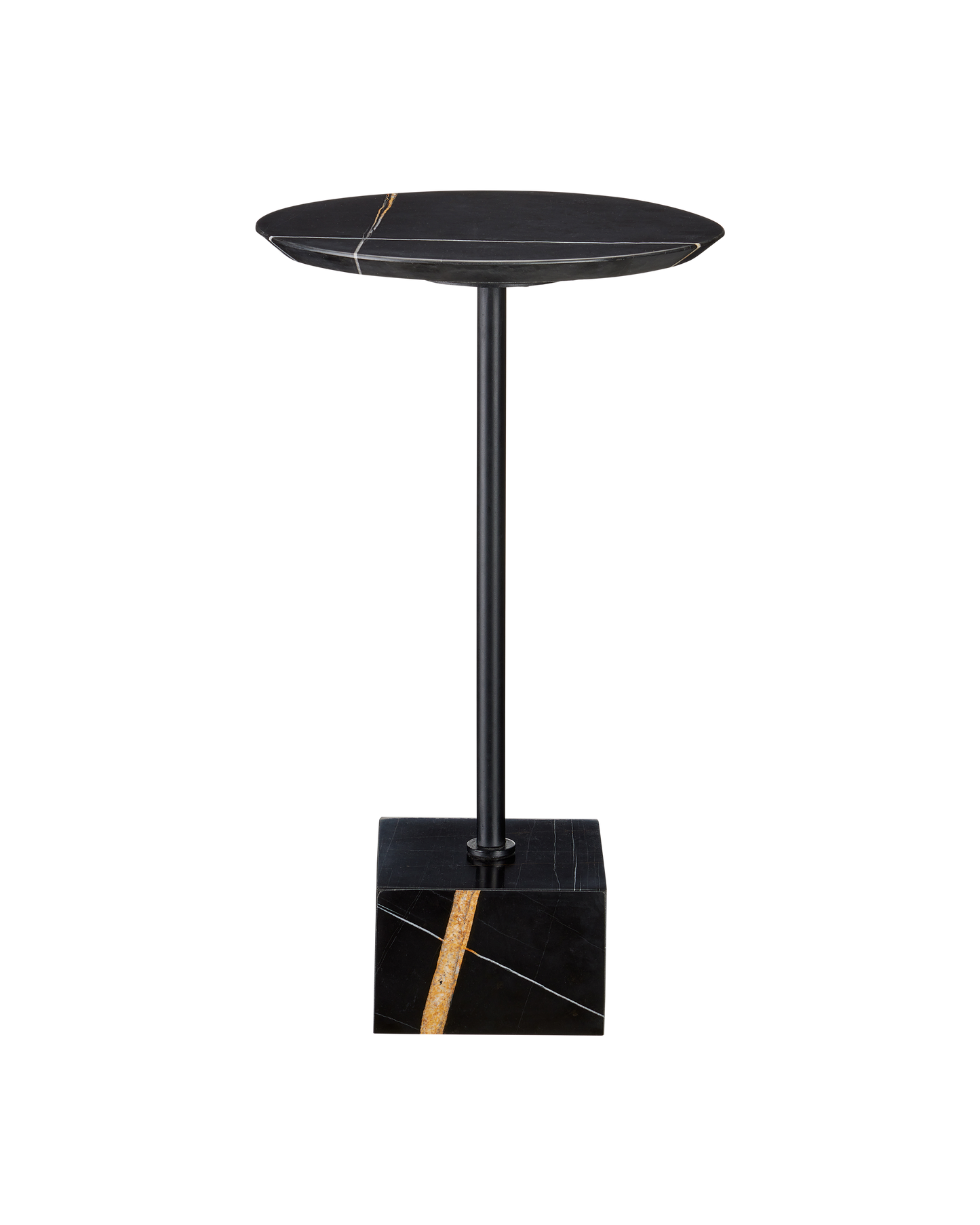 A true masterpiece of Mother Nature's doing, the Prado Drinks Table gleans its personality from the Nero Saint Laurent marble, imported from Italy, that forms its base and top. The striations of color on the blocky piece and the round disc, connected by a metal stem in a black finish, are artfully beautiful.