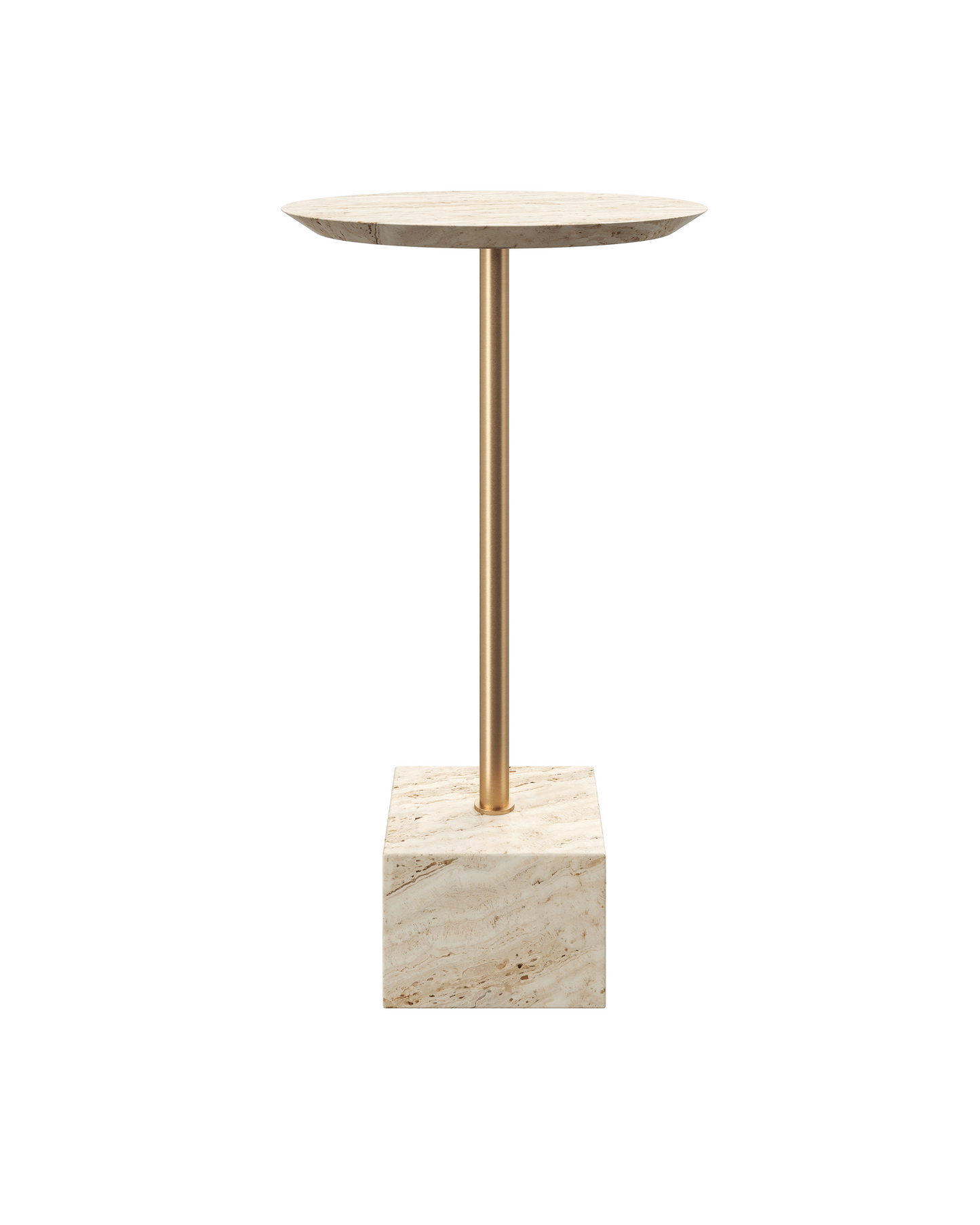 The Miles Travertine Drinks Table is made from alternating layers of bisque-colored travertine and gleaming metal in a polished brass finish. The design creates a dynamic visual rhythm as it rises from the floor in the interplay of materials and the variation of thickness and thinness. The rich brass tones enhance the darker veining in the travertine, which is a natural stone so surfaces will vary from table to table.