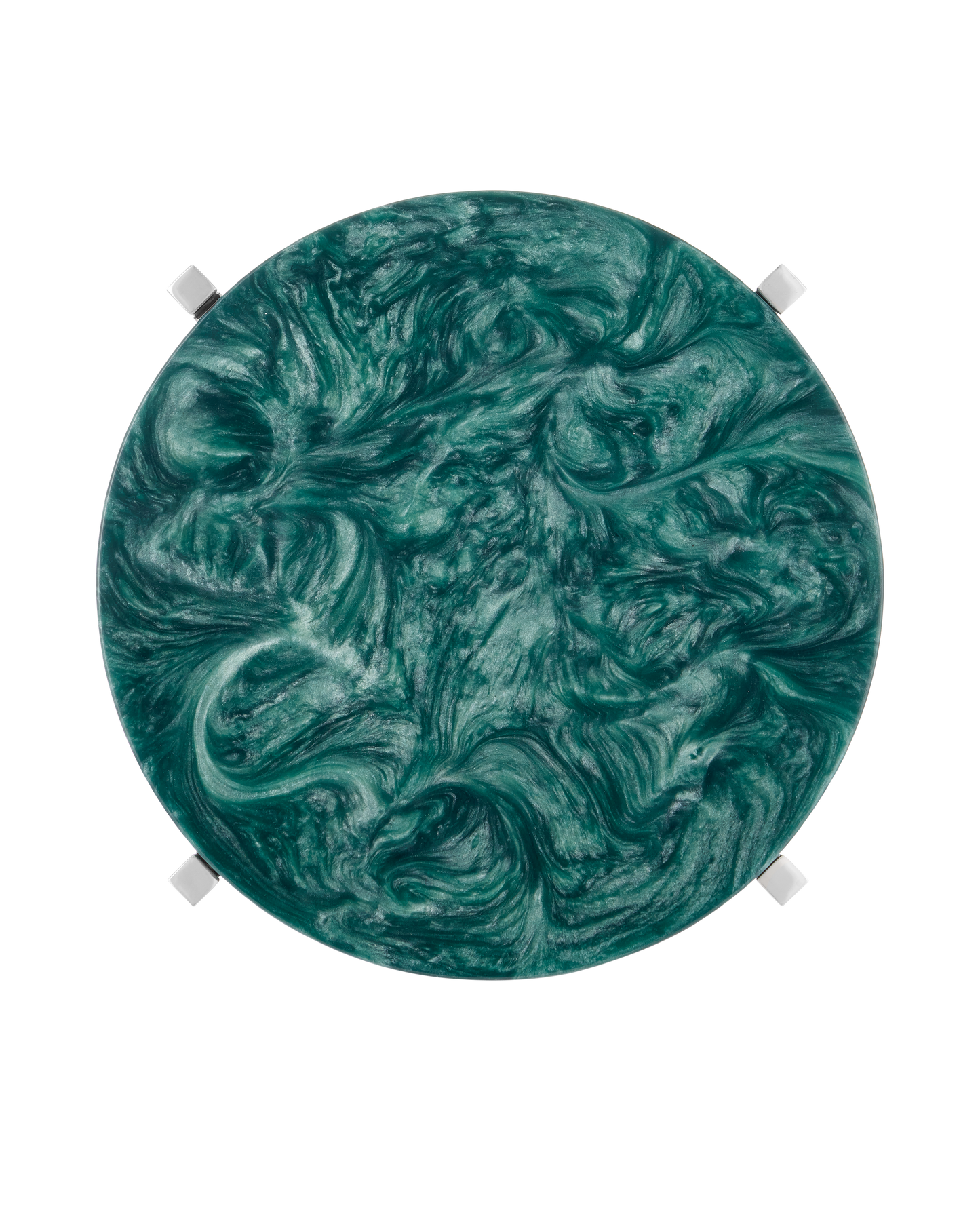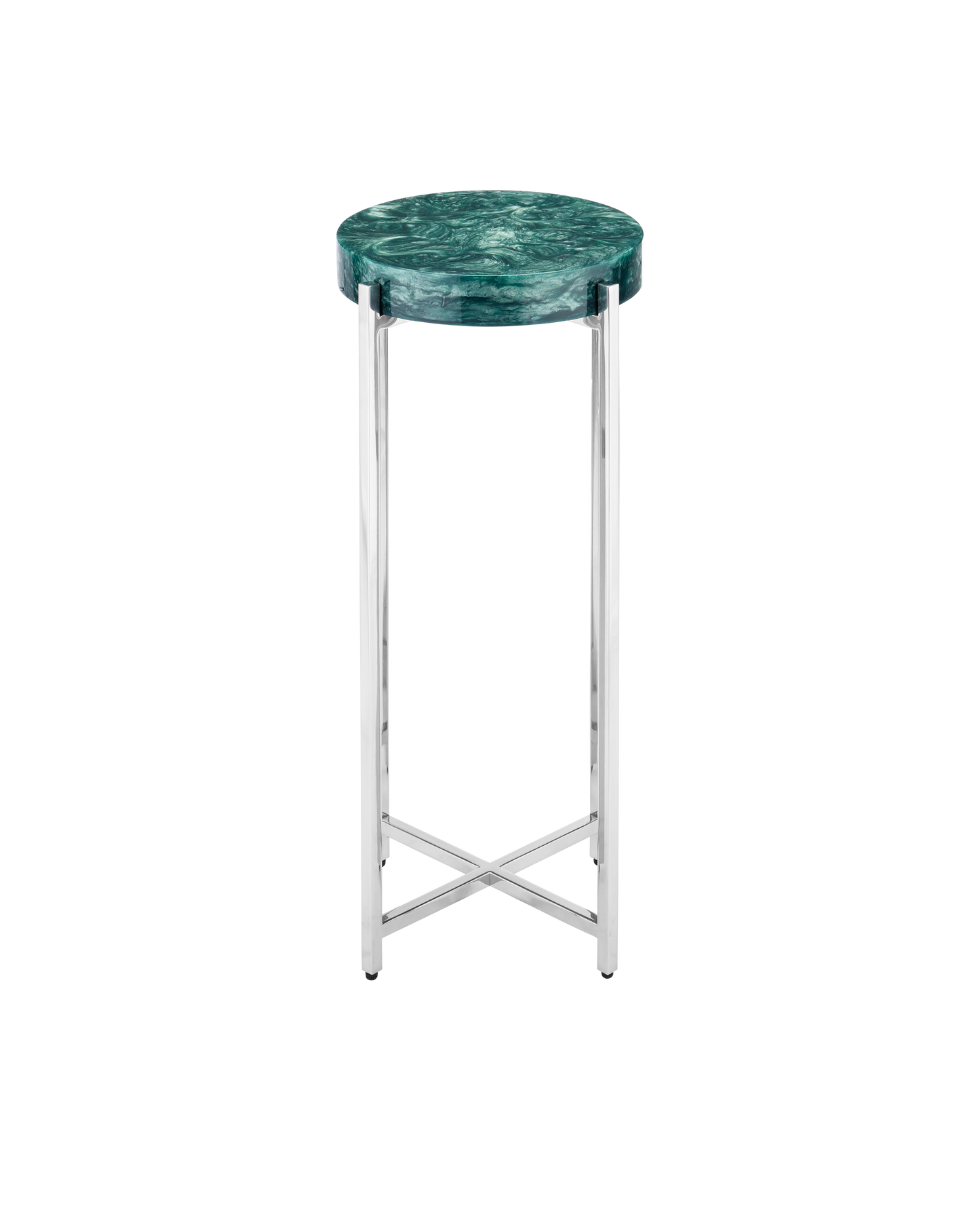 The Rina Teal Drinks Table has a top with a swirling surface created when pearlescent powder was mixed with composite to create the organic patterning. The round disc is inset into the metal frame like a gem. Four legs made of stainless steel in a polished nickel finish are connected by an ex-shaped stretcher. The silver and teal drinks table stands just over 23 inches tall and is 11 inches in diameter, which makes it ideal for rooms where space is limited.