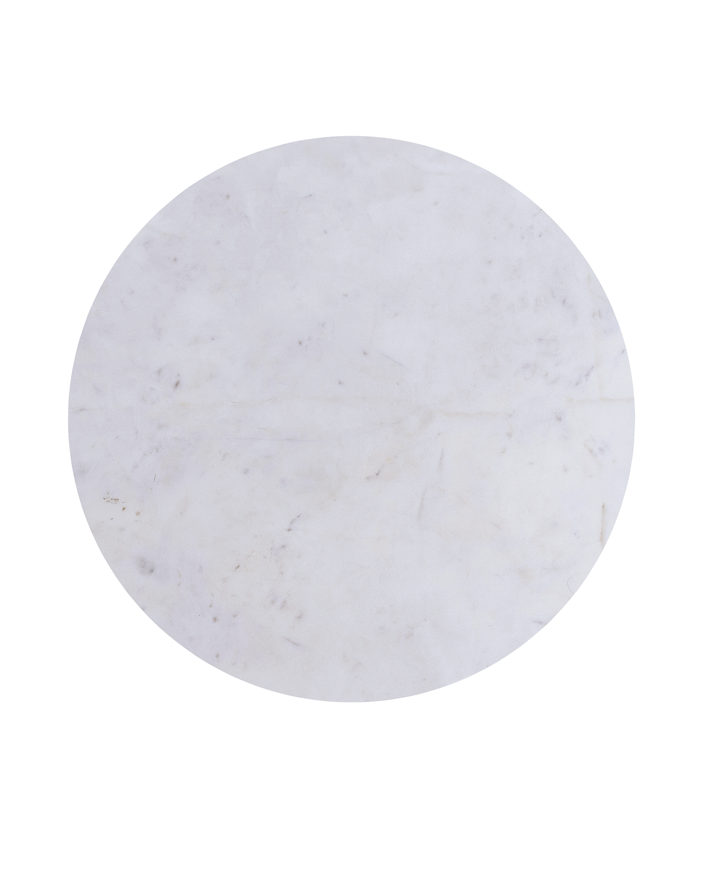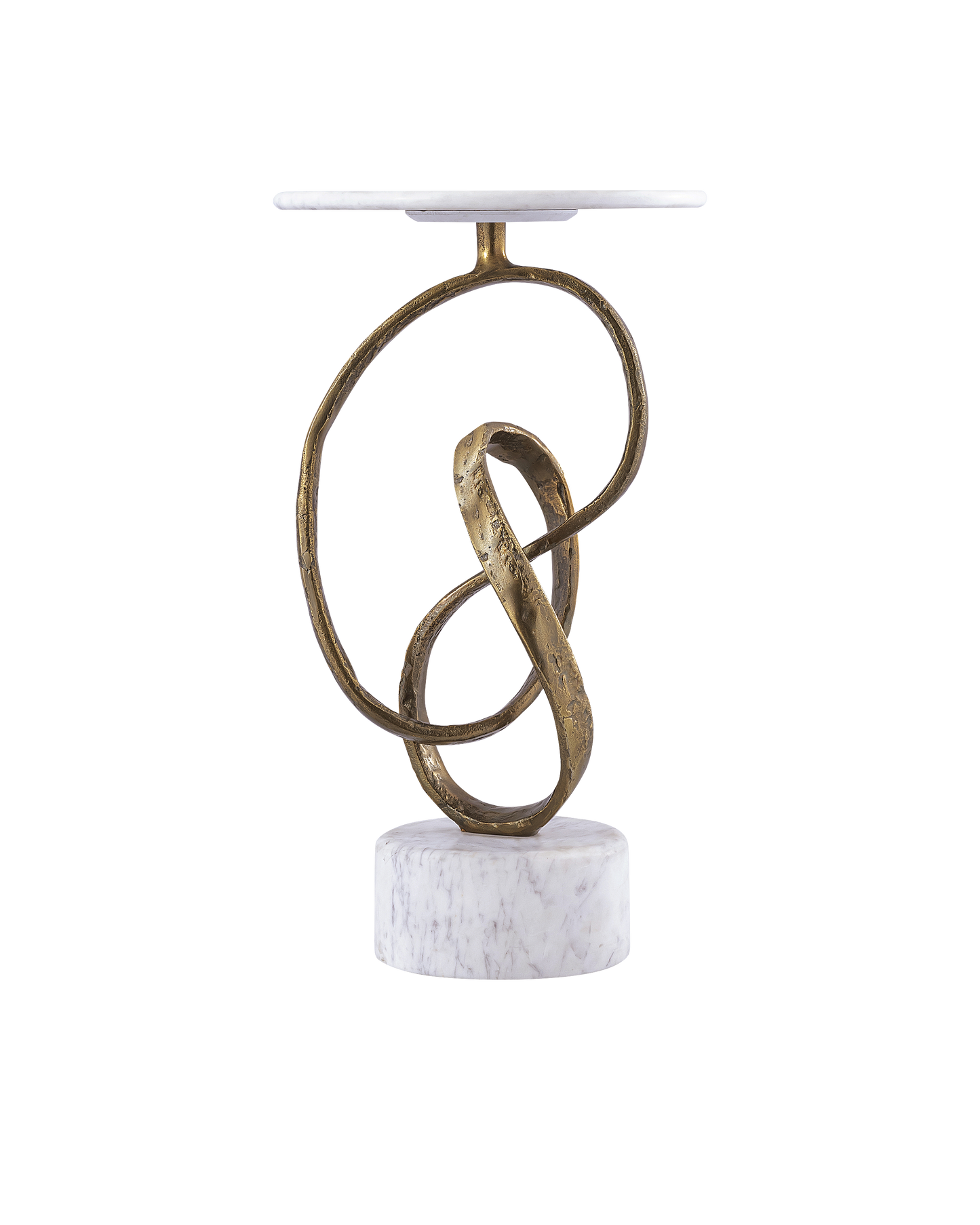 The masculine design of the Ruban Accent Table has a number of special attributes that include the rough luxe feel of the curling metal ribbon, and the contrasting white marble base and top. The ribbon, which is made of cast aluminum in an antique brass finish, rises from the stone base to hold the thin white top in place. The natural veining in the stone will make each piece unique.