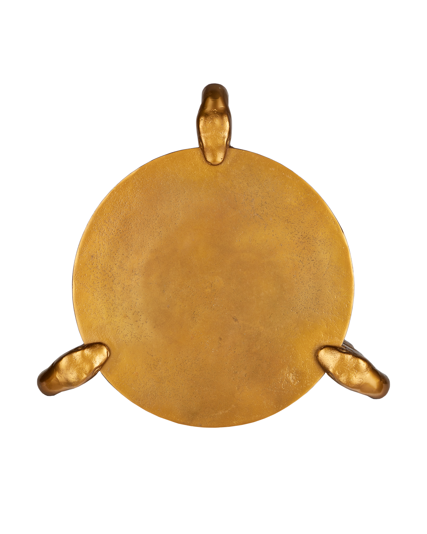 Supporting the disc top of the Serpent Brass Accent Table are curvy creatures that pull a balancing act as they clamp down on its thin surface. This is a whimsical aspect of this design. Made of cast aluminum in an antique brass finish, the gleaming gold occasional table will certainly be a conversation starter in any space, as it will command attention when the luminous surfaces glow when light touches them. Illustrating the artisanal aspects of cast aluminum, there are drifts of patina throughout the profile.