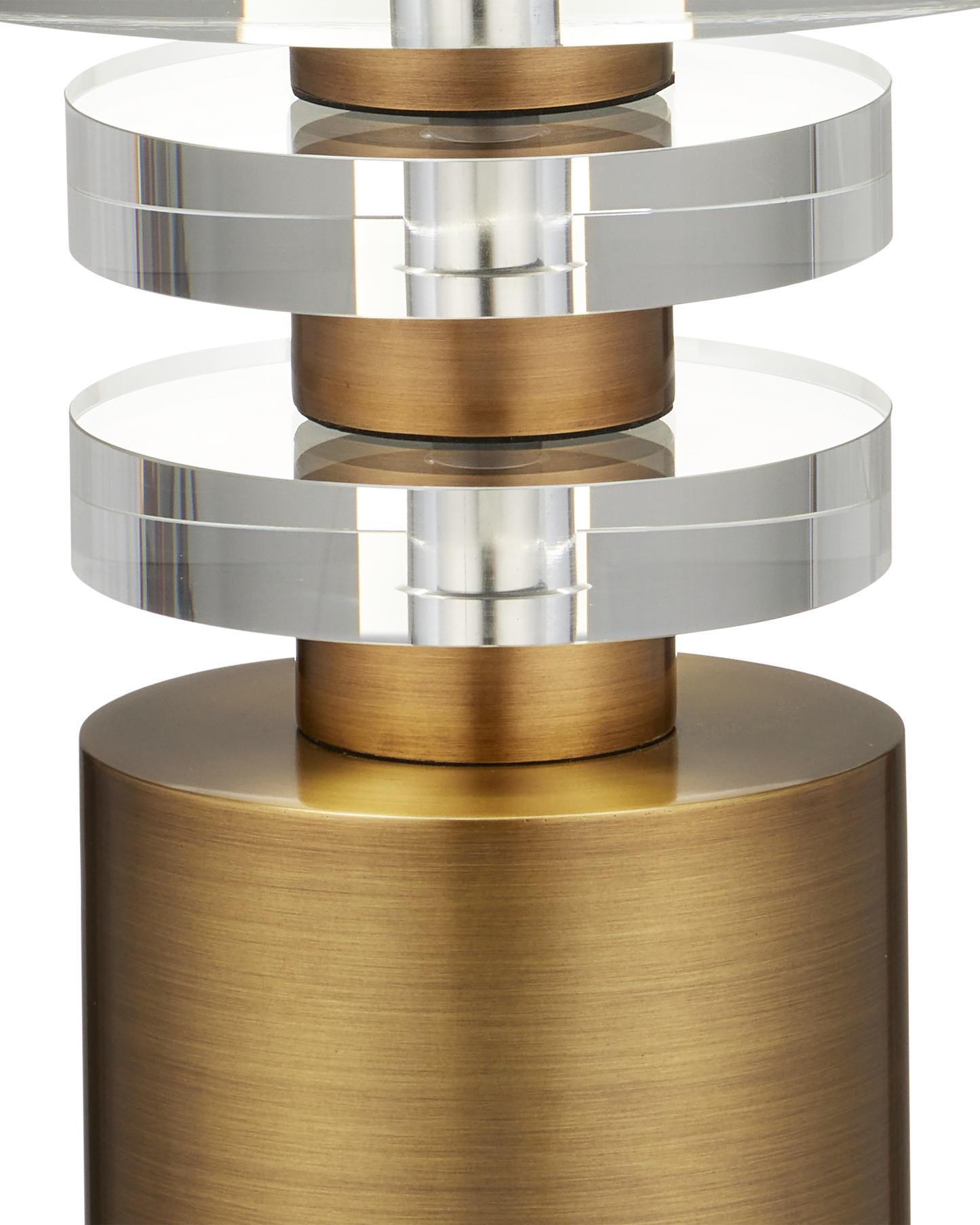 The Shani Brass Drinks Table is made of metal in an antique brass finish and discs of clear optic crystal. The profile of this gold drinks table makes it an excellent choice for mid-century modern interiors, and it will be particularly perfect for rooms that could use pops of bright gold. The cap that fastens the top of this columnar drinks table to its pedestal elegantly rises above the surface, adding a unique and distinctive touch to its clean design.