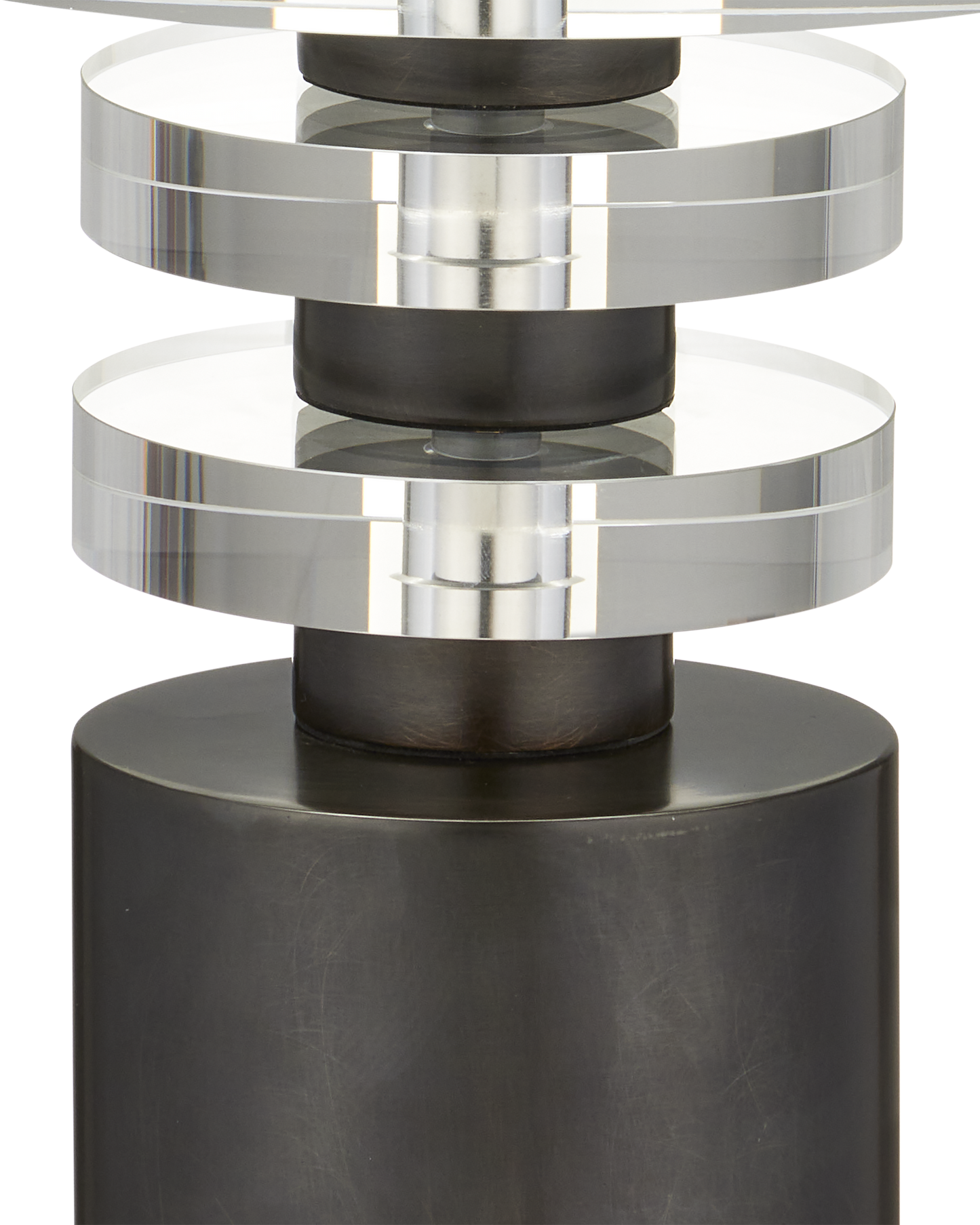 The Shani Bronze Drinks Table is made of bronze-finished metal and discs of clear optic crystal. The profile of this black drinks table makes it an excellent choice for mid-century modern interiors, and it will be particularly perfect for rooms that could use a pop of black. The cap that fastens the top of this columnar drinks table to its pedestal elegantly rises above the surface, adding a unique and distinctive touch to its clean design.