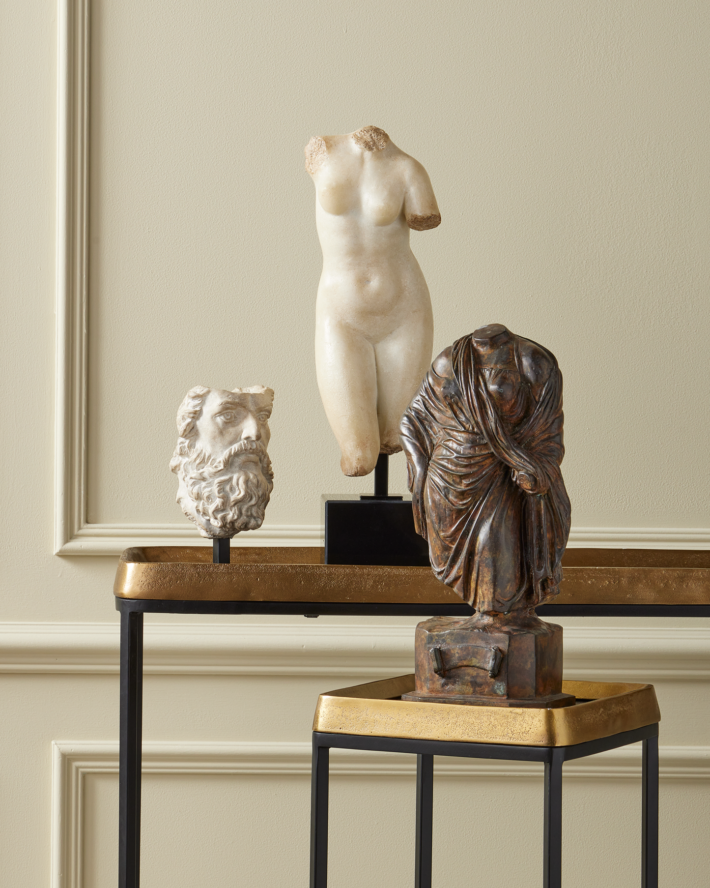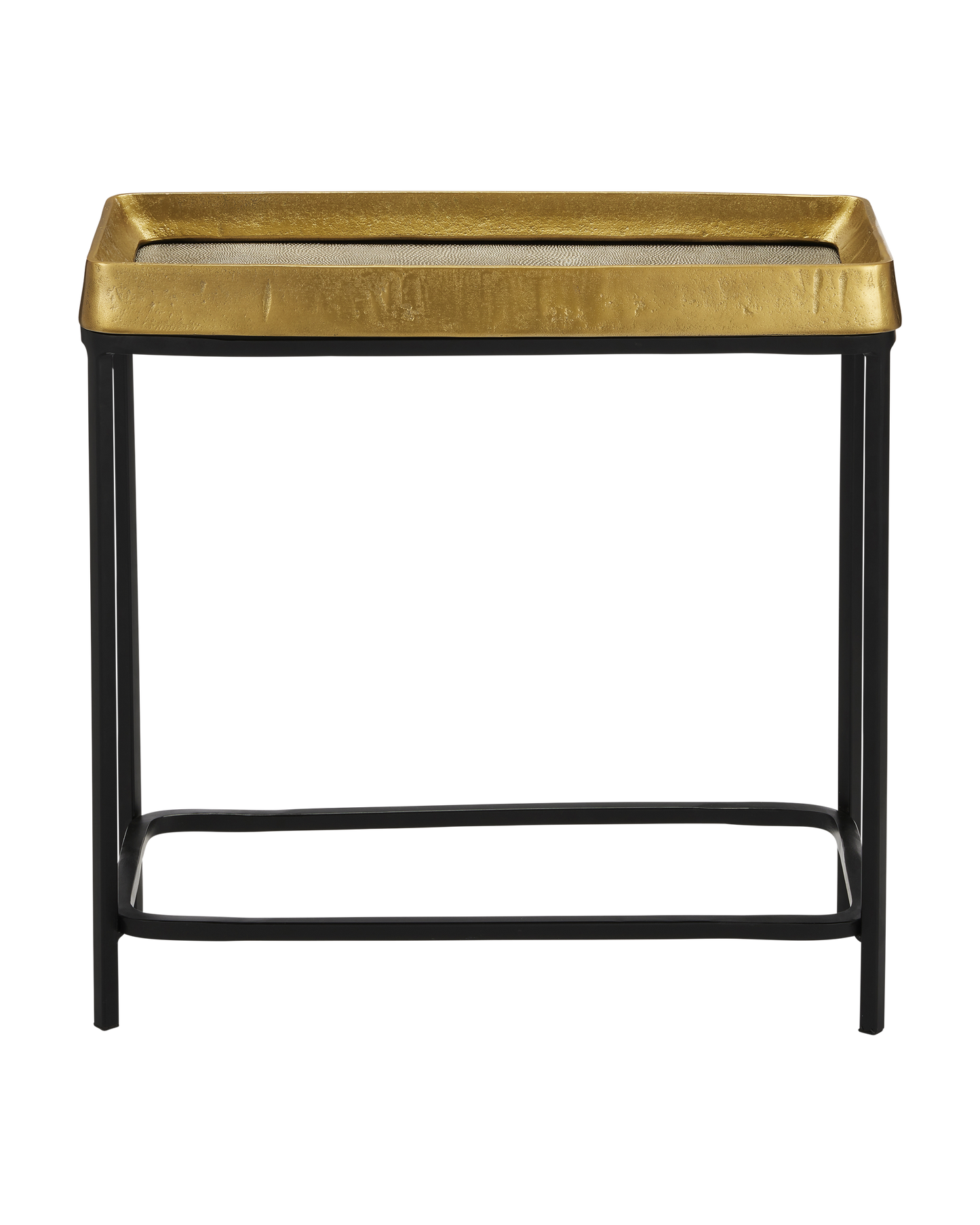 The Tanay Brass Side Table is not shy when it comes to infusing a space with an incredible mix of textures. Not only does the cast aluminum top have tell-tale pitting on the surfaces of its gleaming gold interior and exterior edge, the bottom of its tabletop is stamped in a snakeskin pattern in a graphite finish. This masterpiece of artistry sits atop a black iron base that is minimal to allow the artisanal top to be the scene-stealer.