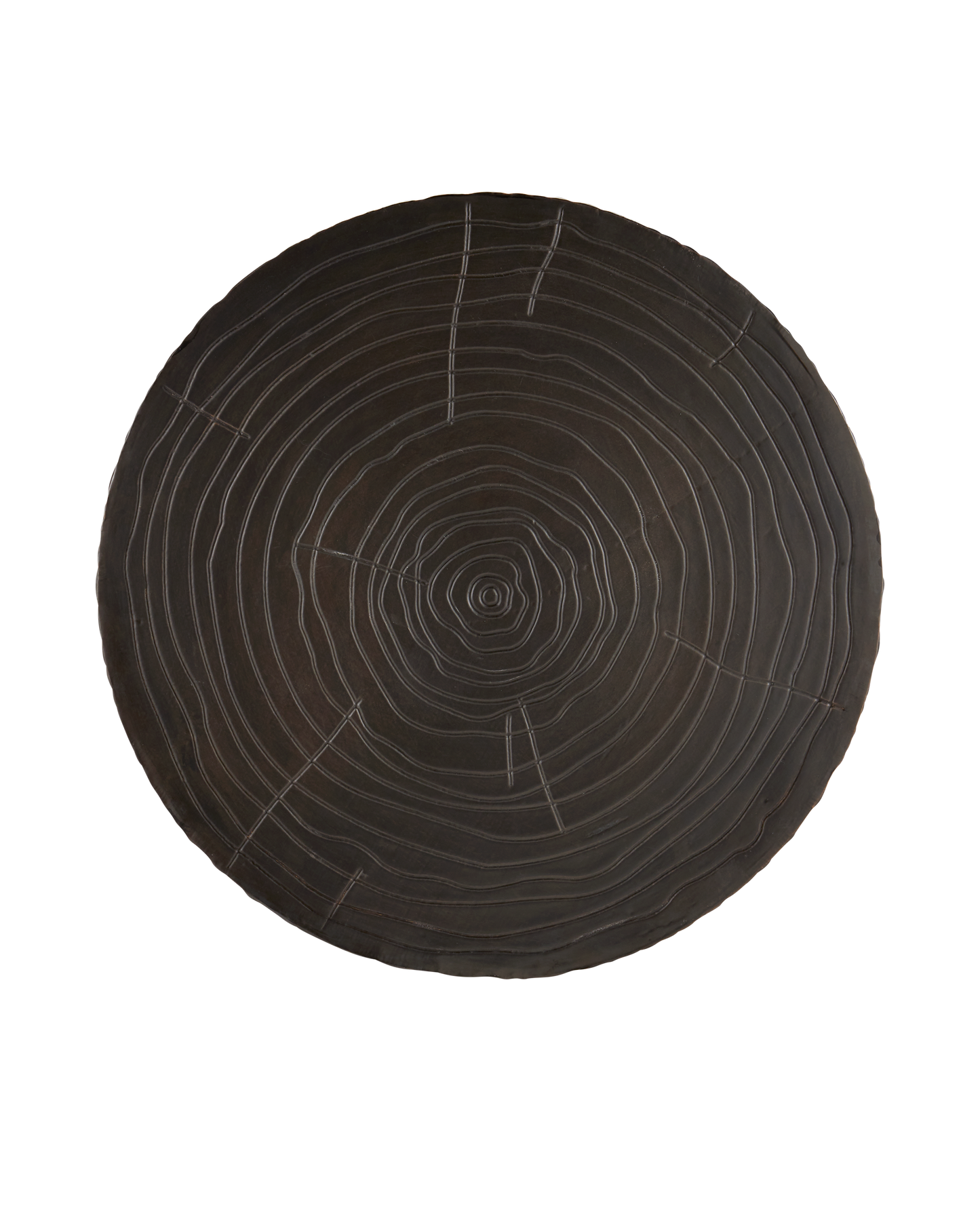 The Terra Pedestal convinces the eye that it is made entirely from natural wood, but in fact its surface is metal that has been wrapped over a hand-carved wood substrate and pushed into place to amplify a natural grain pattern. Once the dynamic ornamentation has been fully achieved, the top columnar portion is bronzed while the inset base is made of brass that has been lightly texturized. This is a truly artisanal piece.