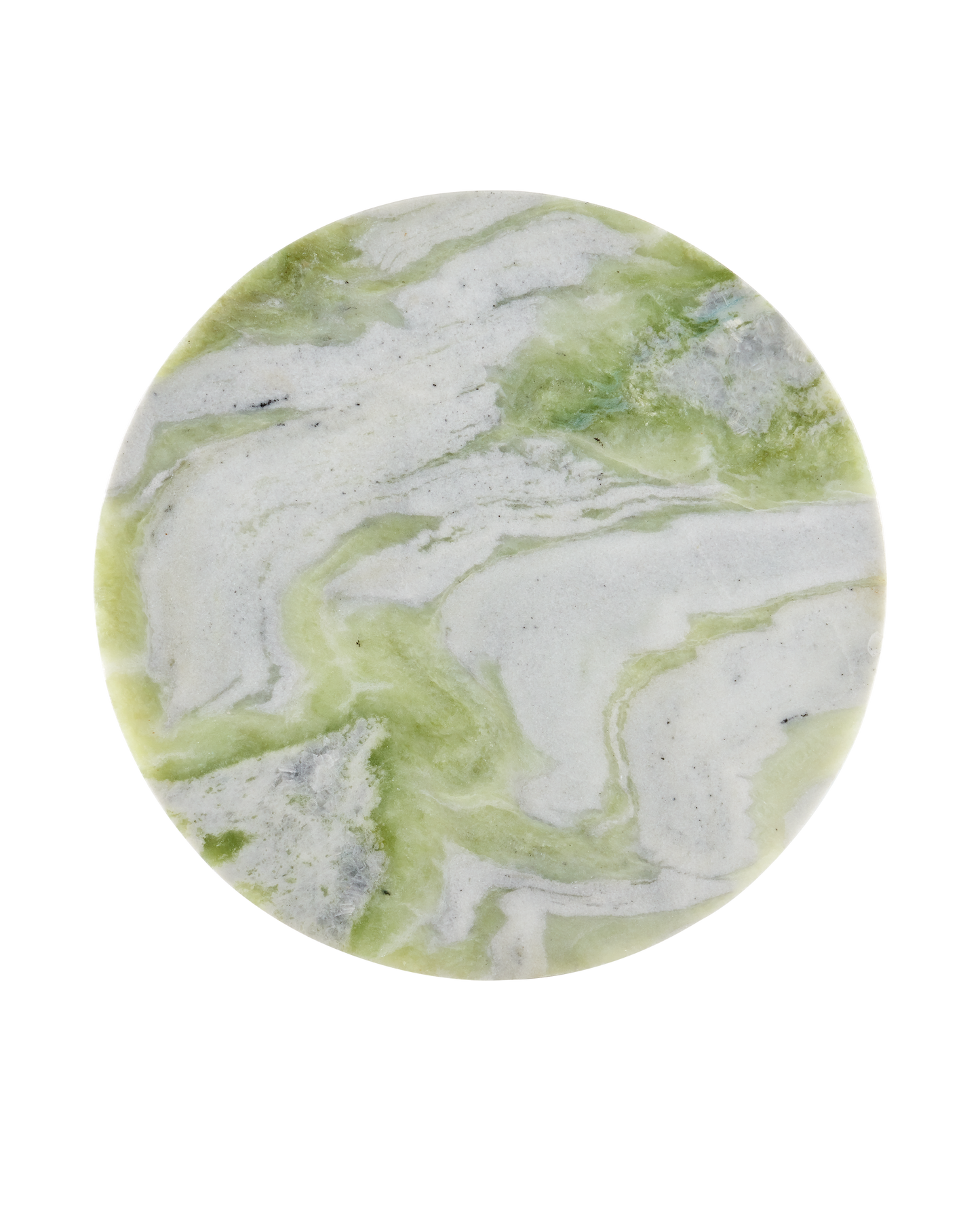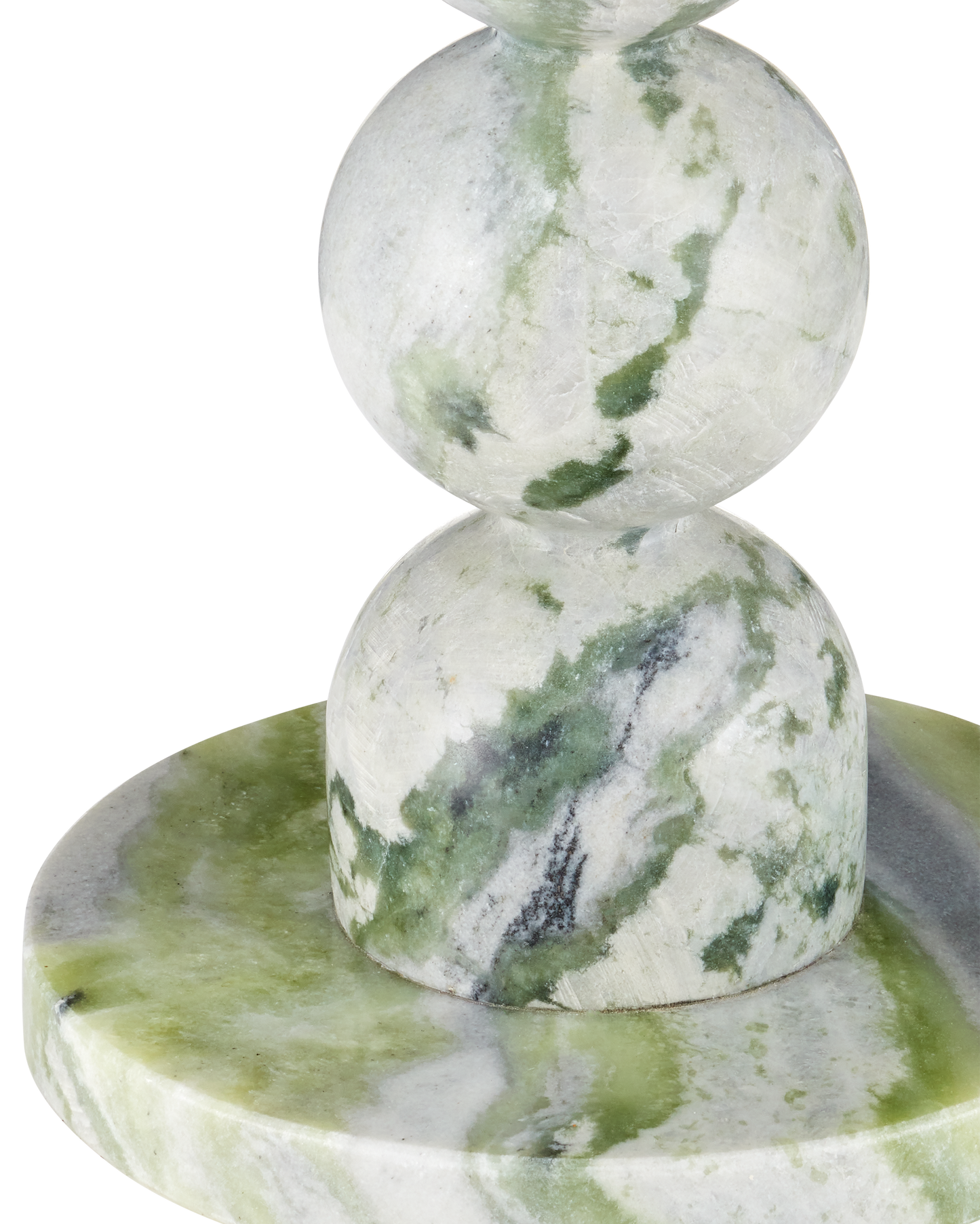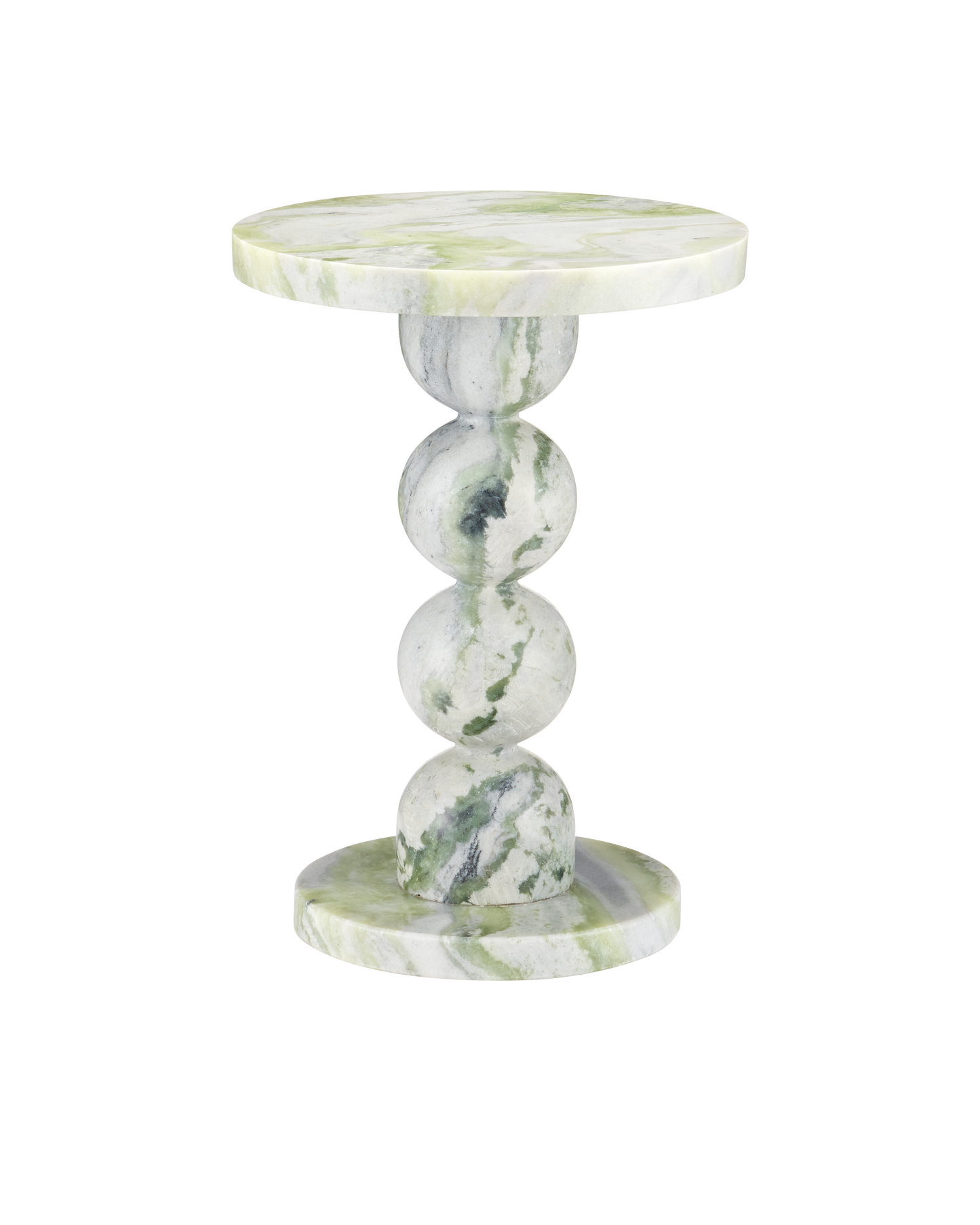 The Turner Green Onyx Accent Table exhibits natural beauty and refined craftsmanship. Made from richly patterned green onyx, striking veins of green, gray, and beige flow along its surfaces to make each table unique. The pedestal, designed to resemble stacked spheres, is actually a meticulously turned column. The table rises from a round base to a slightly larger round top, reaching nearly 20 inches tall.
