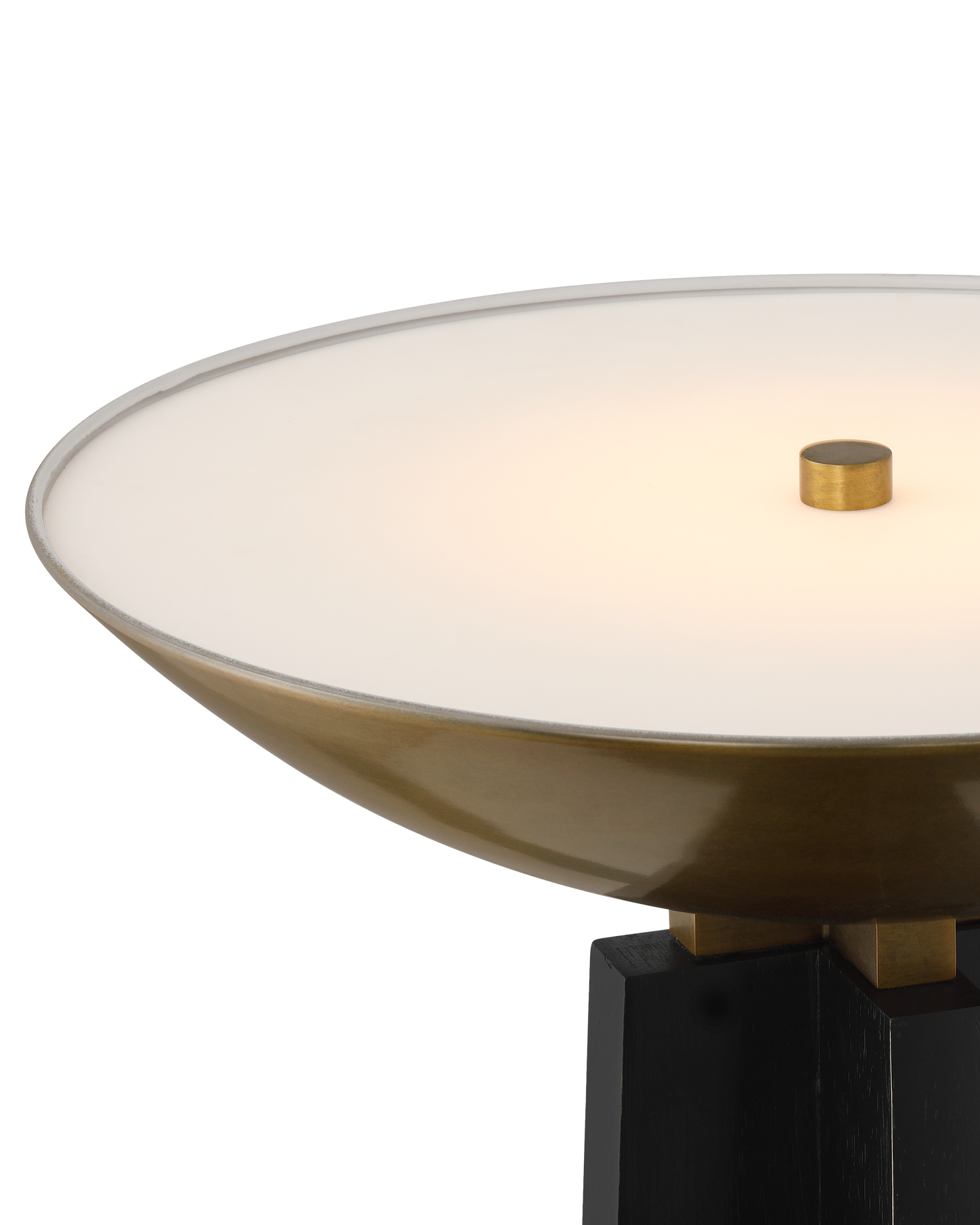 The Calyx Torciere Floor Lamp is made of rubberwood with pitting on its surface that brings patina to the telescoping body. Also contributing to the textural feel is that the black finish has been rubbed away on the edges on the cross-shaped form. The black floor lamp sits on a minimal metal base in an antique brass finish that matches the bowl holding the integrated LED light source.