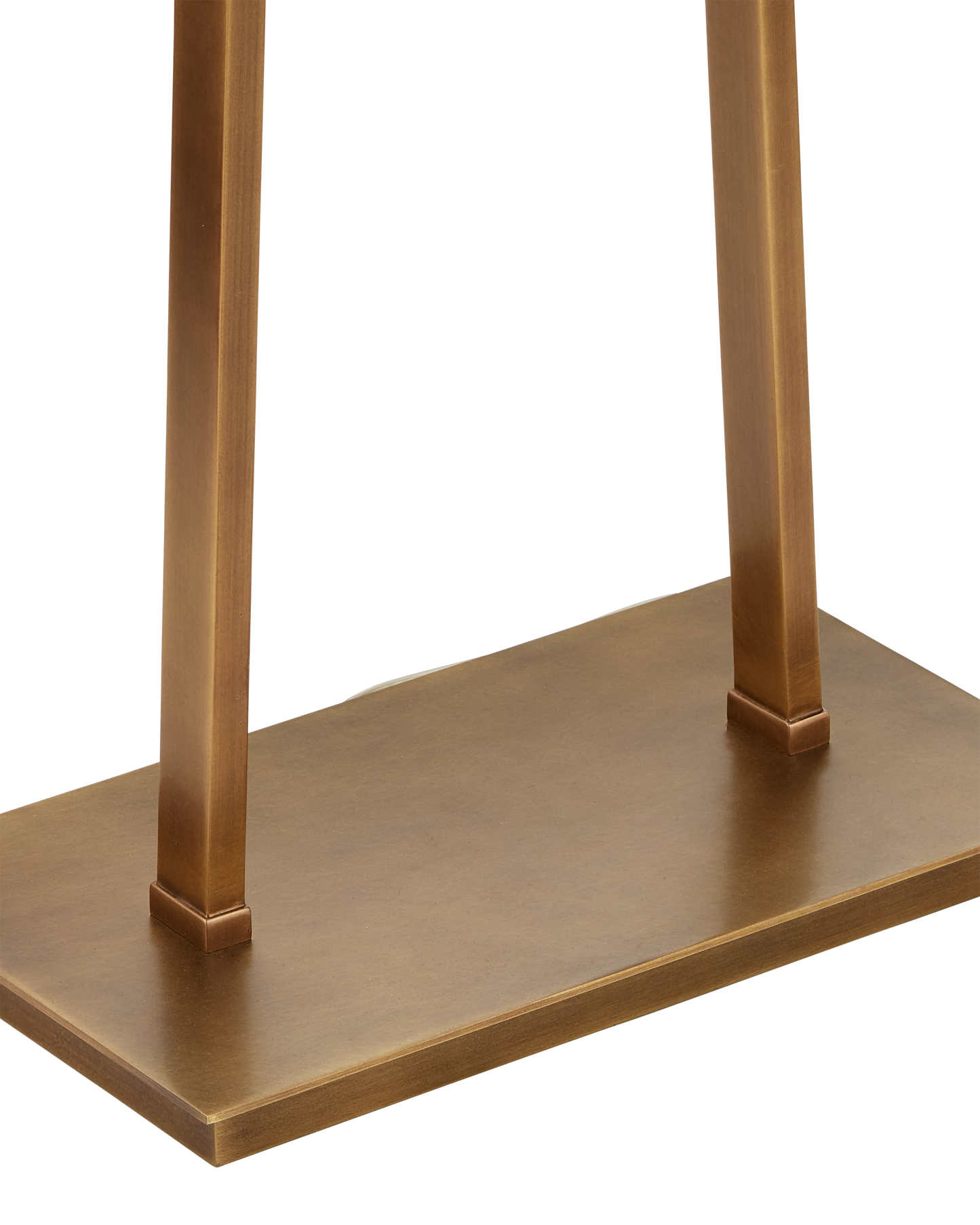 The Duet Floor Lamp has a pair of shades are aimed to give two readers the perfect amount of light when the lamp placed between two chairs. A design detail of note is the asymmetry of the two metal bars that rise up from the base, all in an antique brass finish. The contrasting fixed shades, in an oil-rubbed bronze finish, have white interiors for a brighter glow.