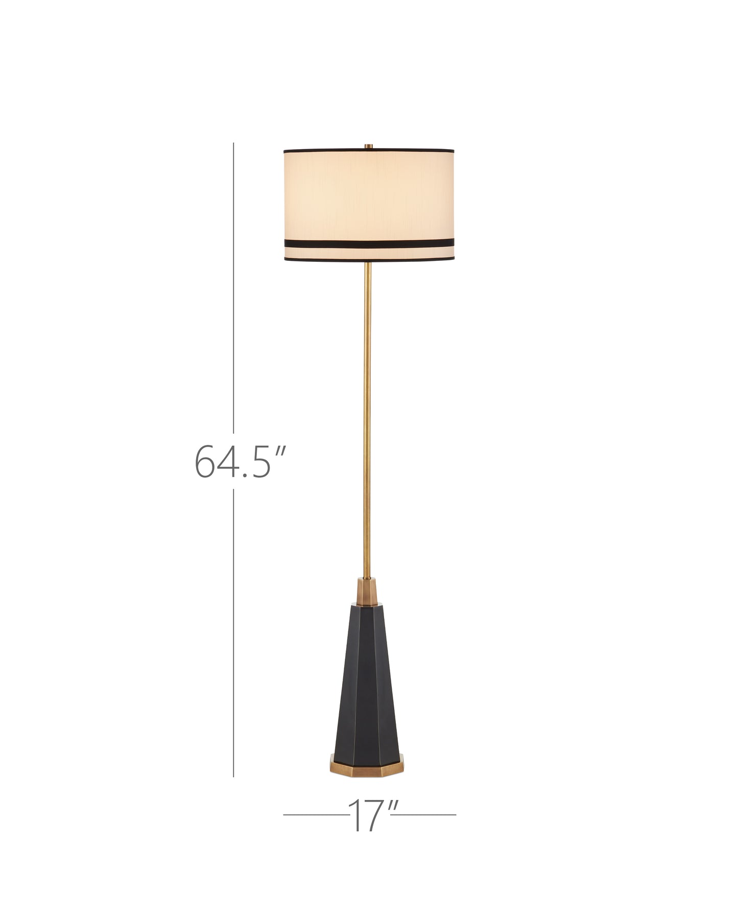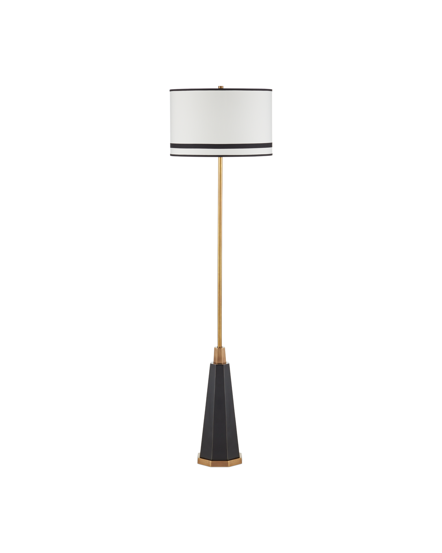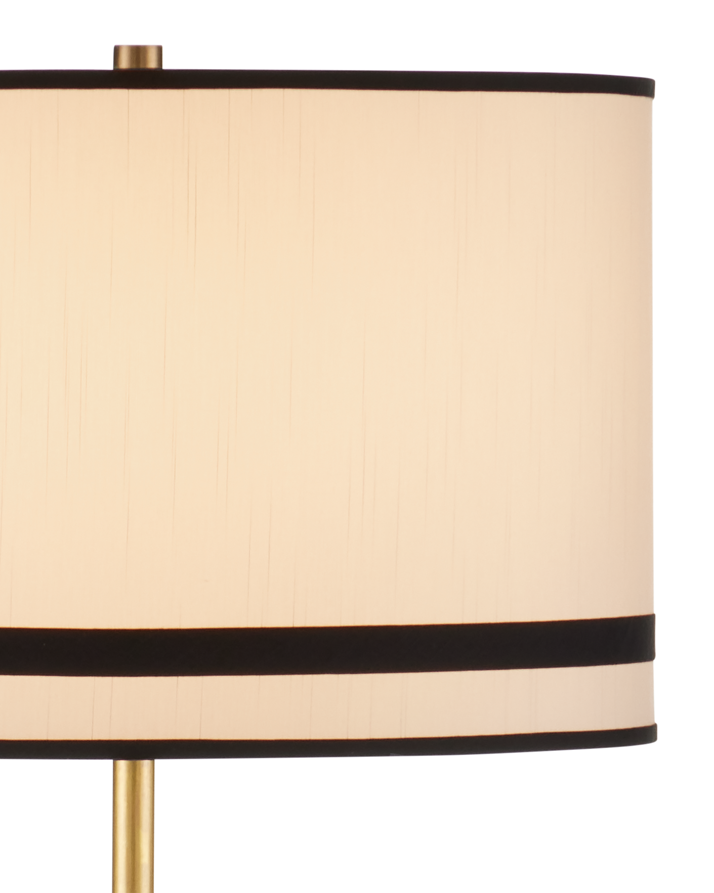 The Gieves Floor Lamp is supported by a telescoping pedestal crafted from metal in a bronze finish that sits atop a fluted base in an antique brass finish. The thin stem that extends toward the shade matches the base, while the trim on the black tie-striped shade matches the flaring triangular shape at the bottom.
