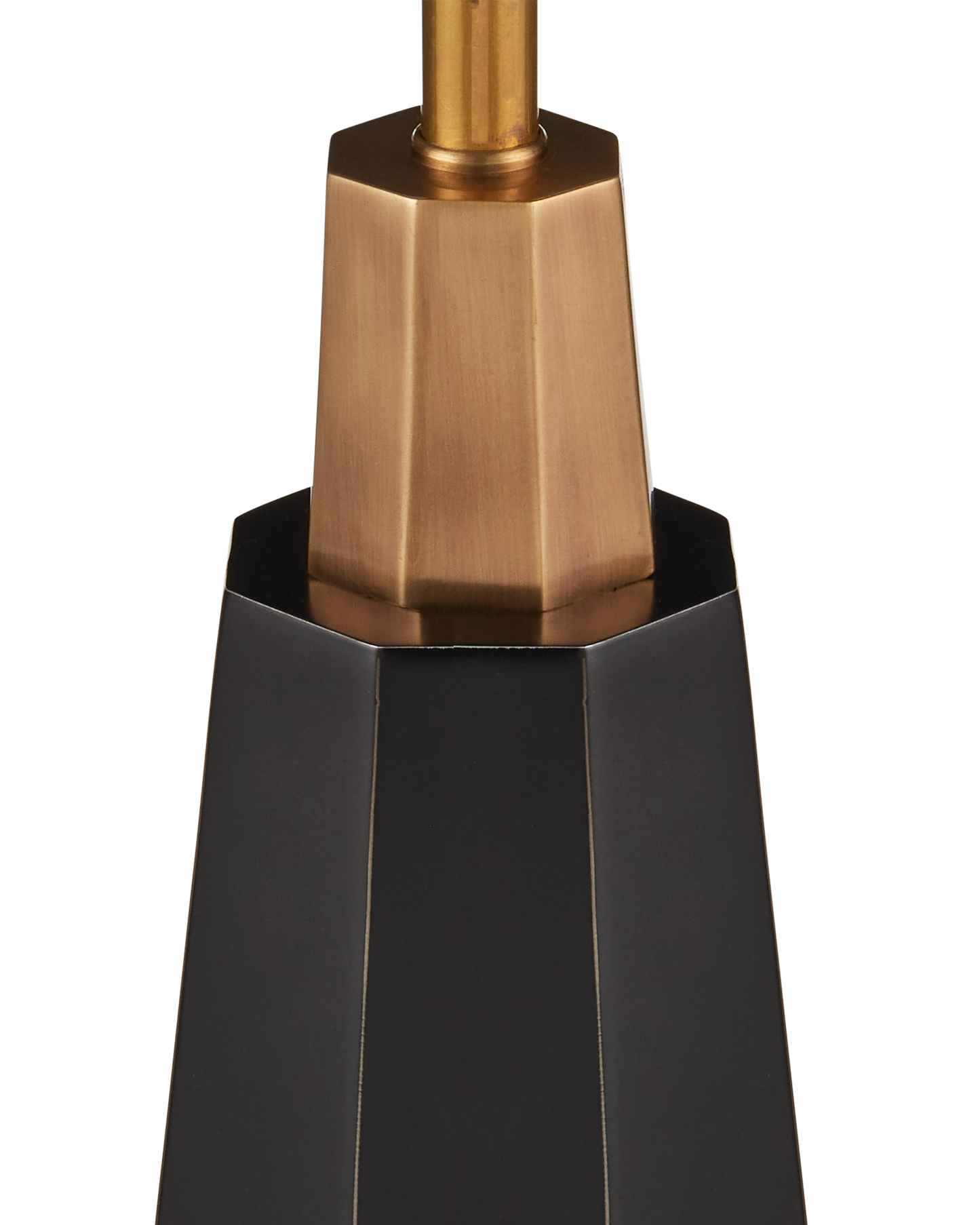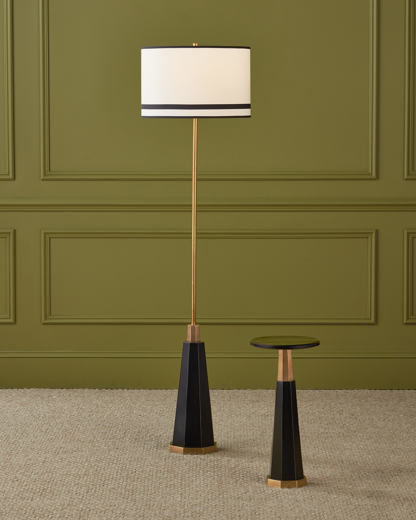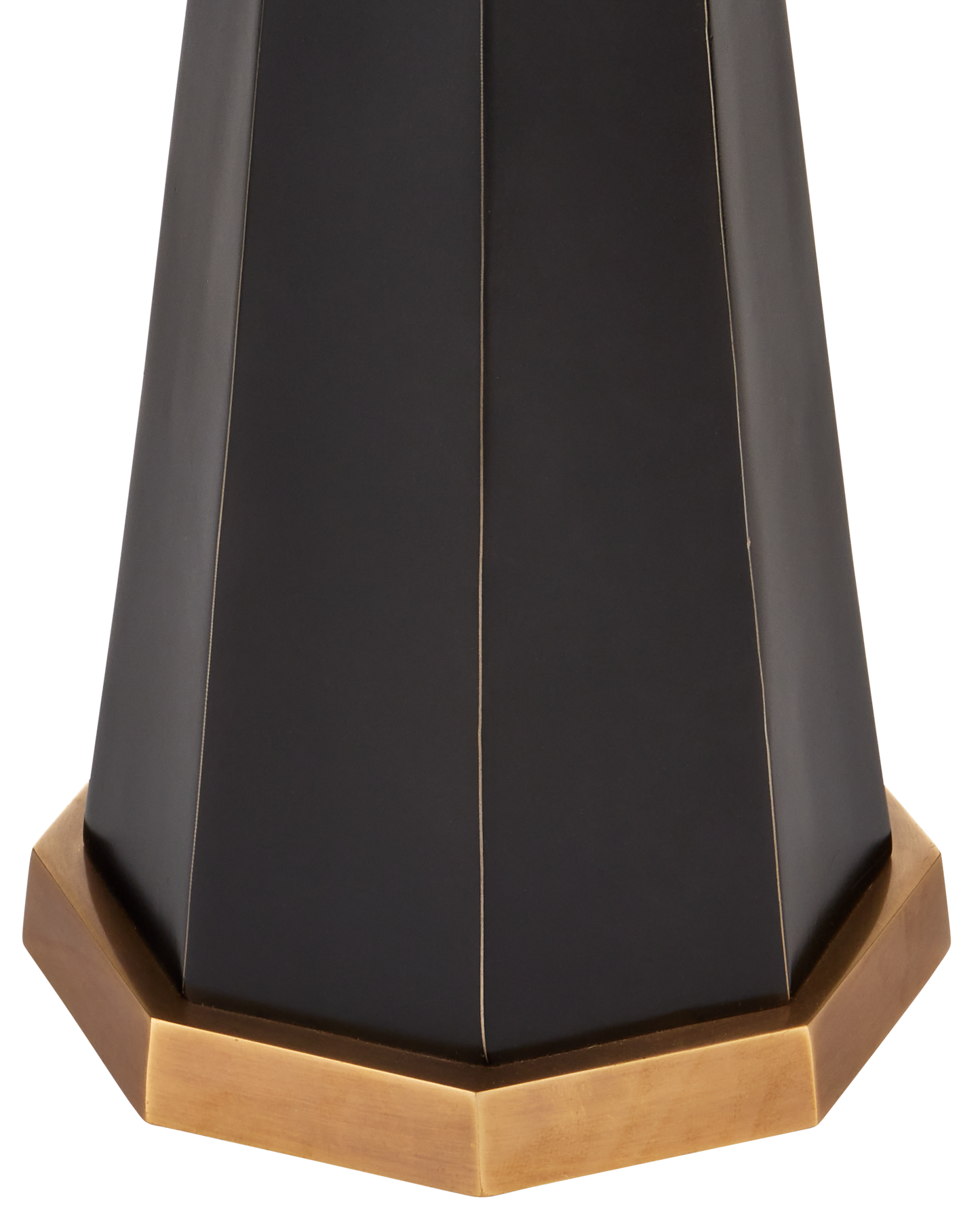 The Gieves Floor Lamp is supported by a telescoping pedestal crafted from metal in a bronze finish that sits atop a fluted base in an antique brass finish. The thin stem that extends toward the shade matches the base, while the trim on the black tie-striped shade matches the flaring triangular shape at the bottom.