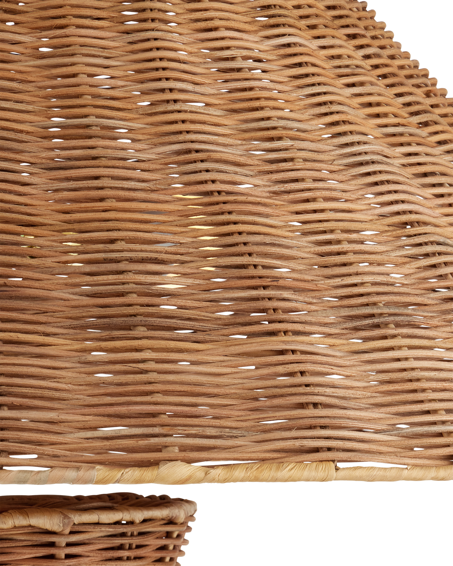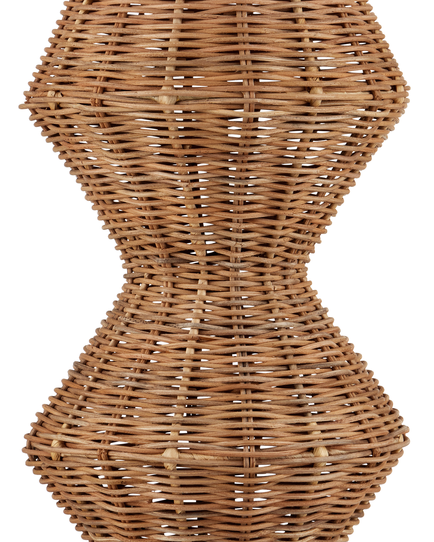 The Nirvana Grande Floor Lamp has an overscale geometric body made of cane rattan from which the skin was stripped to give the natural material a matte texture. The flared empire shade is made of thicker rattan to provide the floor lamp with an Asian-inspired flair. Three bulbs emit an abundance of warm illumination, and the Nirvana turns on and off with an inline foot switch.
