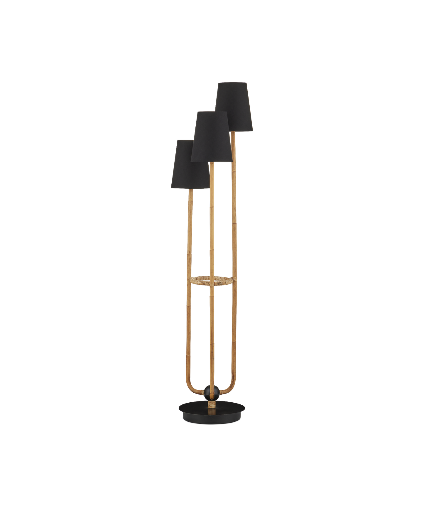 The three stems of the Triptych Floor Lamp that flow up from the satin balck base are covered in natural rattan until they disappear under the black fabric shades. There are a number of special attributes to this design: the combination of black and neutral tones, and the cascading effect of the three shades as their supports grow shorter. These design details make the rope-wrapped floor lamp a stylish choice for a room. A foot switch enhances easy off and on maneuvering even if the floor lamp is tucked behind a piece of furniture.