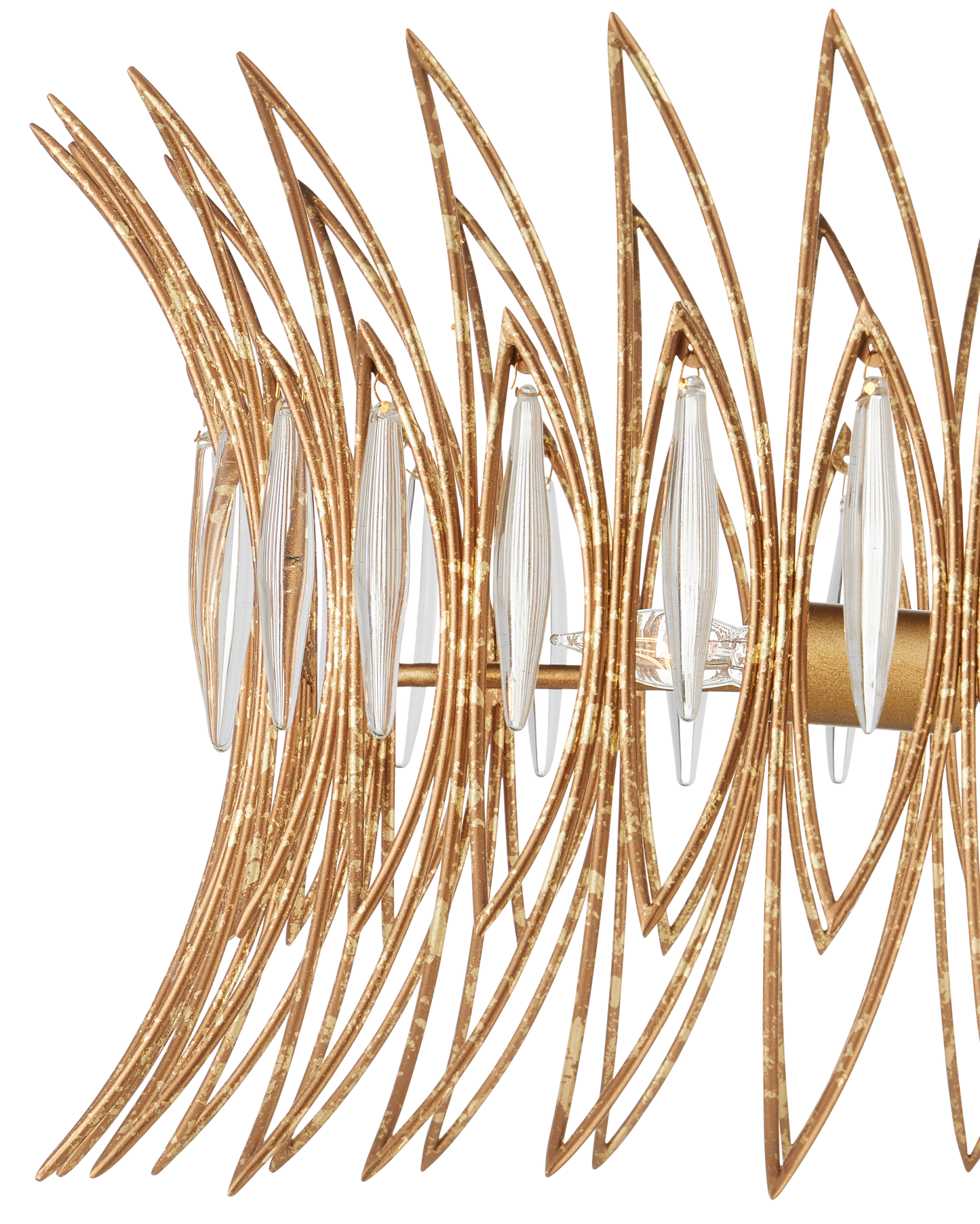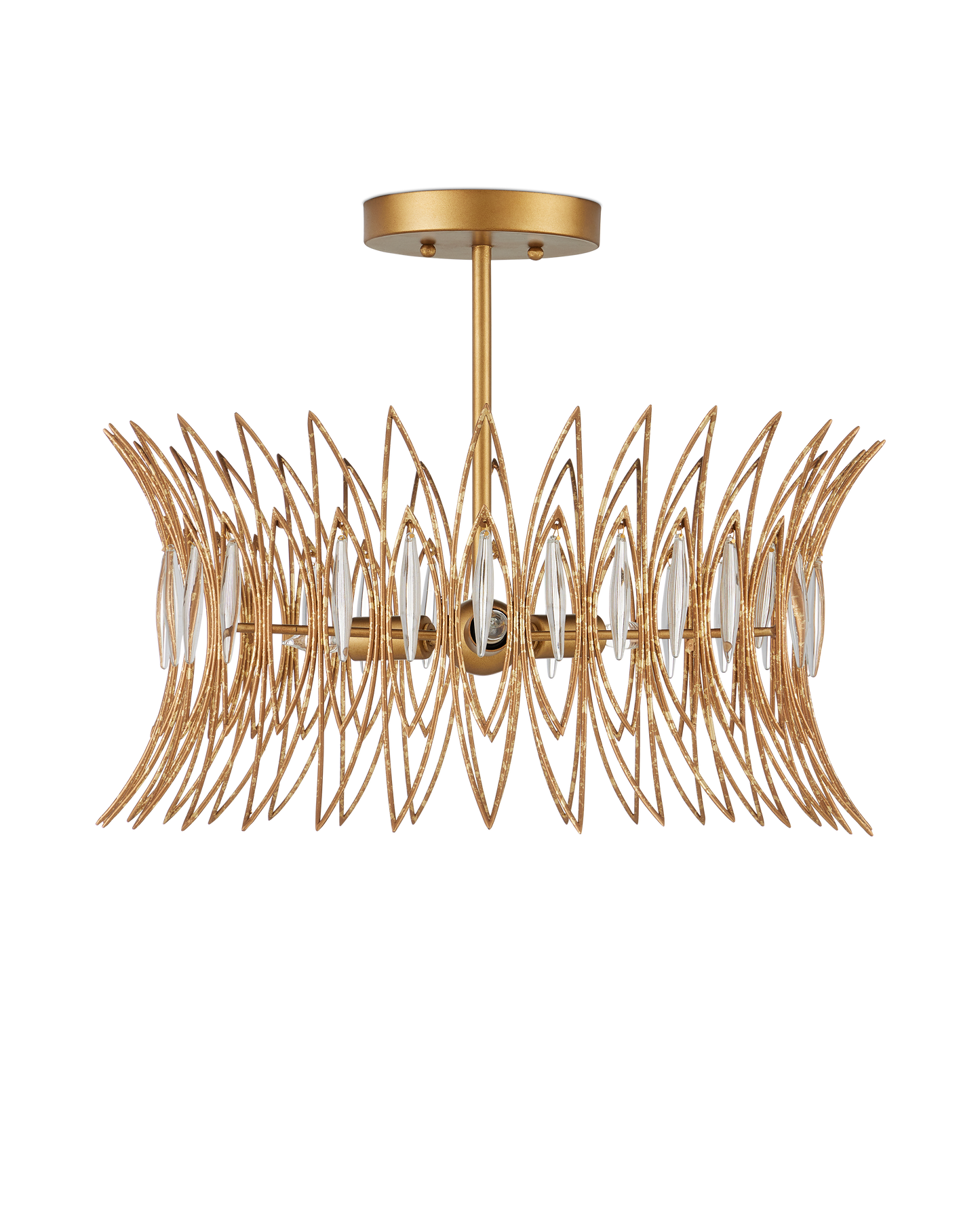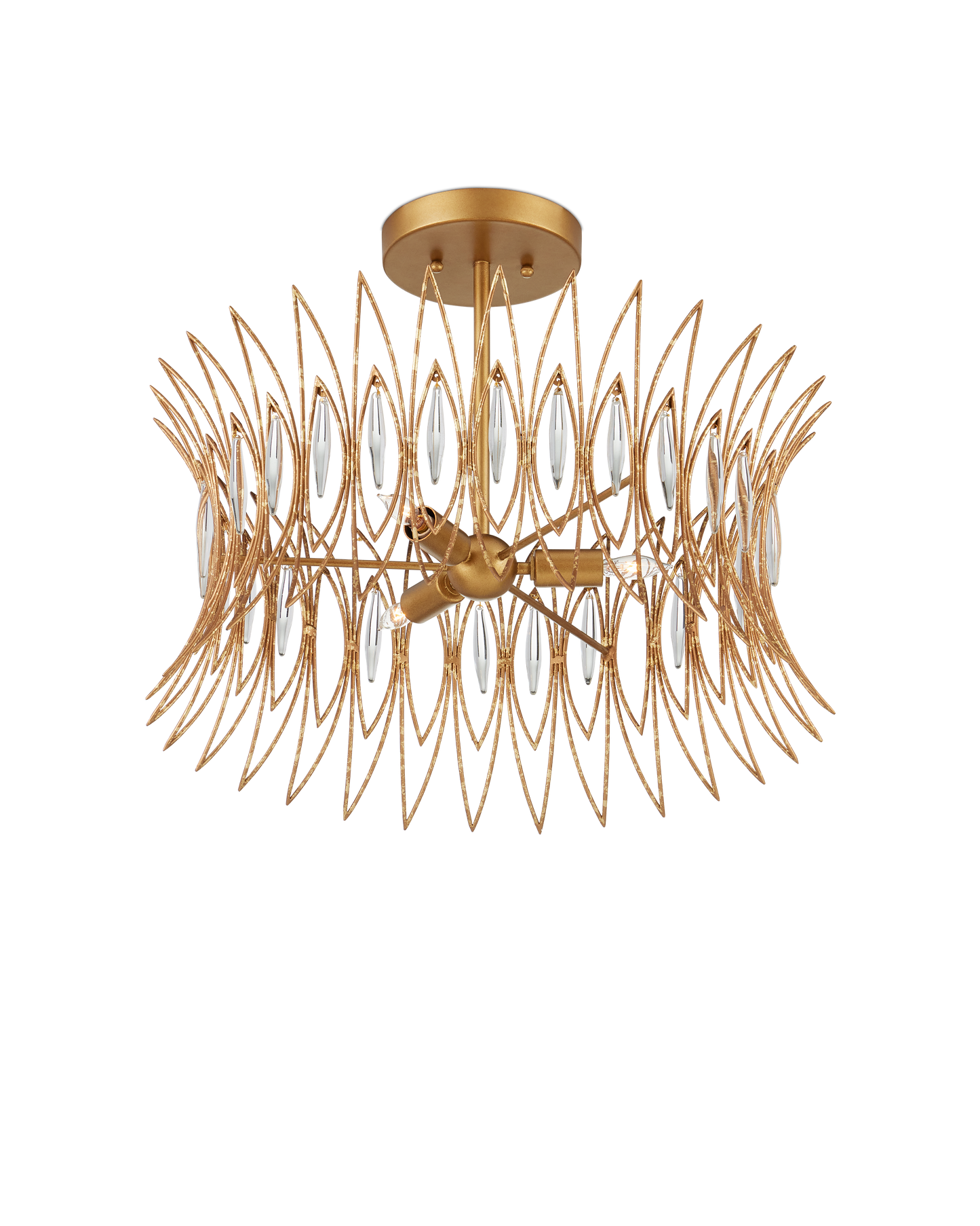 The Marquise Semi-Flush Mount is made of slender wrought iron wires in a Luxor gold finish that brings the metal a speckled texture. Inspired by an earring from the mid-century era, the crown-like semi-flush has abstract leaf designs that flow along the frame, which are fitted with oblong pieces of clear glass to enhance the glow. This is a three-light semi-flush that is dimmable.