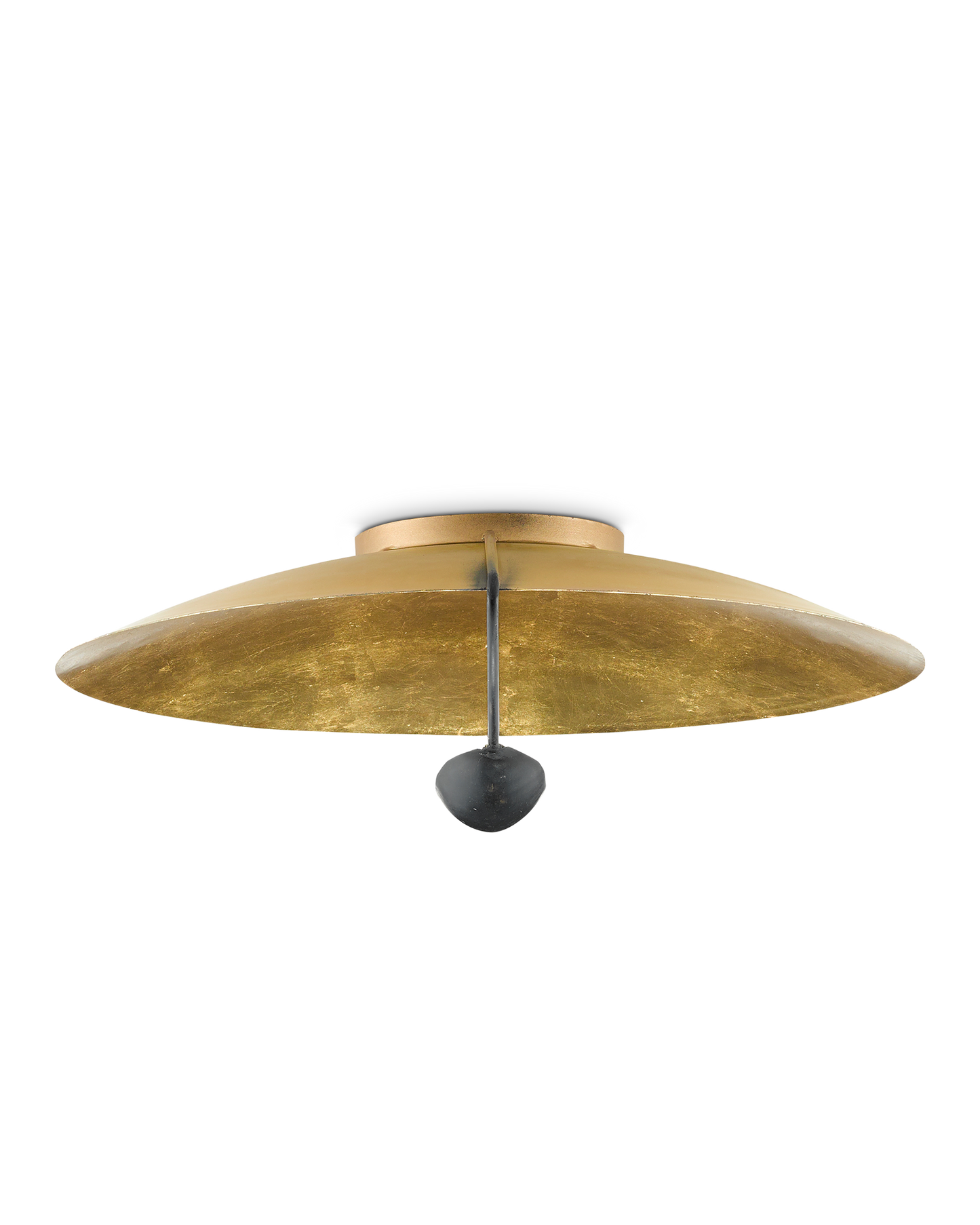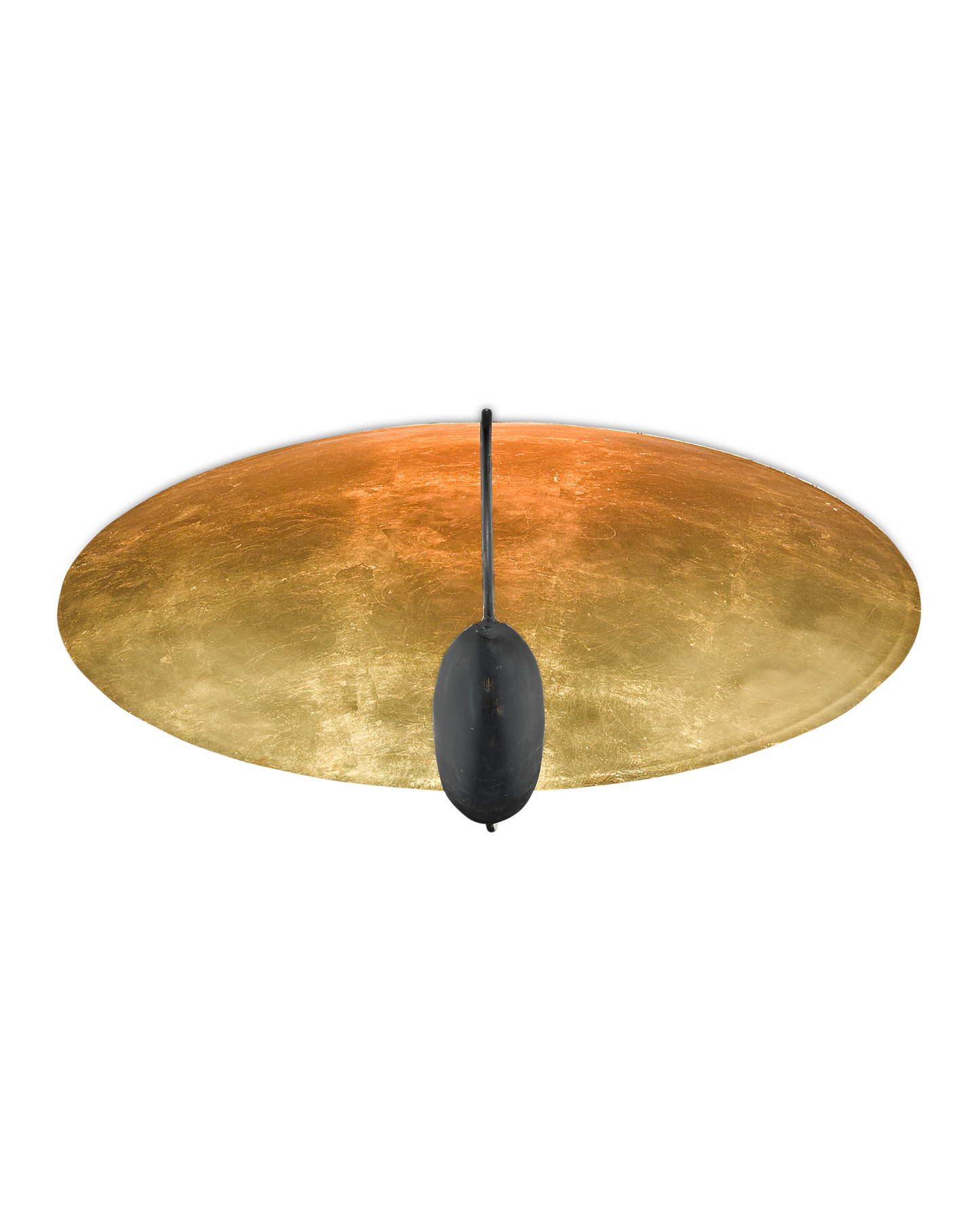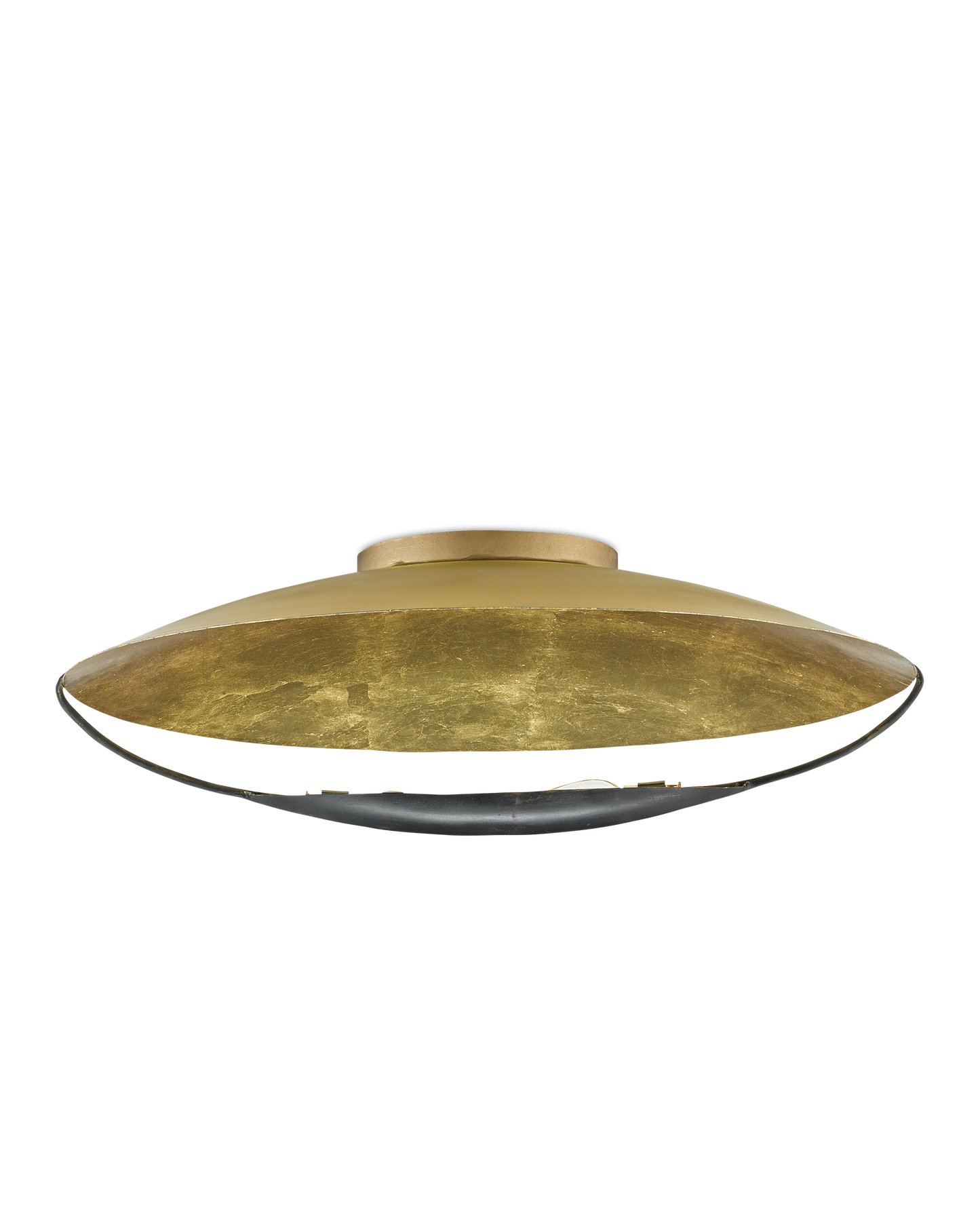 The Pinders Flush Mount is made of wrought iron in a contemporary gold finish. A design note of merit is how the bulb is set within a cup-like extension that is affixed to the thin, curved arm in a French black finish. When the light reflects off the gold interior, it intensifies the warmth of the illumination.