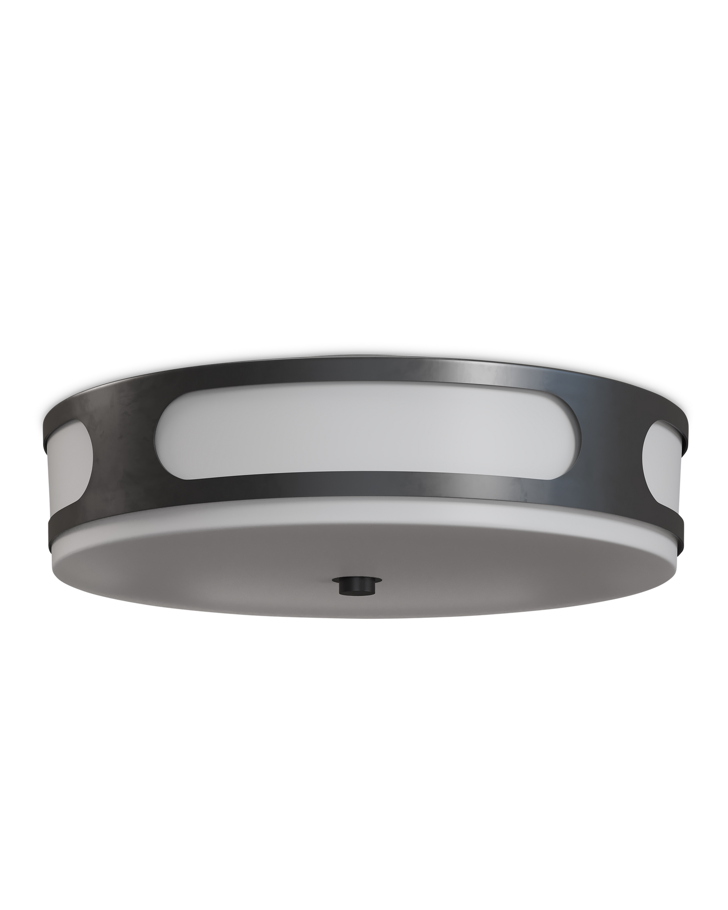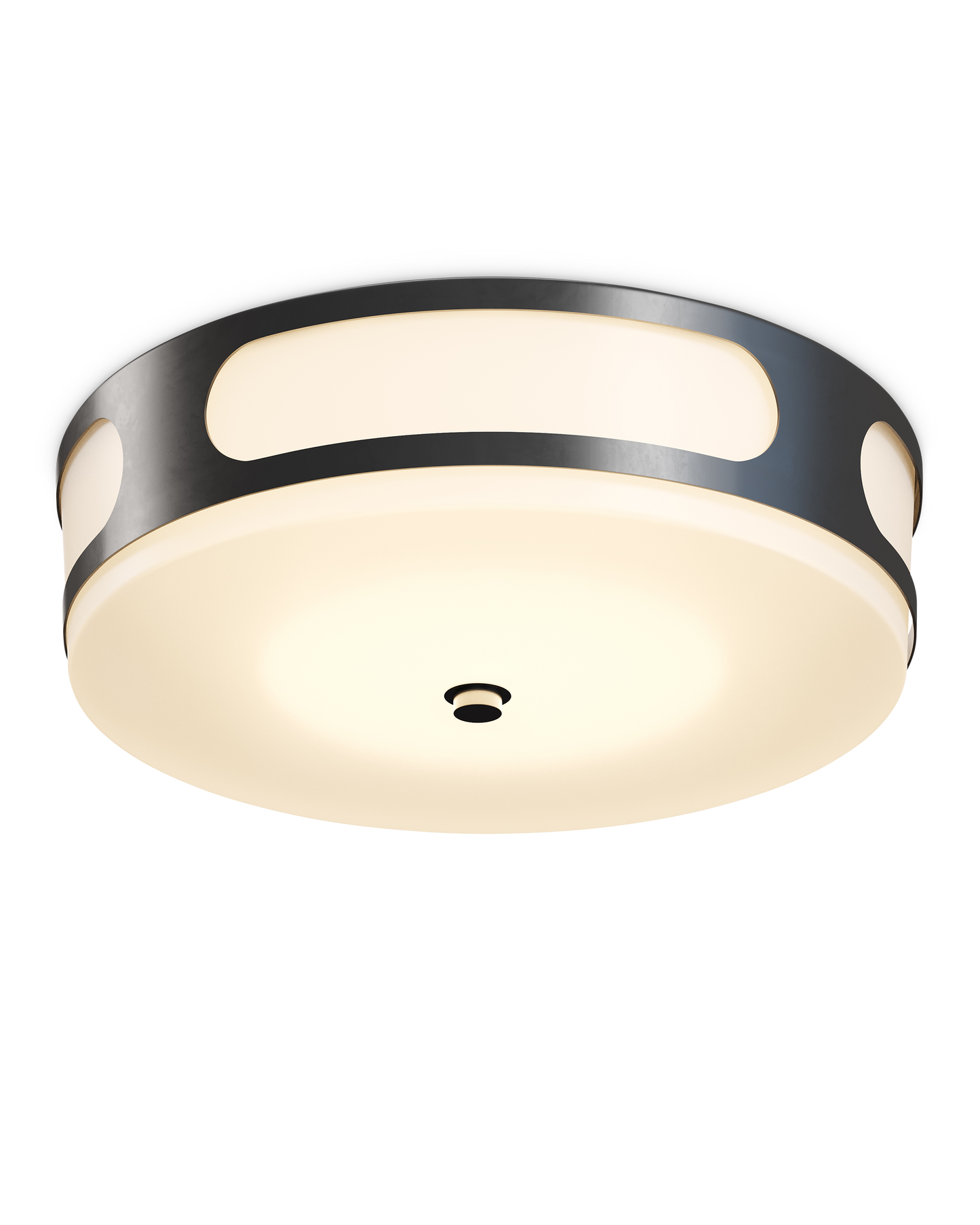 The Swale Outdoor Flush Mount has a graphic silhouette with cut outs where illumination can escape. The sides of the black flush mount are covered with a milky white glass that illuminates uniformly when the integrated LEDs shine through it. The metal is powdercoated to make this outdoor flush mount weather-worthy.
