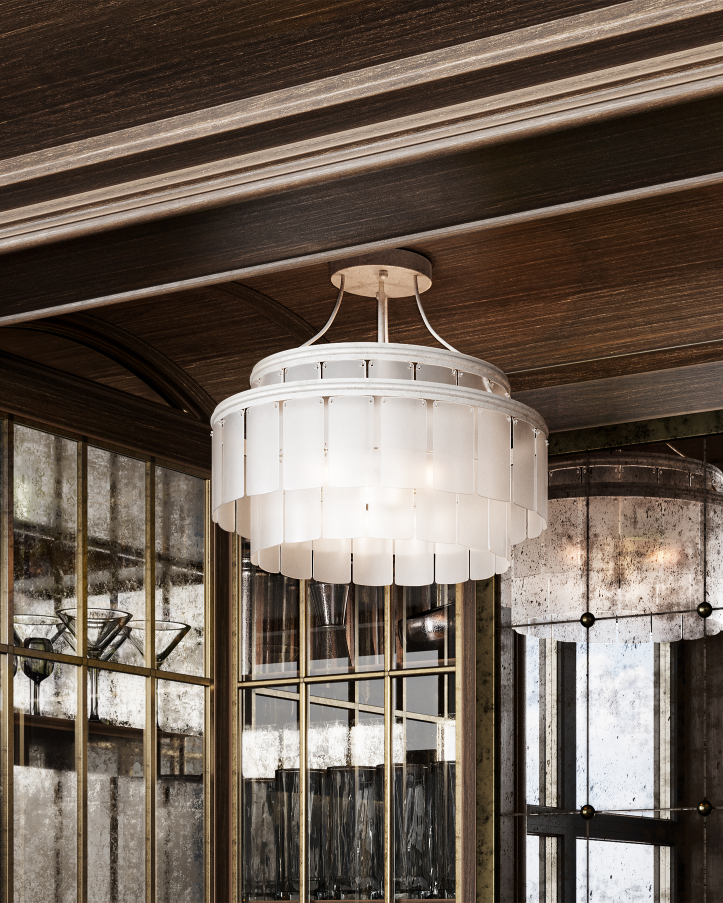 Each row of the Vintner Blanc Semi-Flush is made up of individually-cut pieces of frosted glass made from recycled bottles. The texture of the frosted surfaces beautifully complements the silver leaf finish on the wrought iron frame. This silver flush mount is one of several lights in the Vintner family.