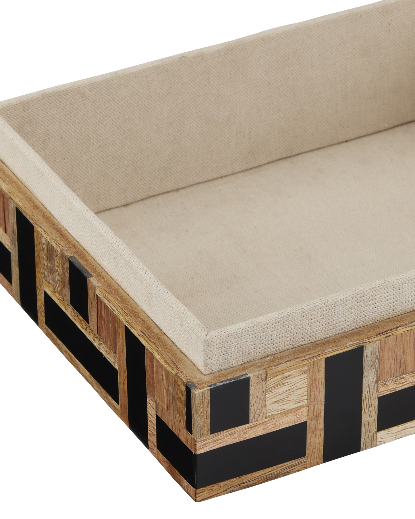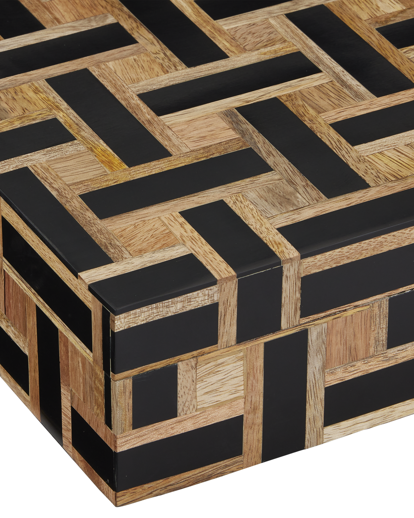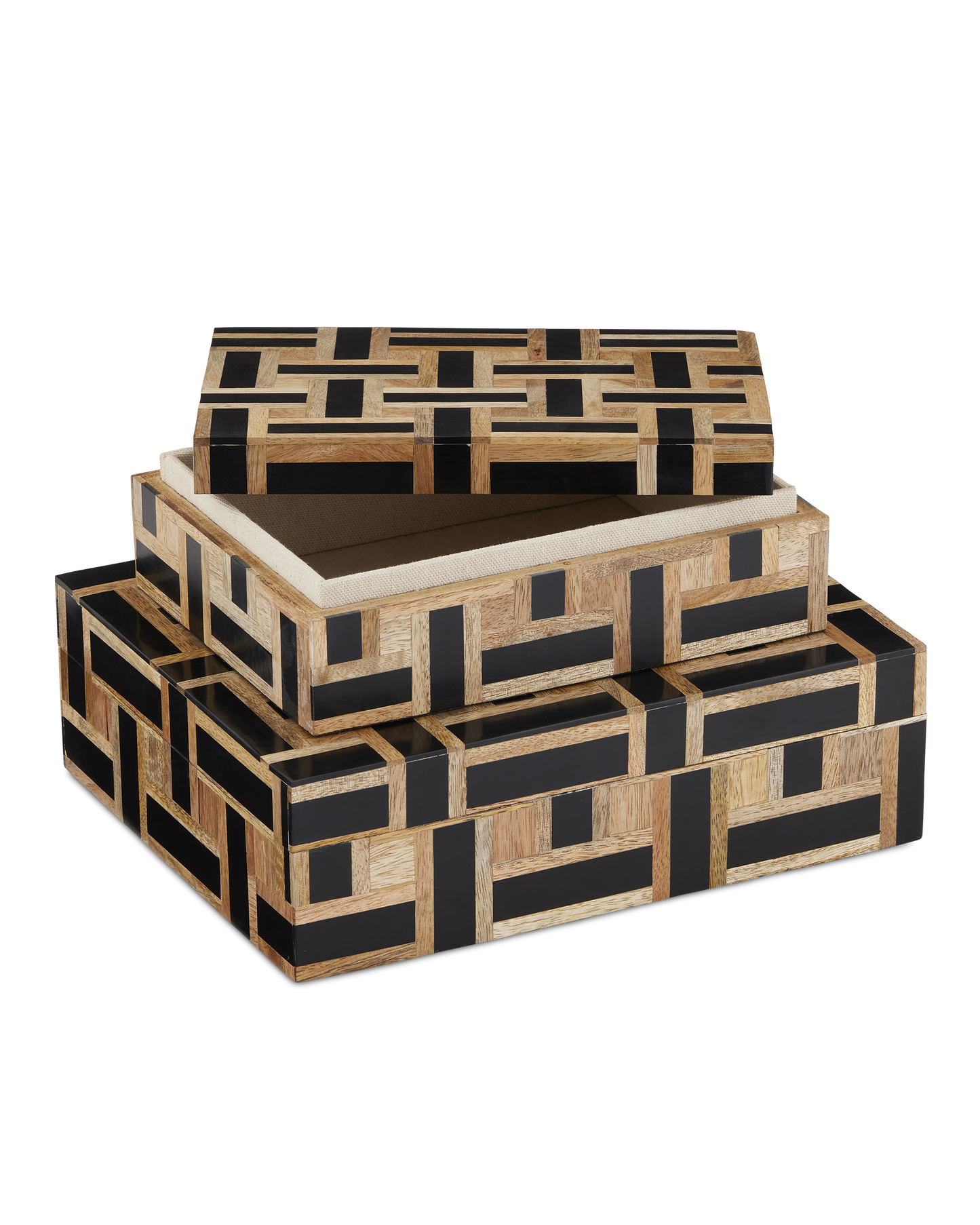 The Aarna Black Box Set with its basket-weave pattern is made of pieces of wood interspersed with strips of black composite. The contrast of the textural woodgrains and the sleek composite creates such an interesting aspect to this design, as does the angular lines of the overall rectangular shapes that echo the elongated pieces on their surfaces. The interiors of the boxes are covered in white linen.