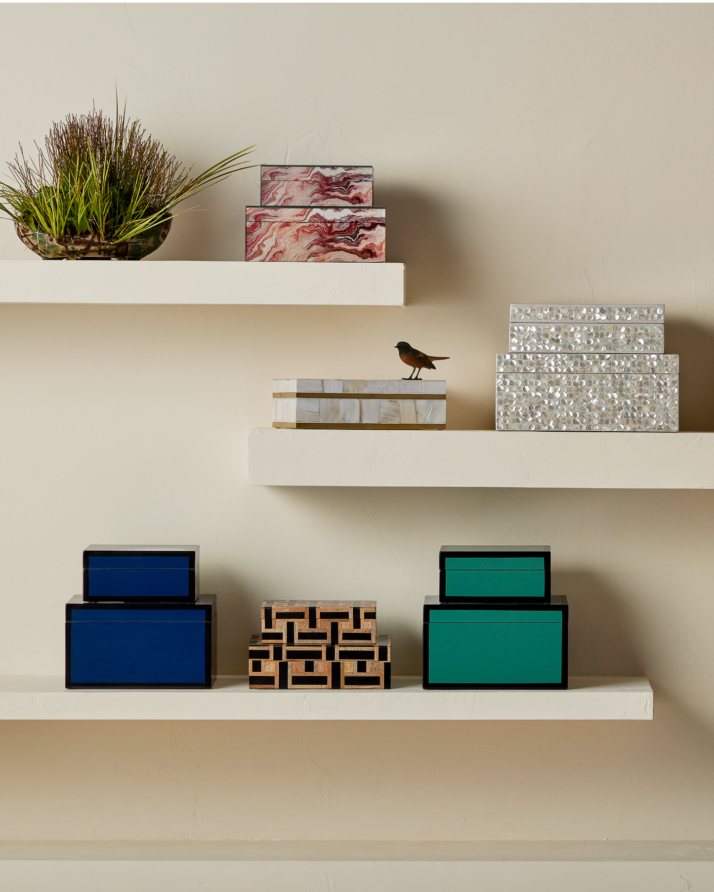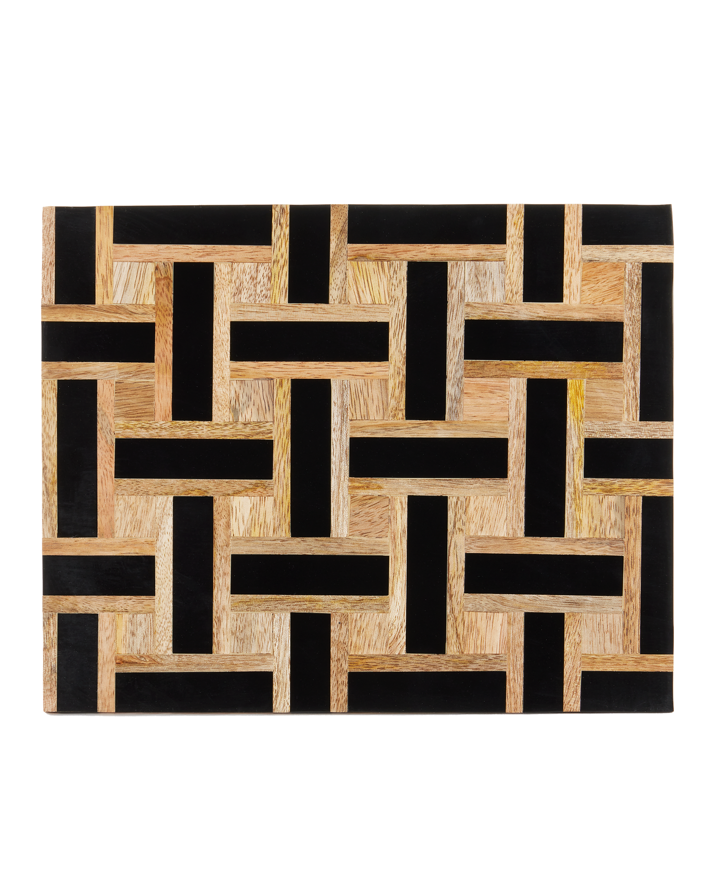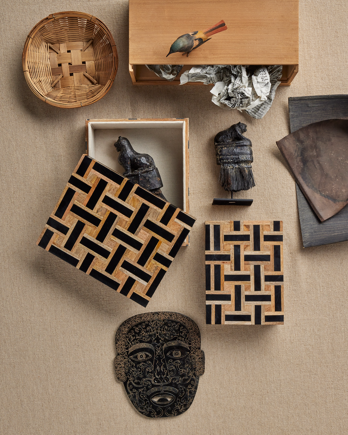 The Aarna Black Box Set with its basket-weave pattern is made of pieces of wood interspersed with strips of black composite. The contrast of the textural woodgrains and the sleek composite creates such an interesting aspect to this design, as does the angular lines of the overall rectangular shapes that echo the elongated pieces on their surfaces. The interiors of the boxes are covered in white linen.