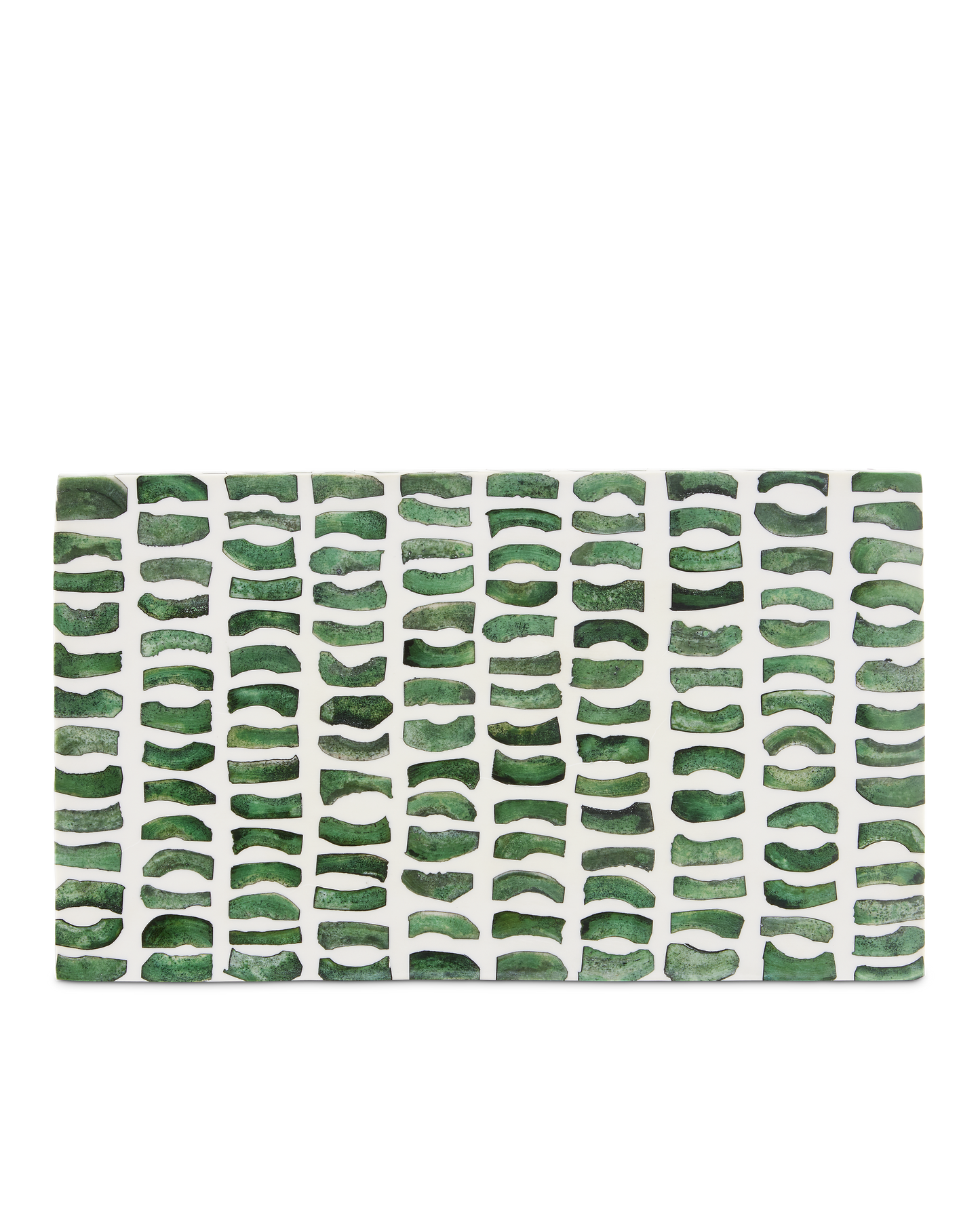 The mix of rich green irregularly shaped pieces of bone set into crisp white composite brings the Emerald Box Set a painterly surface. The pattern on the small and large green decorative boxes, which reads to the eye like naïve brushstrokes, makes this a bold addition to a vignette on any table, and the exquisite construction makes them beautiful desk accessories.