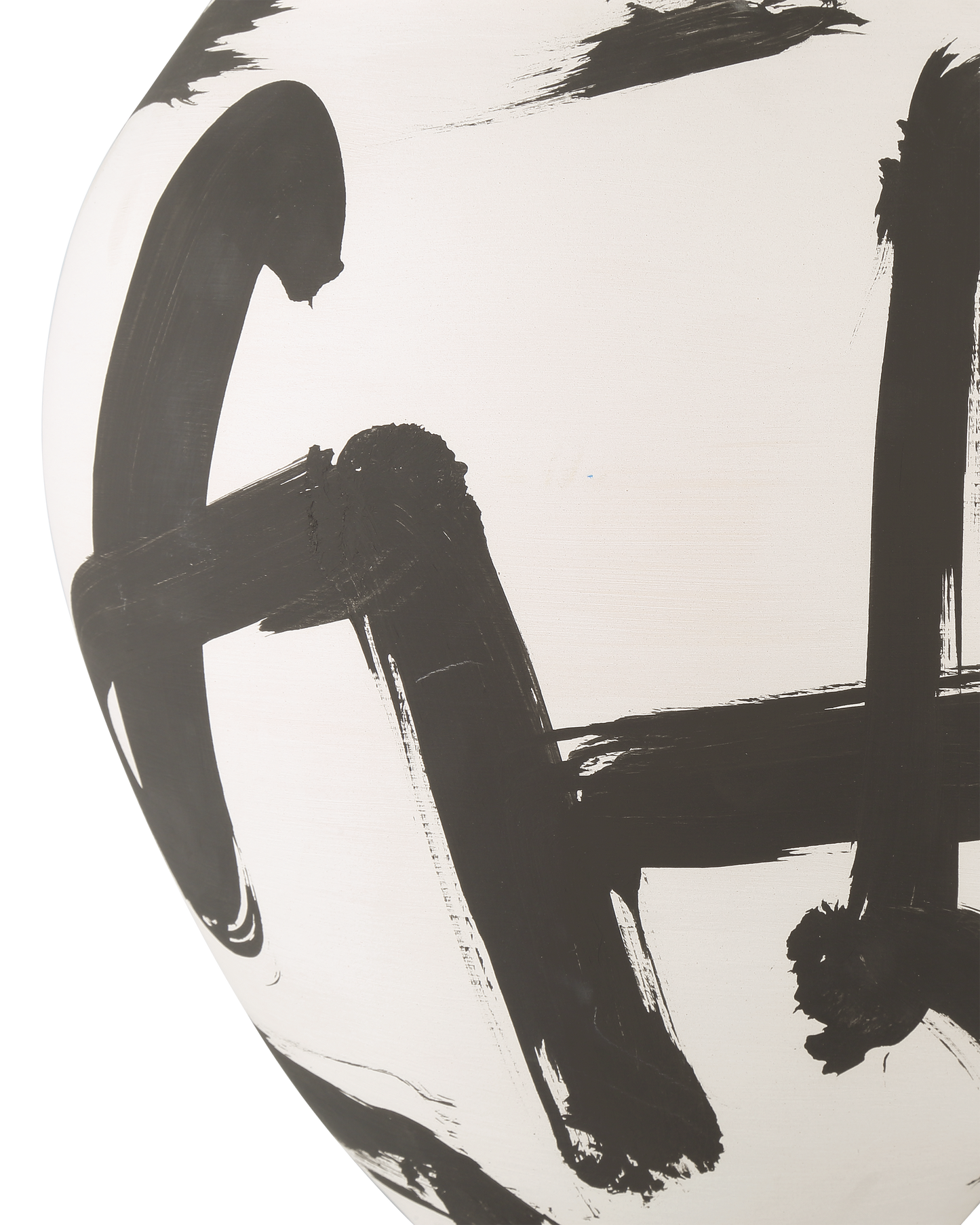 The sketched pattern on the surface of the Kenzo Large Vase was inspired by the art of Imperial Japan, particularly the Enso, a prolific symbol in the Zen practice of painting. Made of porcelain, the black and off-white vessel is finished on the inside; and it is hand-thrown, hand-glazed, and hand-decorated so the patterns on each vase will vary slightly.