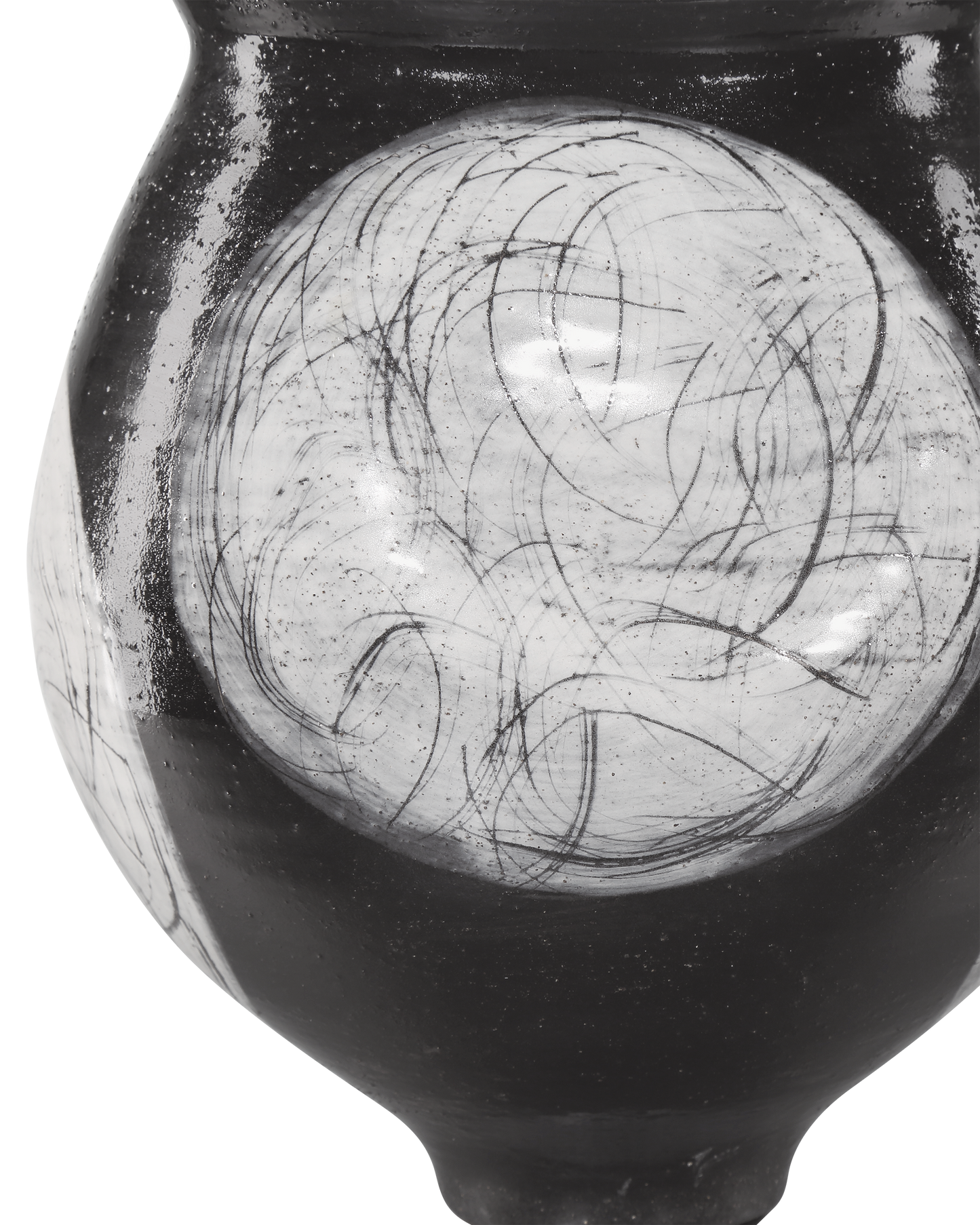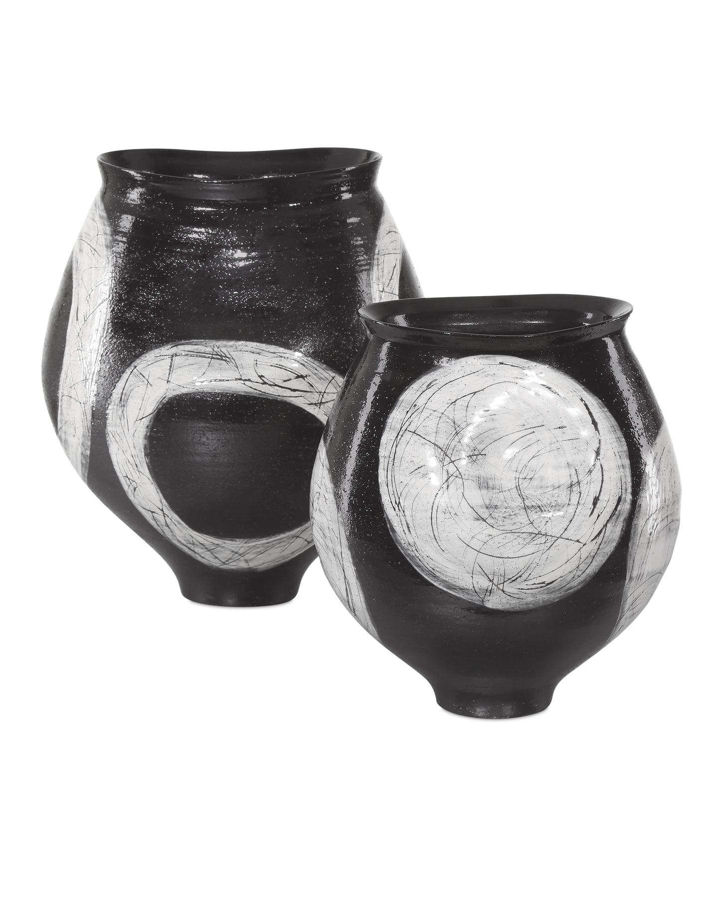 The Nakamura Vase is an artisanal creation made of porcelain that is hand-thrown, hand-glazed, and hand-decorated. The pale gray and black vessel has intentional pitting on the surface. Because the motifs on this vase are created by hand, each will vary slightly as each artist puts his brush to the surface of the glazed material in his or her own unique way. A design detail worth noting is how the vase sits on a smaller rounded bottom, while the irregular oval top reflects the swell of the vessel's shape.