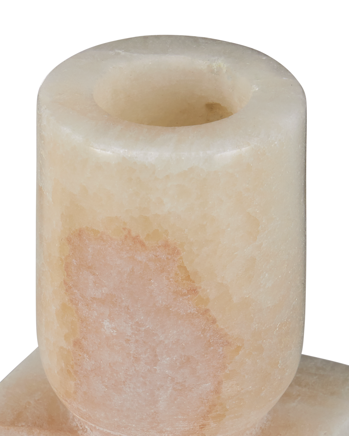 The Lithos Ivory Candle Holder Set includes two candle holders made of a cream onyx. The geometric shapes that compose its profile are enlivened by the natural veining of the stone, making each one unique. The characteristics of this stone bring a warm peachy and cool ivory interplay to their surfaces.