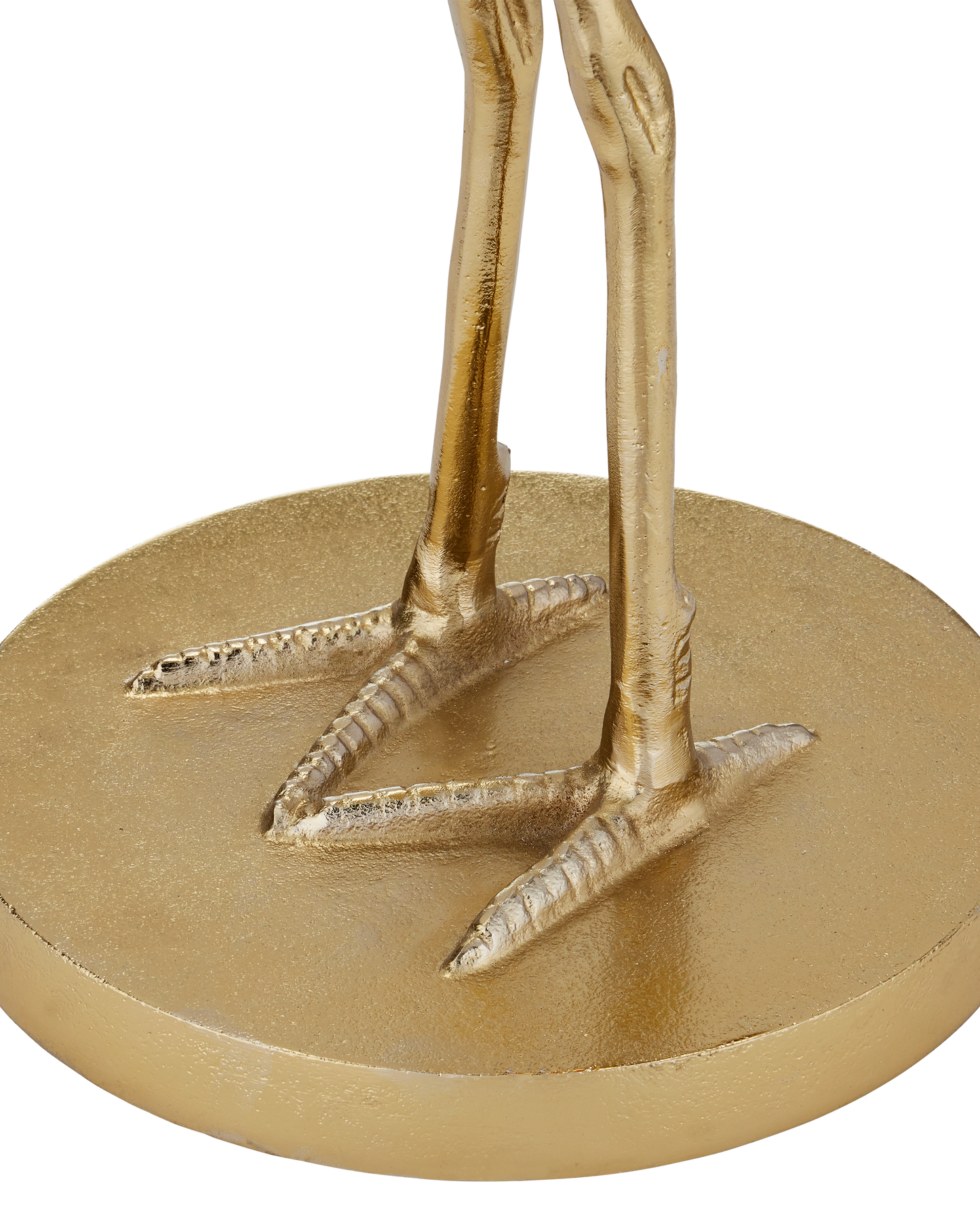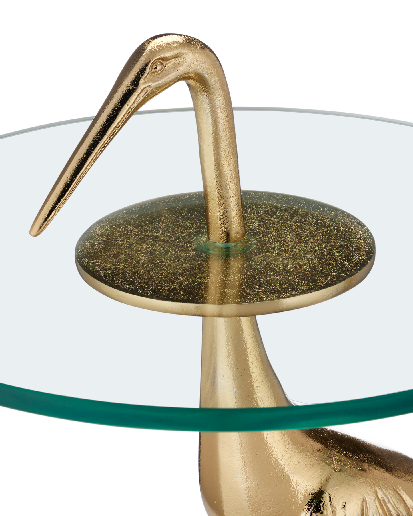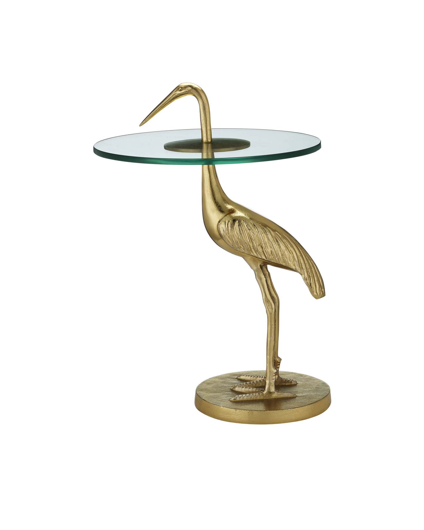 The Crane Brass Accent Table has an artfully realized bird that is made of cast aluminum in a gold finish. The accent table is all the more whimsical given the glass top is fitted to the crane at a narrowing point on its neck. The gold table, which ships without the glass top in place, is easy to assemble, as the crane's head unscrews so the top can be inserted. The base edges have slight bevels on the top and bottom.