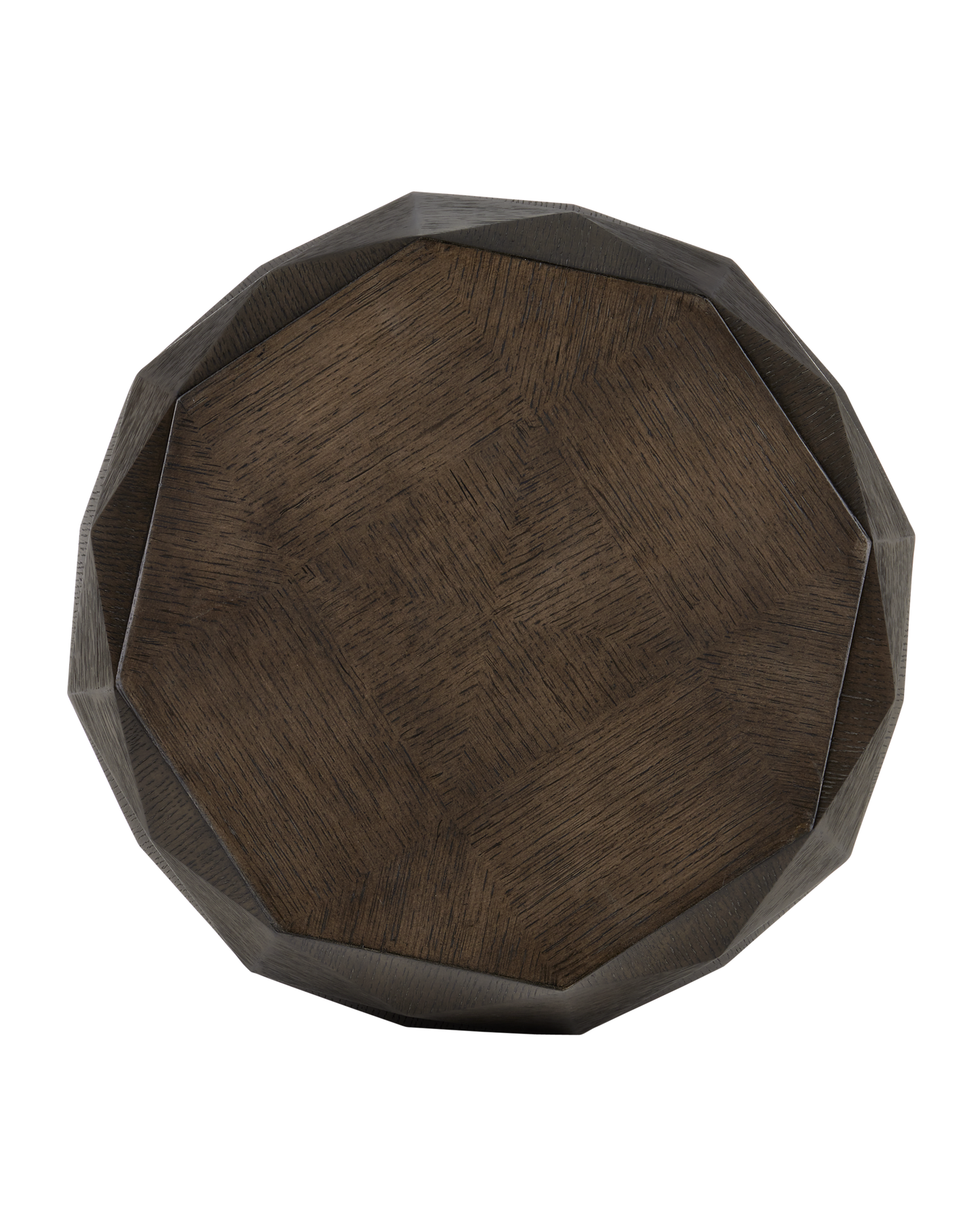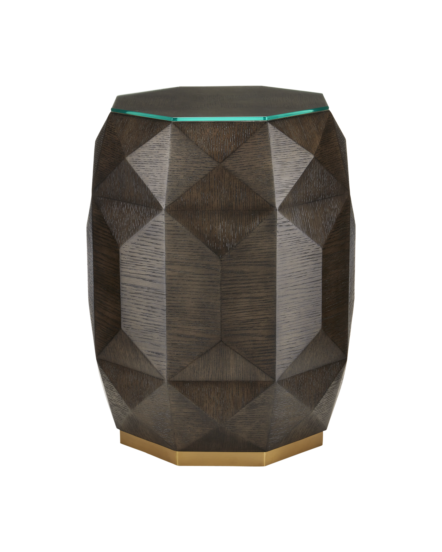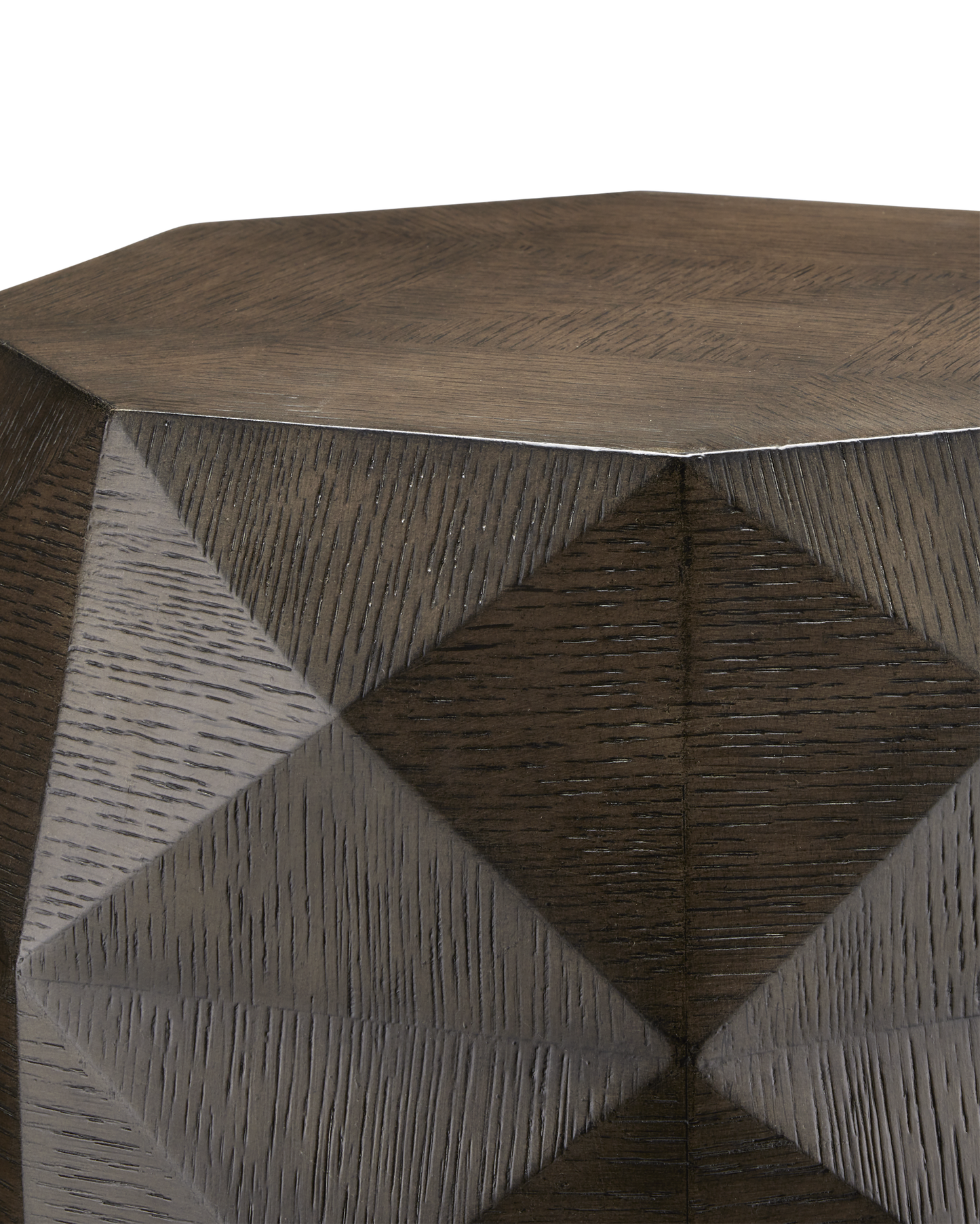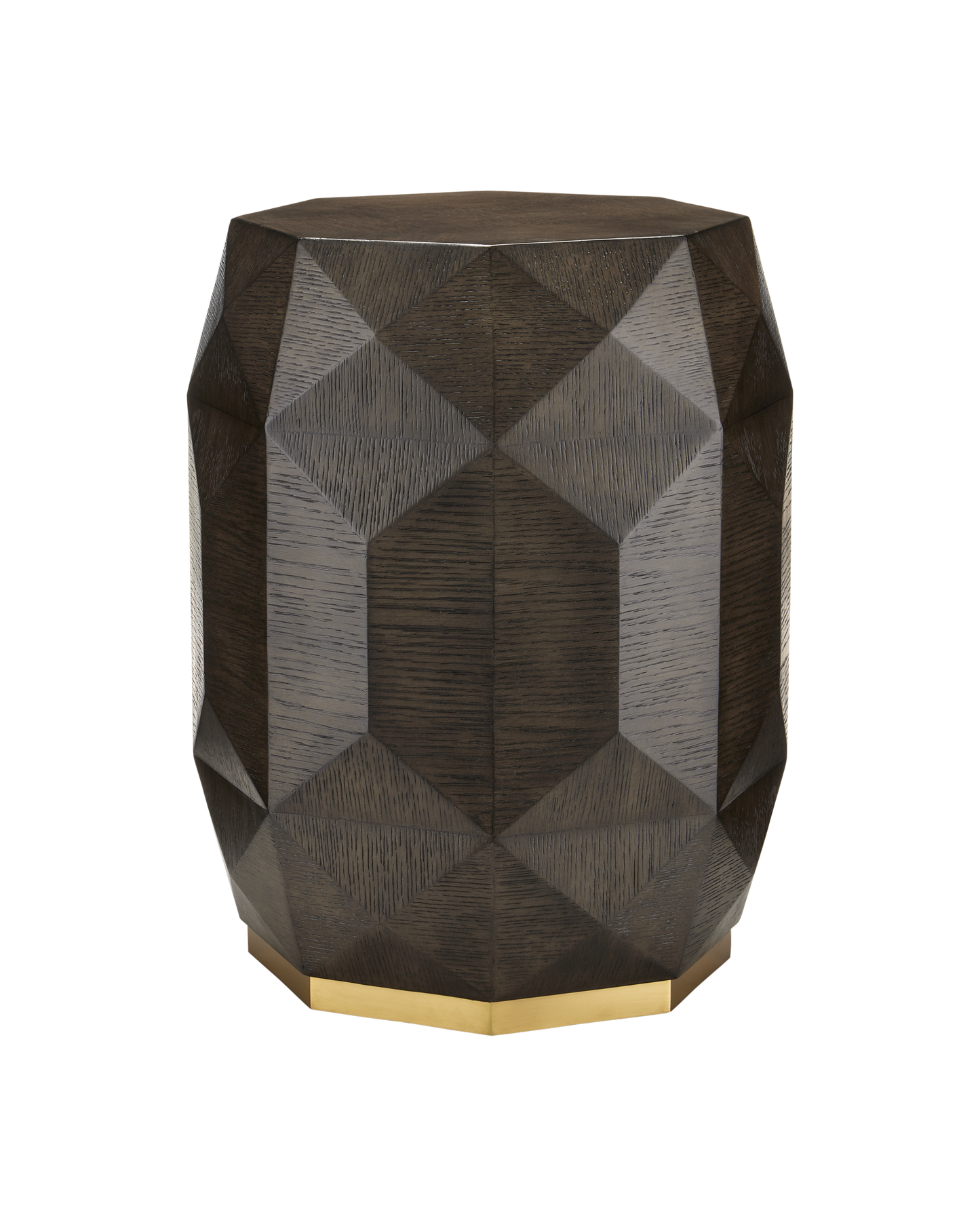 The Kendall Dove Gray Accent Table has an octagonal shape carved from oak solids covered with facets of oak veneers that make it jewel-like. The surface has a dove gray finish that has been wire-brushed to accentuate the grain in the wood. The dark brown accent table sits on a plinth base made of metal in a polished brass finish to add a glimmering touch to the warmth of the gem-like occasional table.
