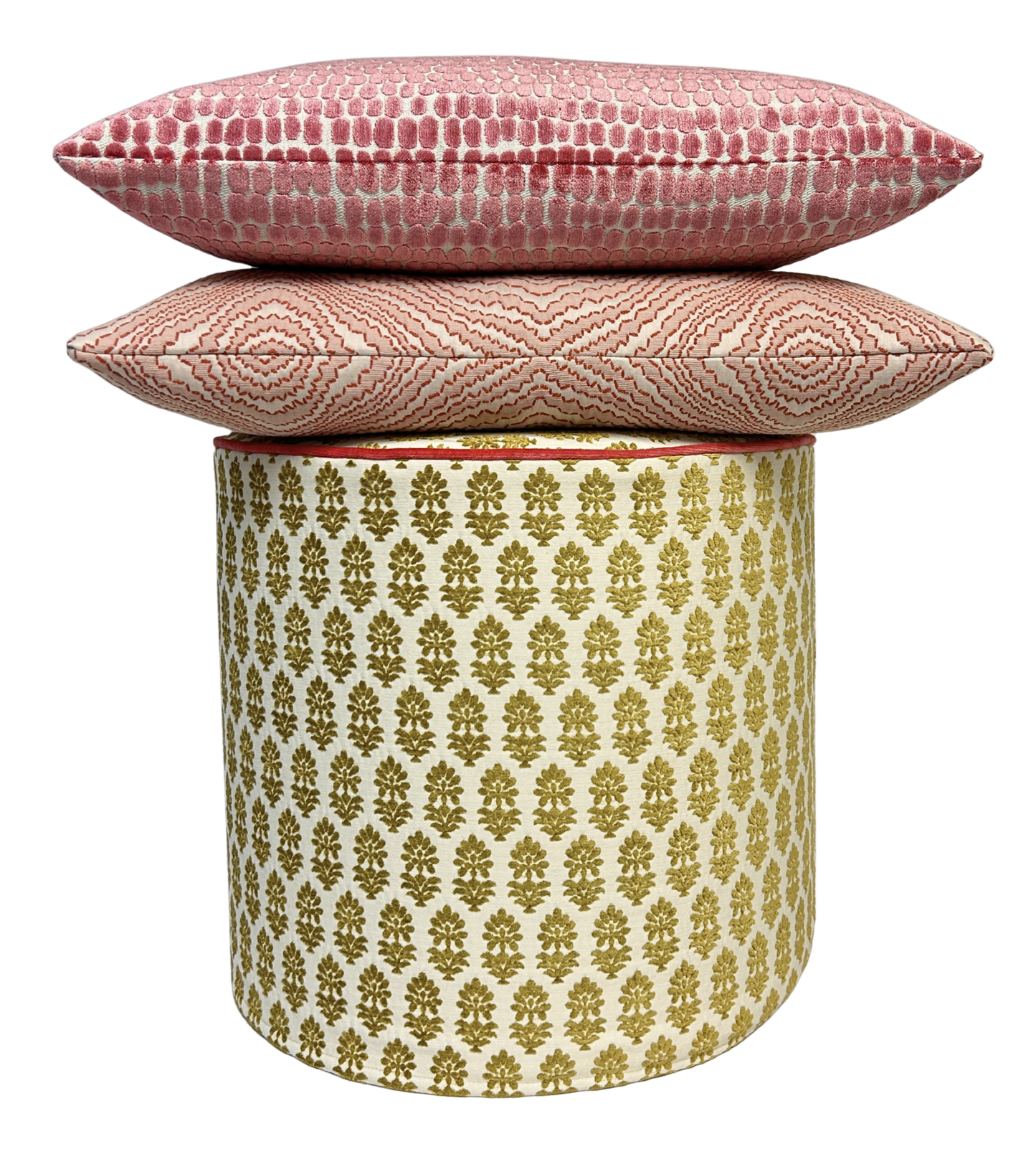 Traditional meets playful with this olive floral block print ottoman, trimmed in bright pink piping for an unexpected twist on a classic.