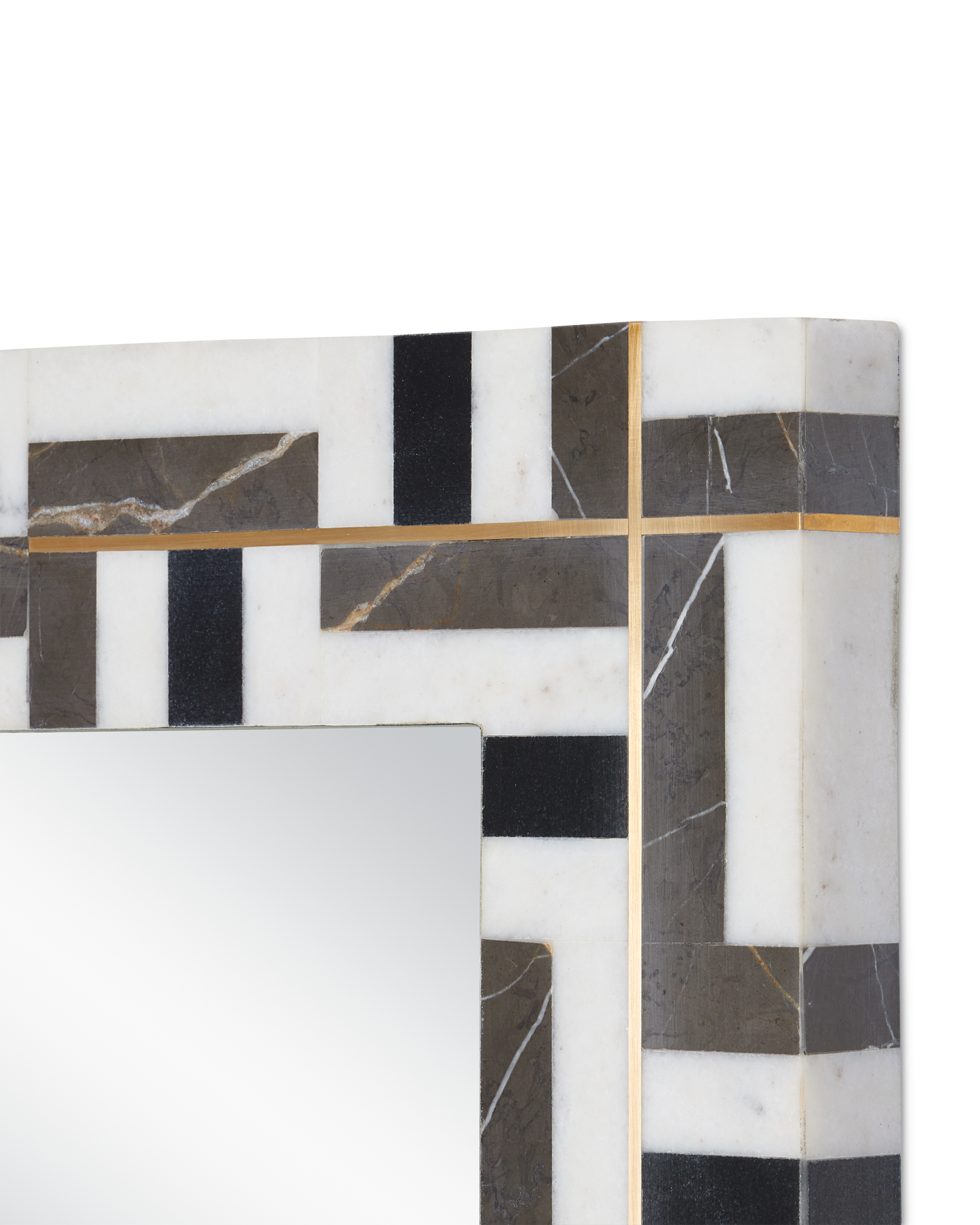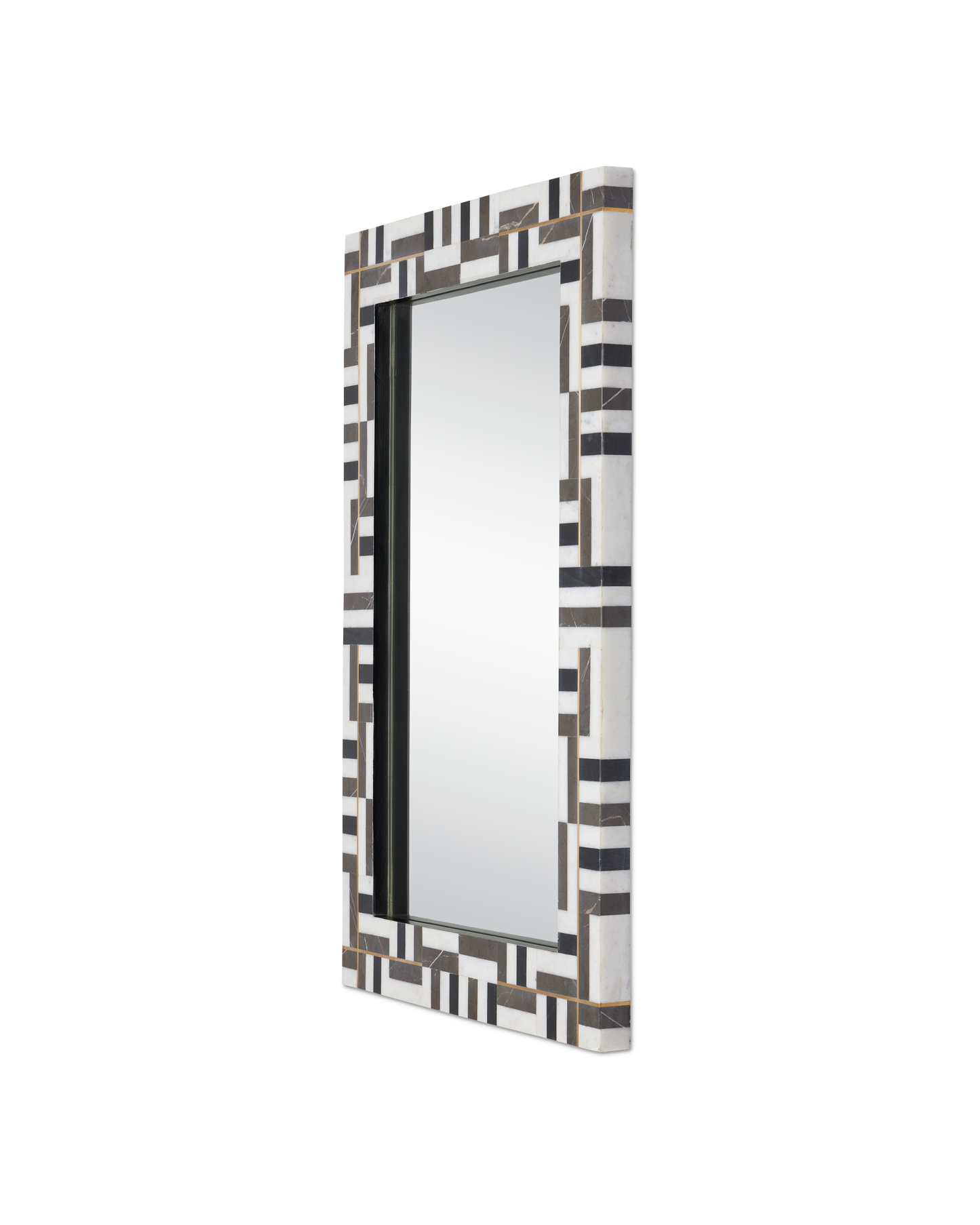 For spaces that will welcome bold geometric patterns, the Gentry Rectangular Mirror will be right at home. The shapes that make up the pattern are fashioned from three different types of marble: Ambaji, Marquina, and Pietra Gray. Bringing a hint of brightness to the composition is the brass inlay that intersects on some edges where the marble pieces meet; the fact that they do so in a random composition adds interest to the black and white mirror. The inside edge of the frame where it intersects with the glass is black. There are two cleats on the mirror so it can be hung vertically or horizontally.