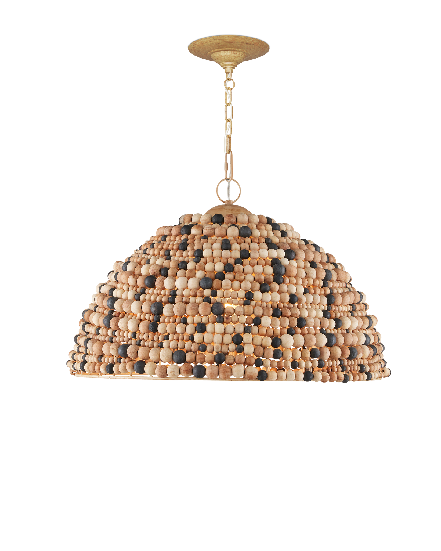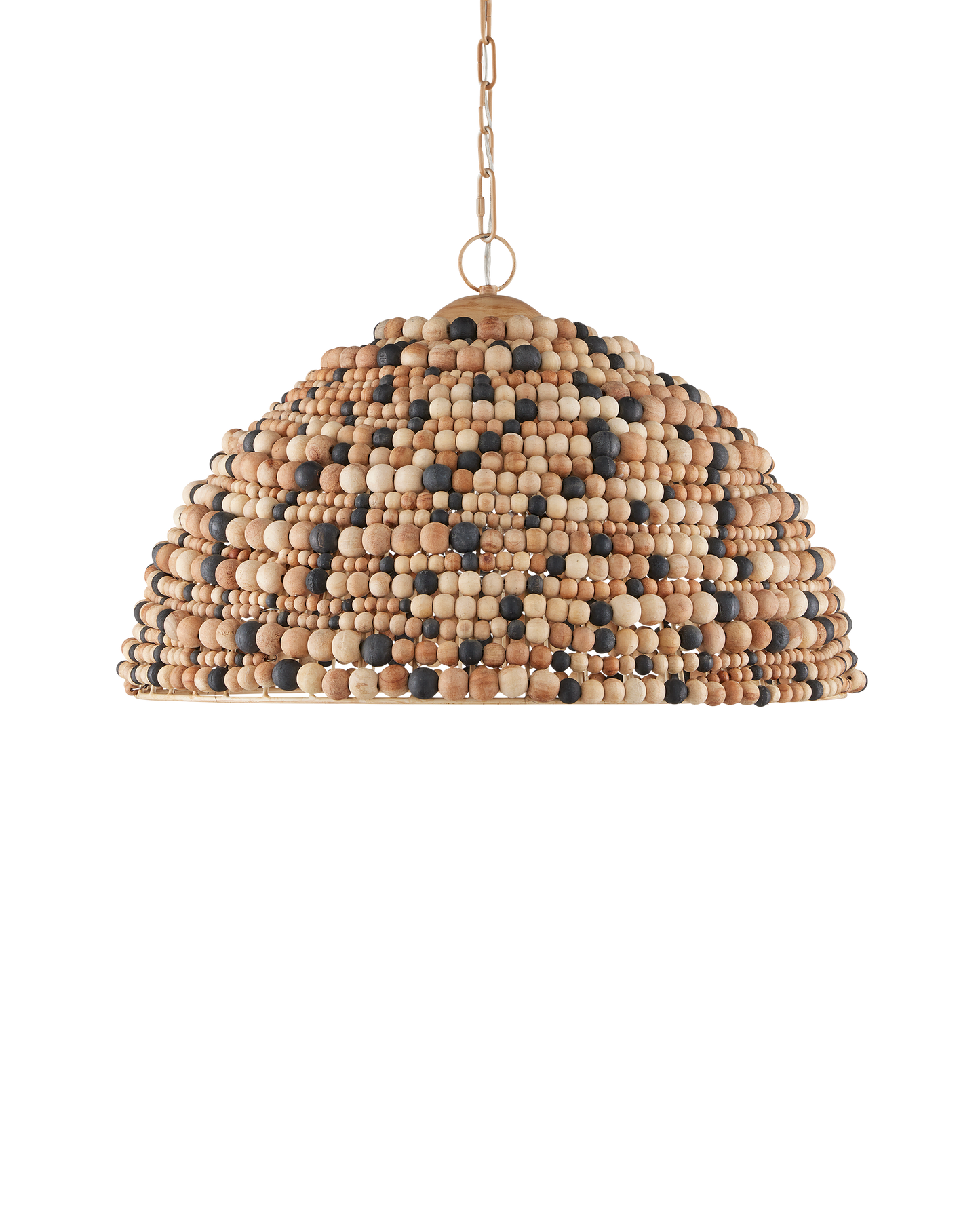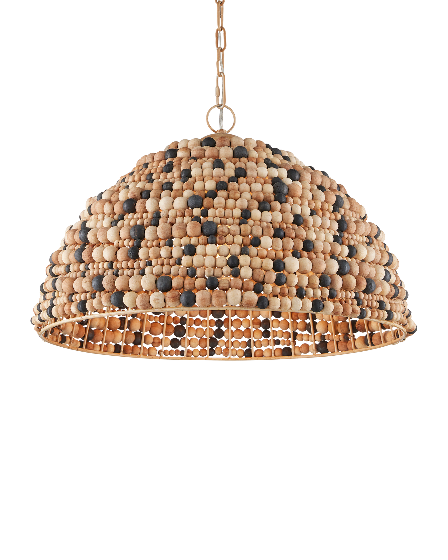 The Medley Pendant features a pebbly texture created by wood beads that vary in size and colornatural, tan, and black. The dome-shaped pendant is thoughtfully designed, with wires welded together to accommodate the different bead sizes. This striking fixture is equally captivating when viewed from underneath. Adjustable from 23" to 90" with use of included chain/rod kit/cable. If your space calls for a longer drop, additional chain/rods/cable is available for purchase.