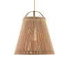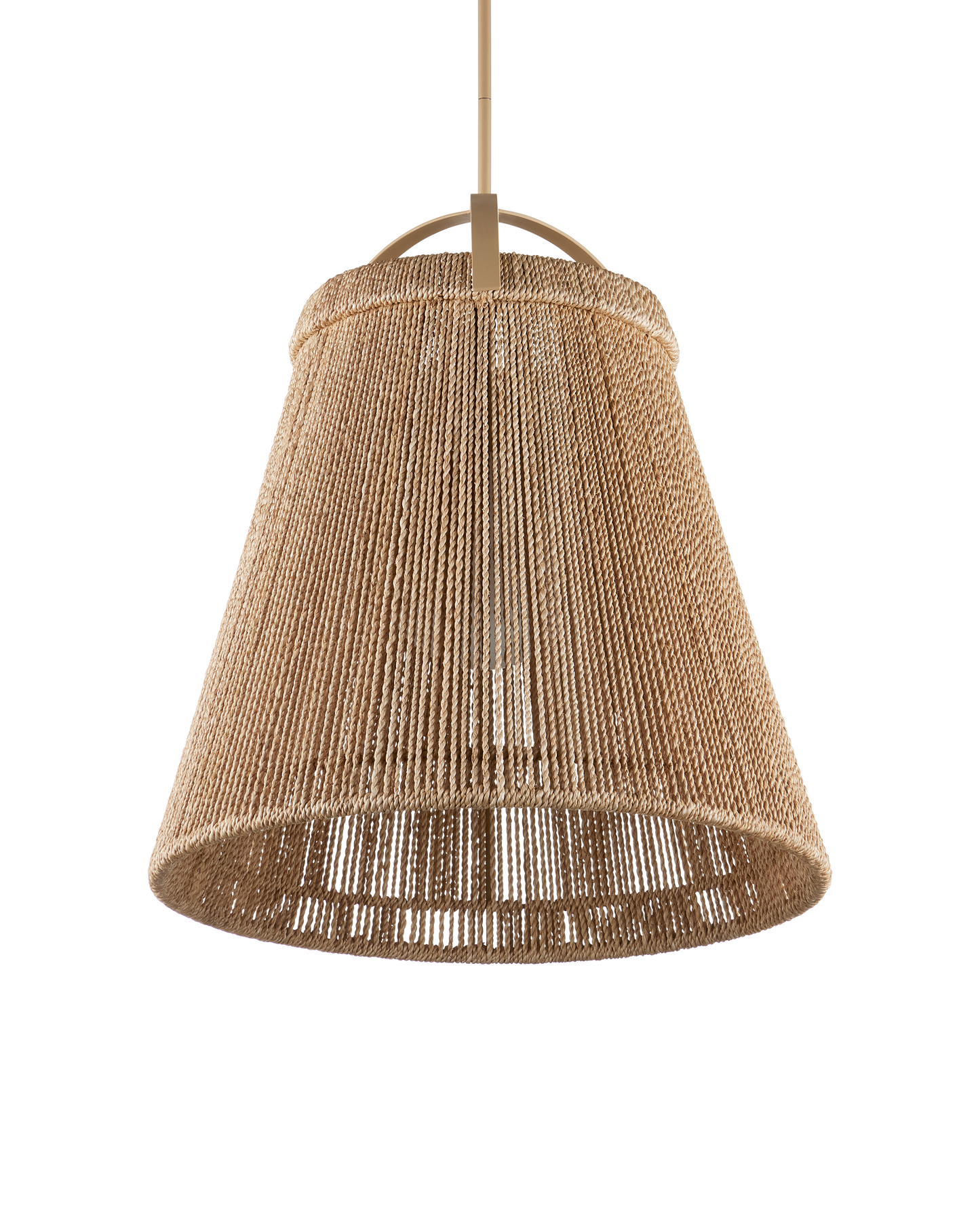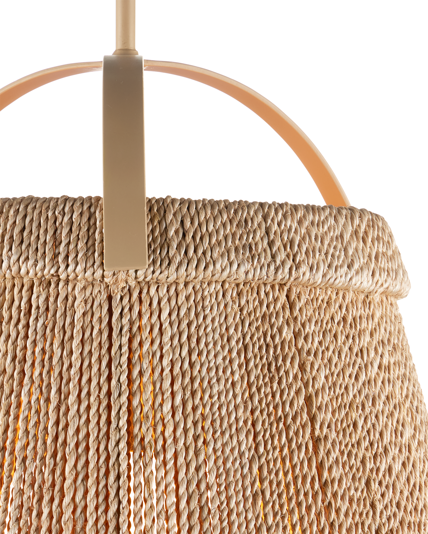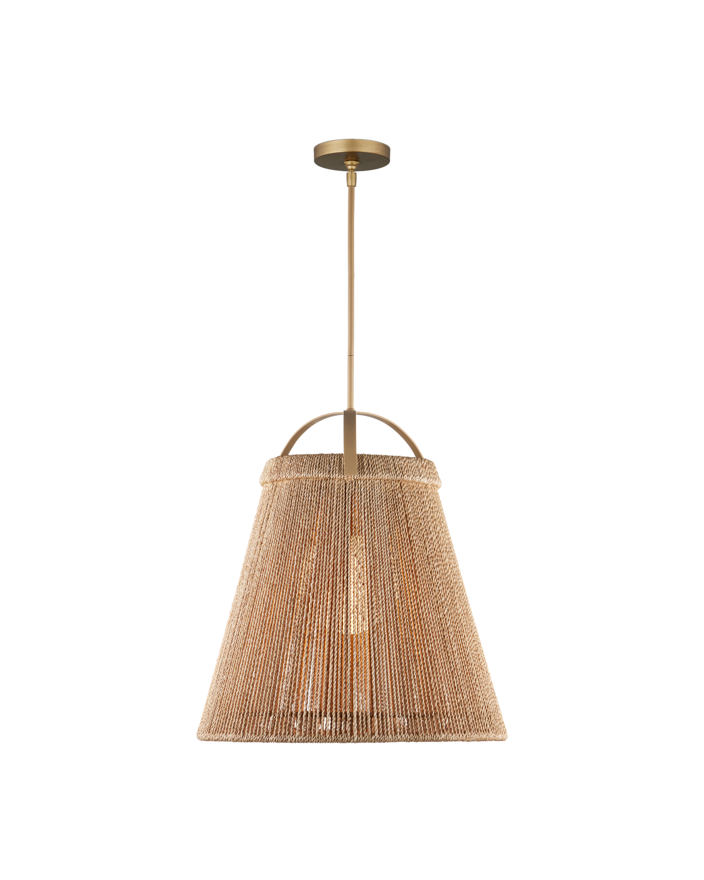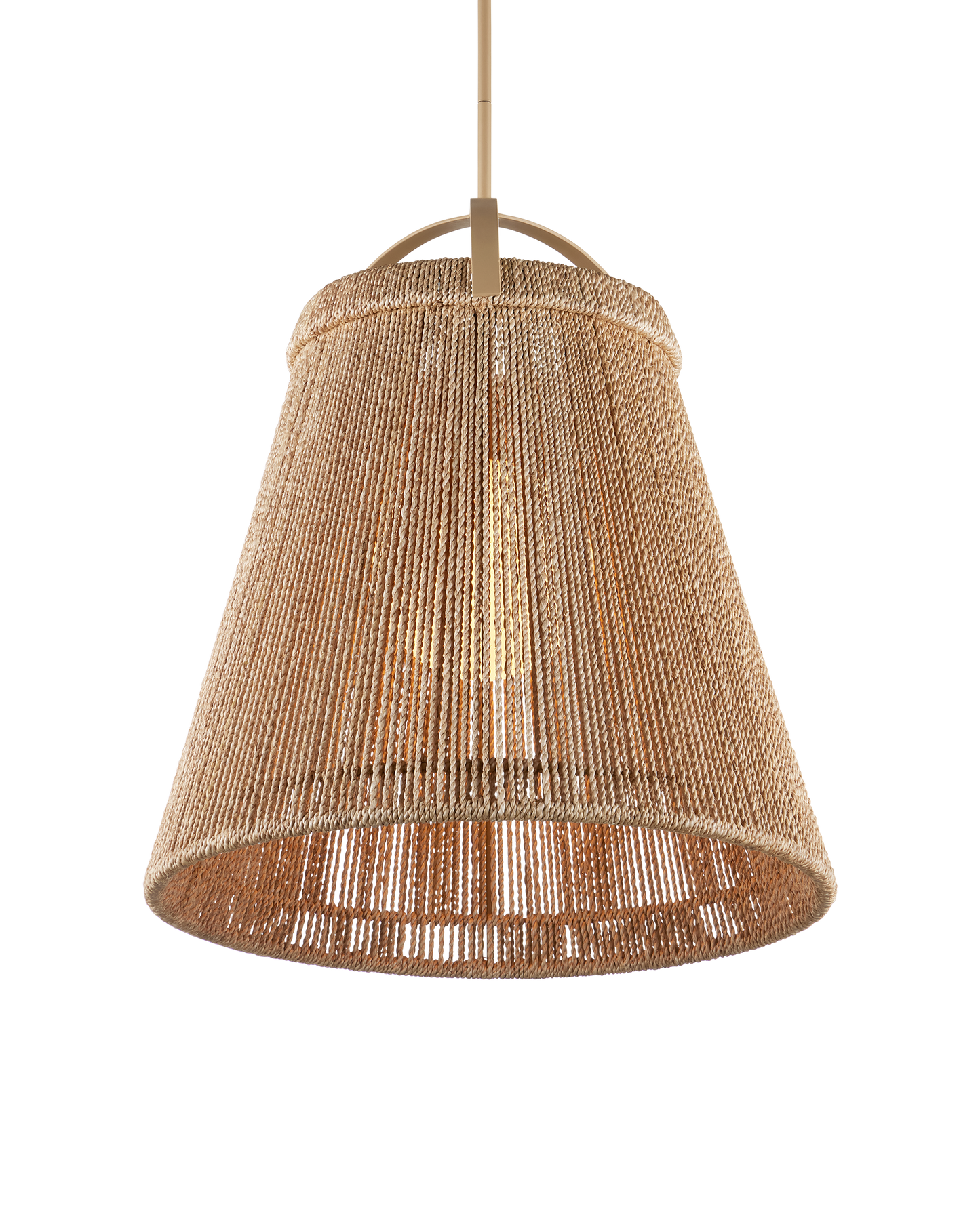 The Parnell Medium Natural Pendant resembles a bell made of natural Kraft Paper twine that is painstakingly double-wrapped on both the outside and the inside of the wrought iron frame in a beige finish. A frosted white glass globe holds the one light, which is dimmable, within the textured shade that flares to 24 inches in diameter at the bottom. Adjustable from 32.75" to 74.75" with use of included chain/rod kit/cable. If your space calls for a longer drop, additional chain/rods/cable is available for purchase.
