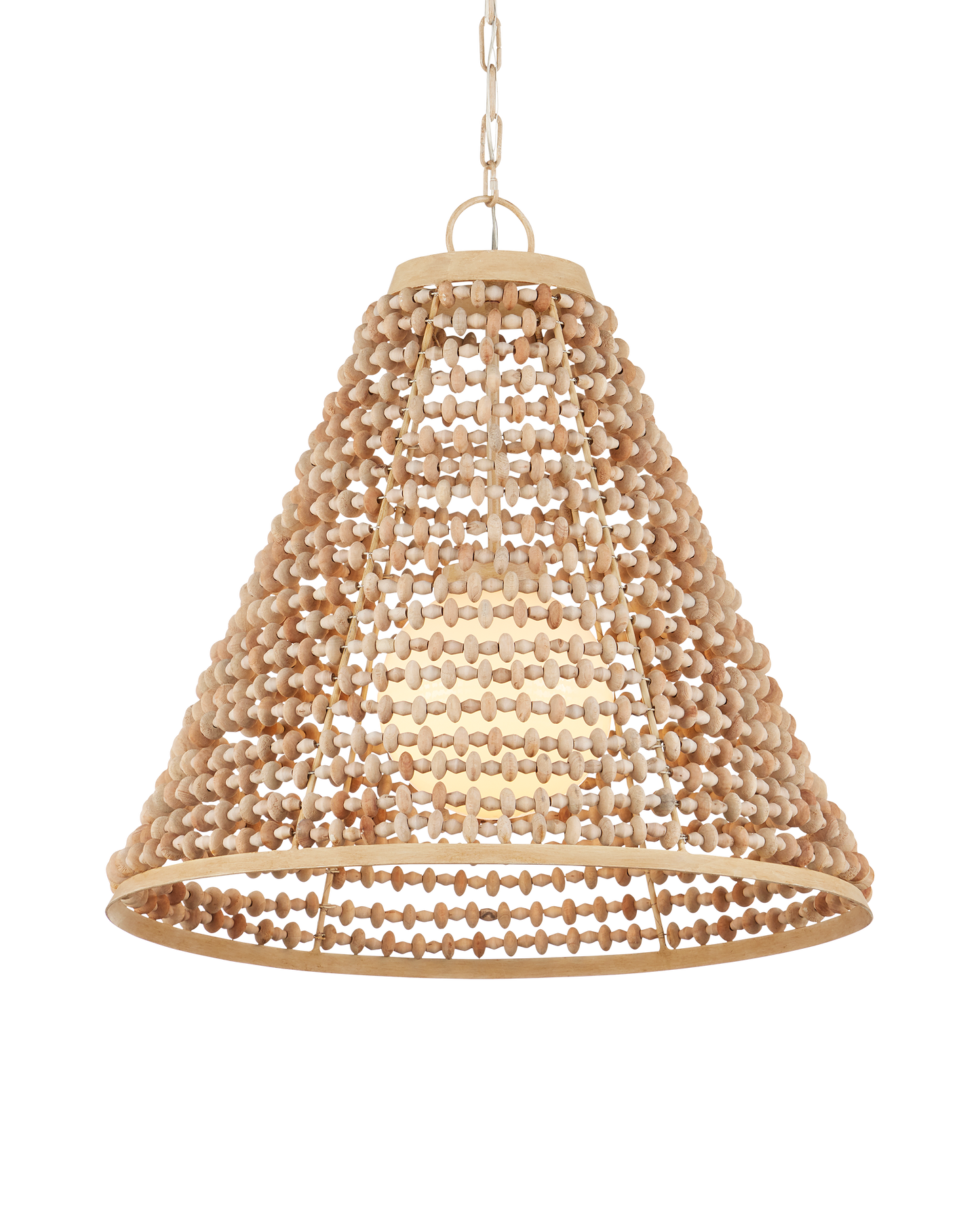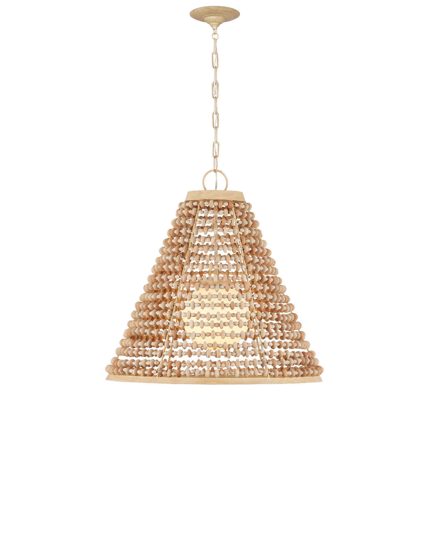 A design detail of note on the bell-shaped Pendulum Pendant are the varying sizes and shapes of the wood beads and how they are strung in tandem. Elongated round shapes are interspersed with rhombus-shaped beads to make this an artful creation. The Coco Cream finish on the metal is perfectly in sync with the natural hues in the wood on this bohemian-inspired piece. Adjustable from 33" to 100" with use of included chain/rod kit/cable. If your space calls for a longer drop, additional chain/rods/cable is available for purchase.