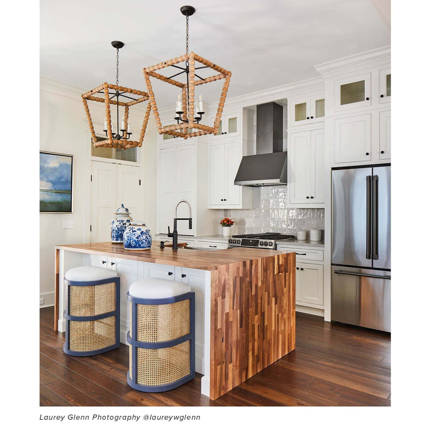 Hand-lathed from solid wood and finished for a rustic chic effect, the Perennial Lantern is a perfect choice for dining rooms, kitchens, or entrances that are in need of a statement piece. The added faux drip wax details on the candle sleeves add a relaxed coastal style.