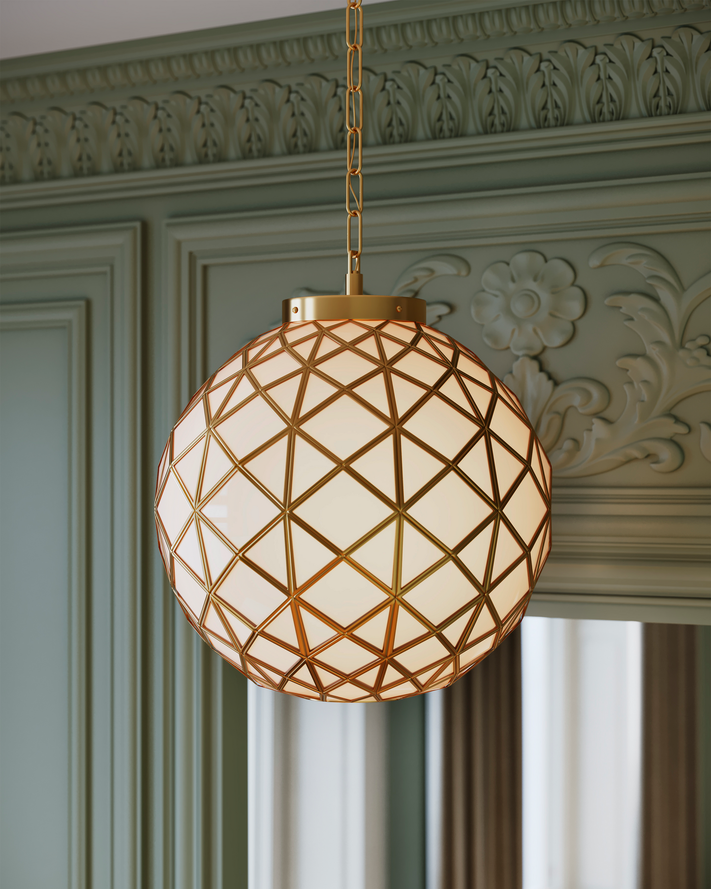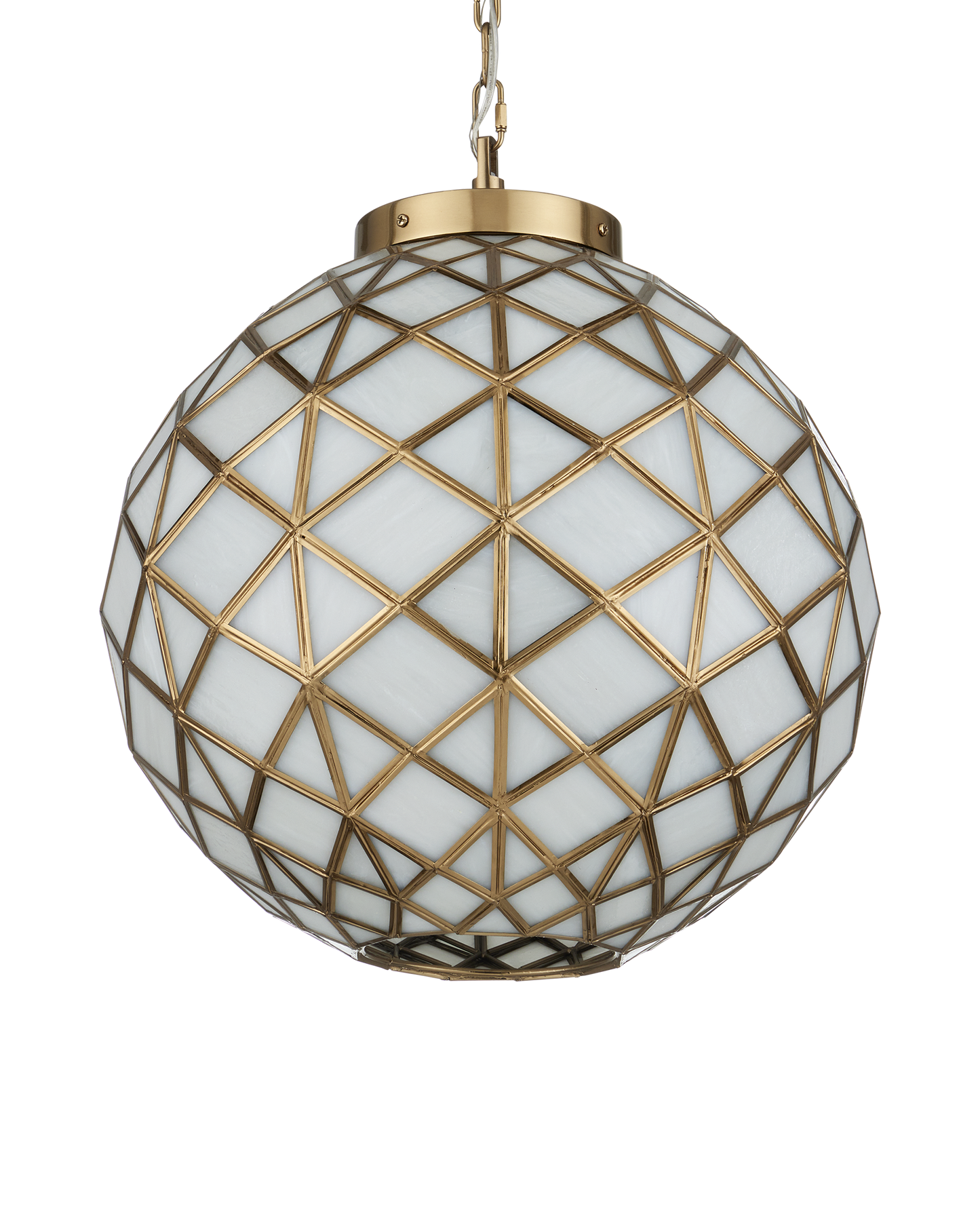 The name of he Polyhedron Small Pendant pays homage to its triangular panes of white glass pieced together between antique brass delineations. Though the glass looks uniform when the illumination warms it, there are subtle drifts of milkier white in some spots that others, which adds a bit of texture to this geometric design. Adjustable from 24.5" to 92.5" with use of included chain/rod kit/cable. If your space calls for a longer drop, additional chain/rods/cable is available for purchase.