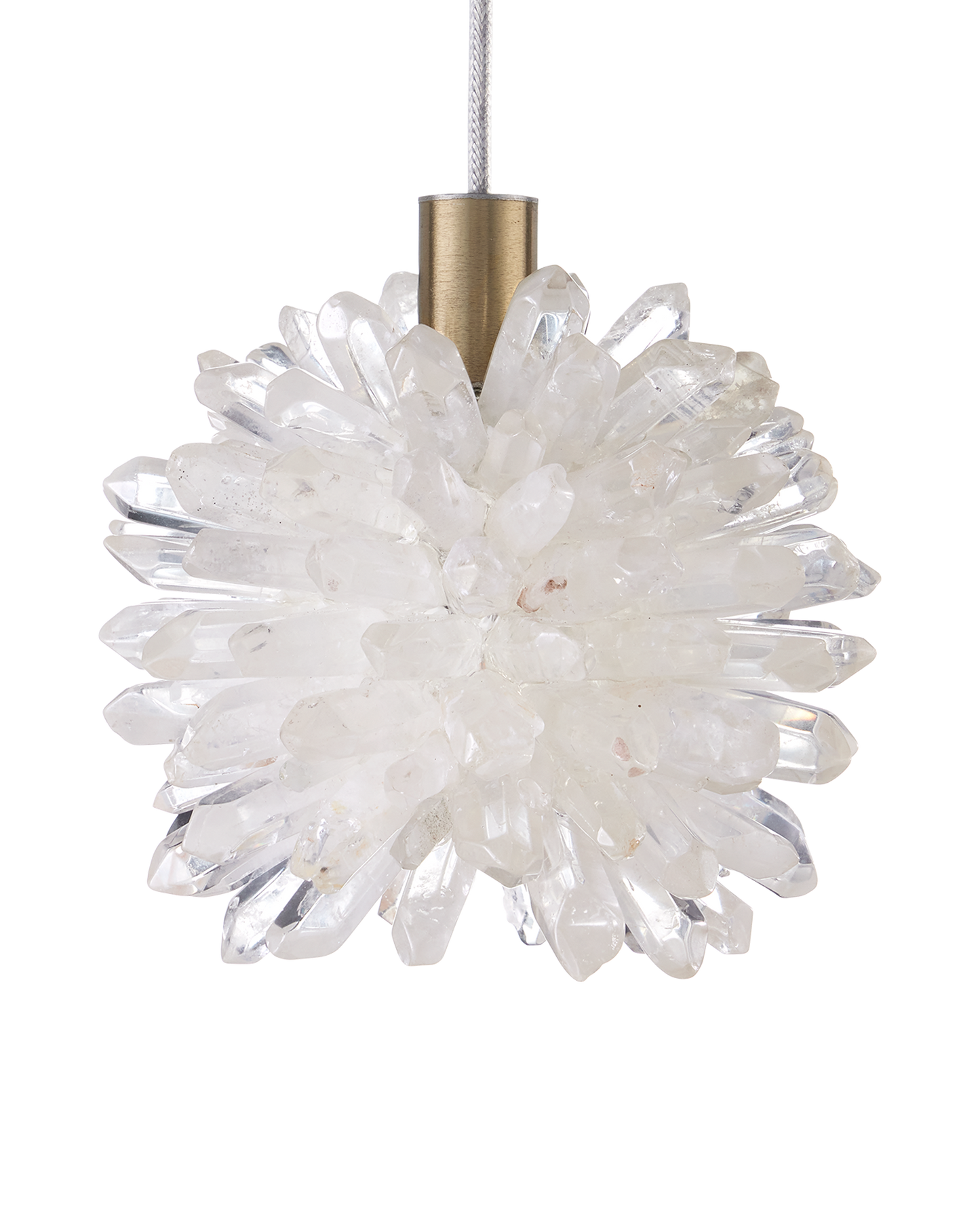 The petite Purity Pendant is a burst of brightness with each of its spikes made of natural quartz. The crystal is very reflective so it creates a nice glow when illumination strikes it. The white pendant takes on another aspect of this natural material, as the textural quality of the crystal creates a more dynamic profile. It hangs from a slender cord to keep the design simple. Adjustable from 10" to 123" with use of included chain/rod kit/cable. If your space calls for a longer drop, additional chain/rods/cable is available for purchase.