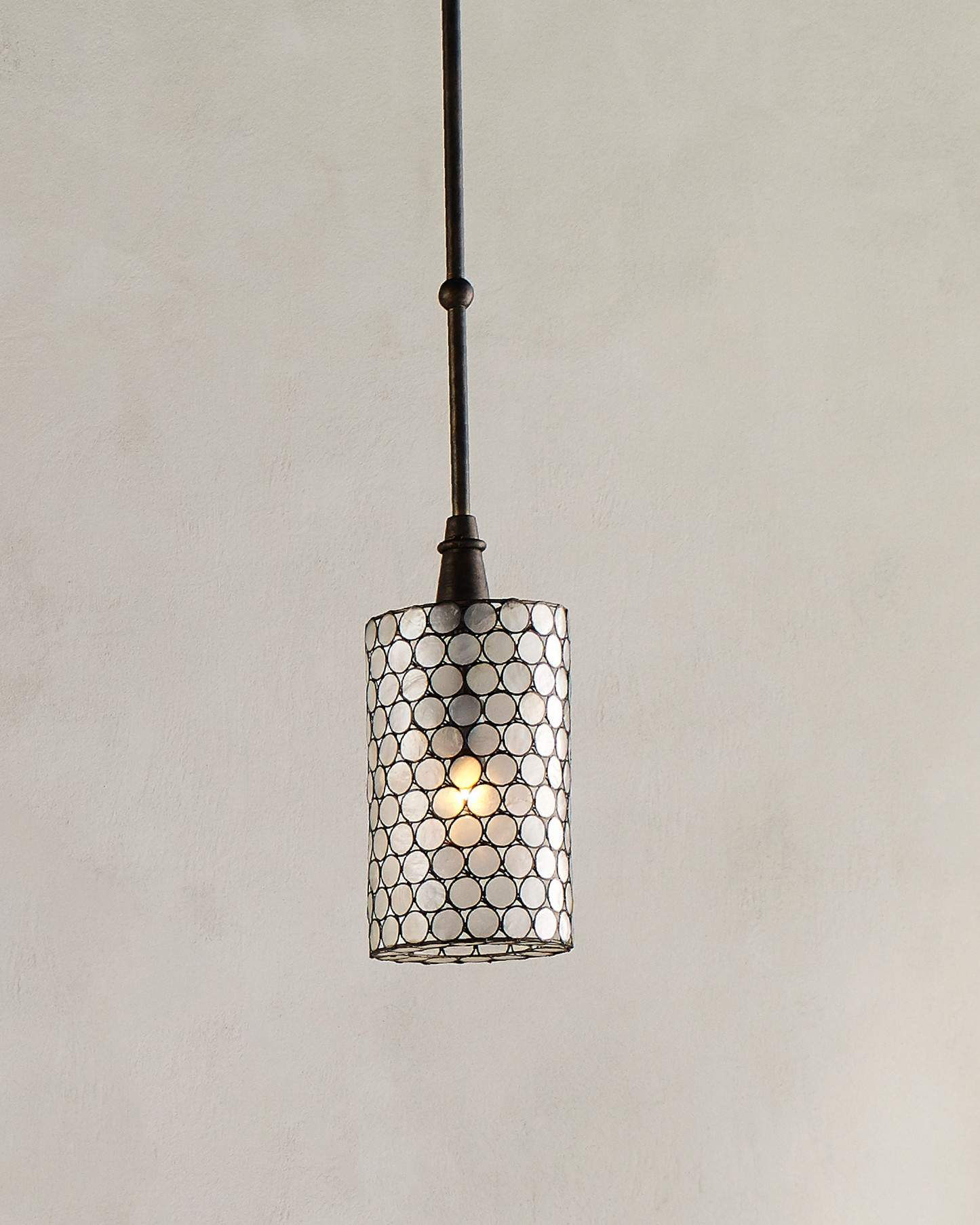 Natural Capiz shell and wrought iron in a Cupertino finish create a luminous circular pattern on the shade of the Regatta Pendant. The cylindrical pendant has such a pleasing glow when light shines through the lustrous shade. Given its petite size, the shell pendant is perfect for grouping or hanging in rows. Adjustable from 22" to 49" with use of included chain/rod kit/cable. If your space calls for a longer drop, additional chain/rods/cable is available for purchase.