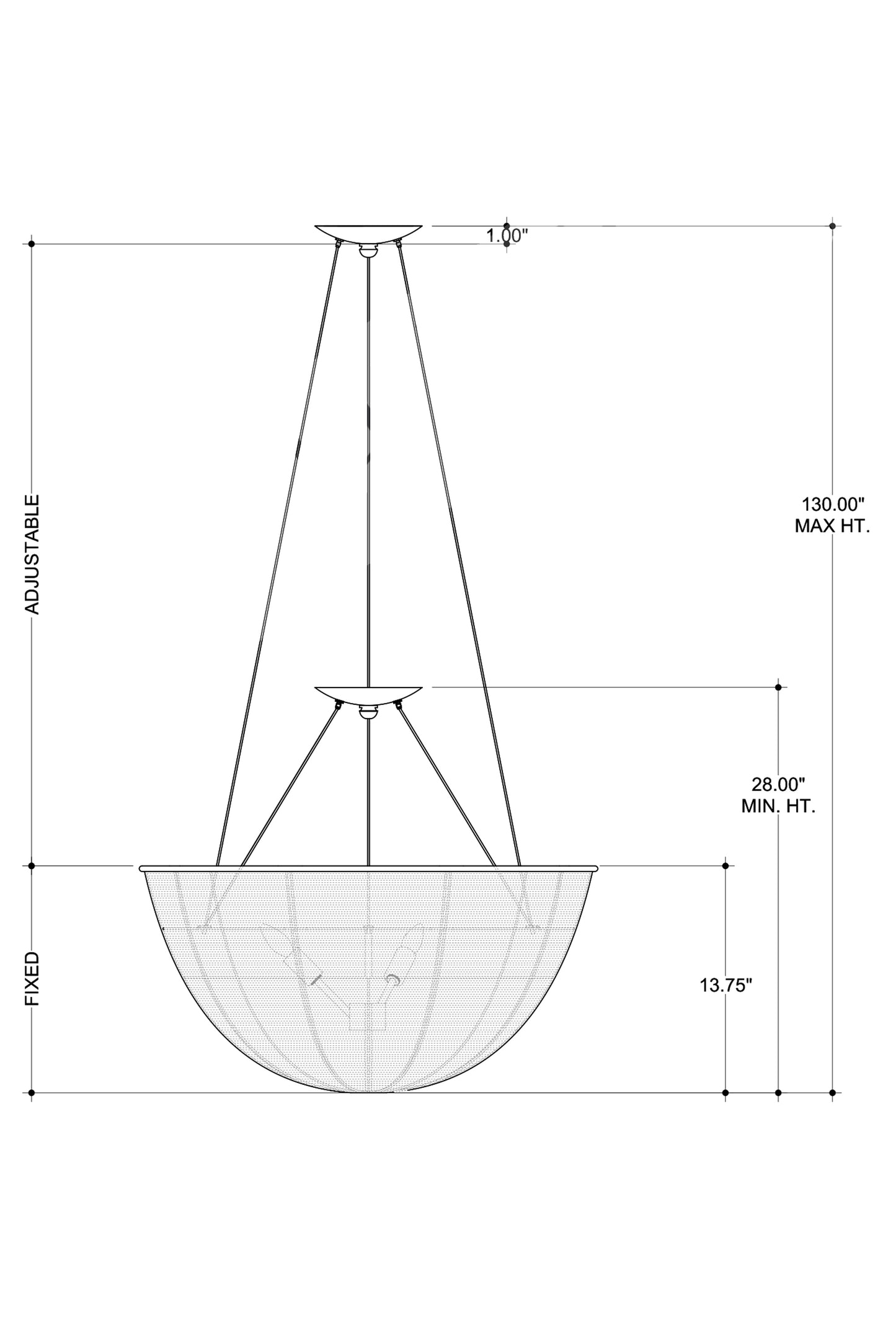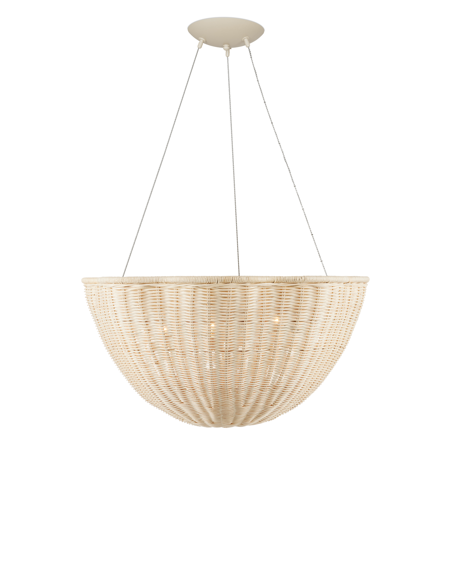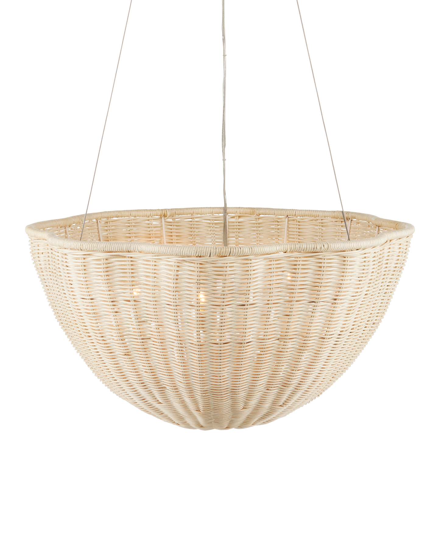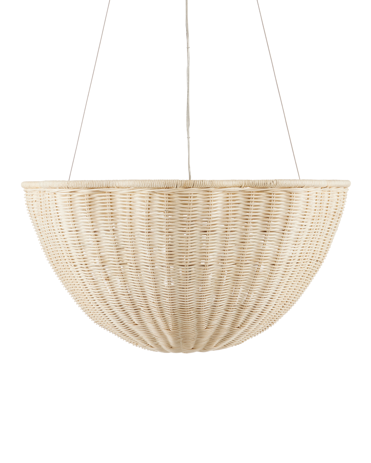 The Telos Pendant is made of wicker that has been bleached for a lighter feel. The beige pendant is perfect for spaces where an abundance of uplight is needed. The wicker pendant with its bowl-shaped profile is scalloped, though this is not obvious when viewed from the side. Given the nature of the woven natural material, pinpoints of light will waft through in spots. Adjustable from 28" to 128" with use of included chain/rod kit/cable. If your space calls for a longer drop, additional chain/rods/cable is available for purchase.