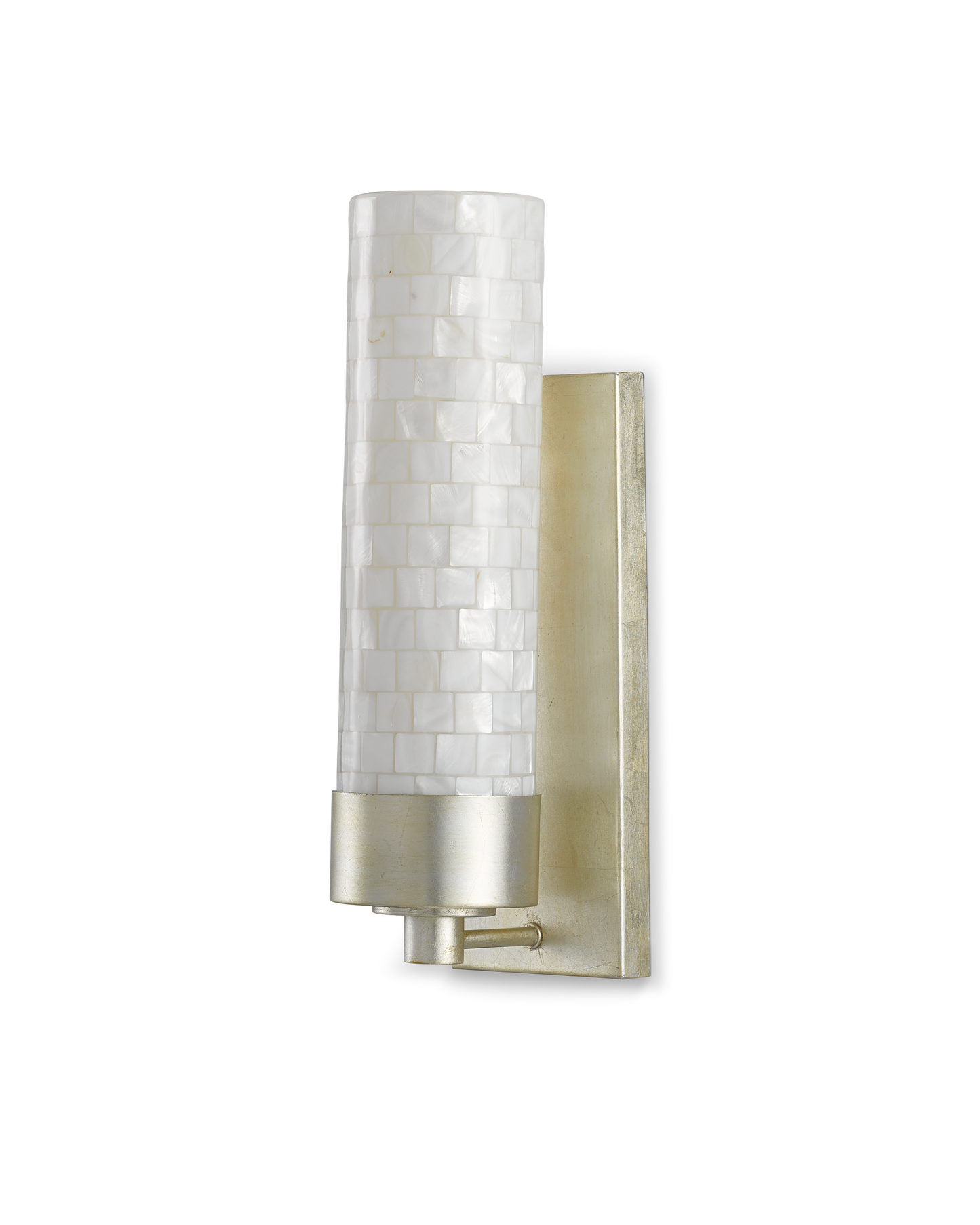 The Abadan Wall Sconce has a stylish thin canister shade made of luminous mother of pearl. When the lights are switched on, the surface of the shell ignites to make the polished nickel metal on this silver wall sconce just as radiant. It's a terrific fit for a hallway or a bath.
