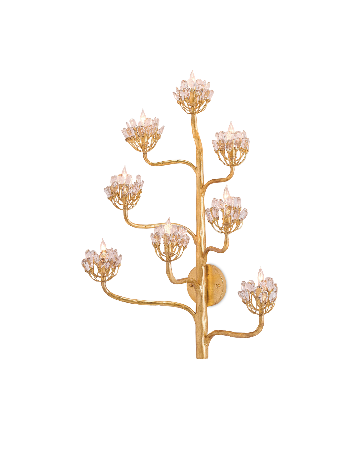 The Agave Americana Gold Wall Sconce is a grand piece inspired by the Century plant of the American desert. Eight lights are surrounded by clusters of faceted crystals. Its branches of hand-forged metal tubes in a dark contemporary gold leaf finish bring warmth to the gold wall sconce.
