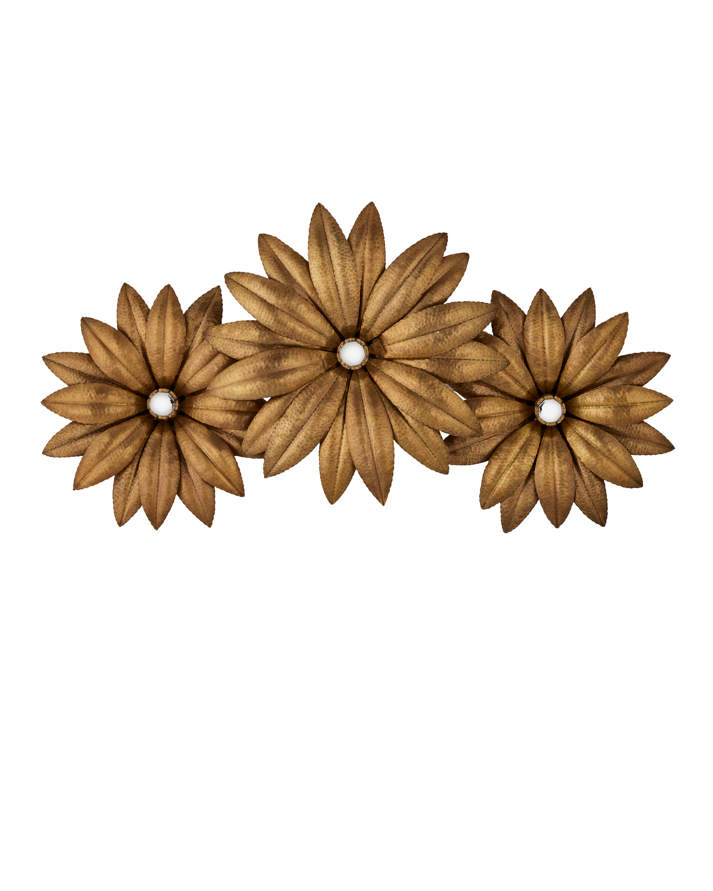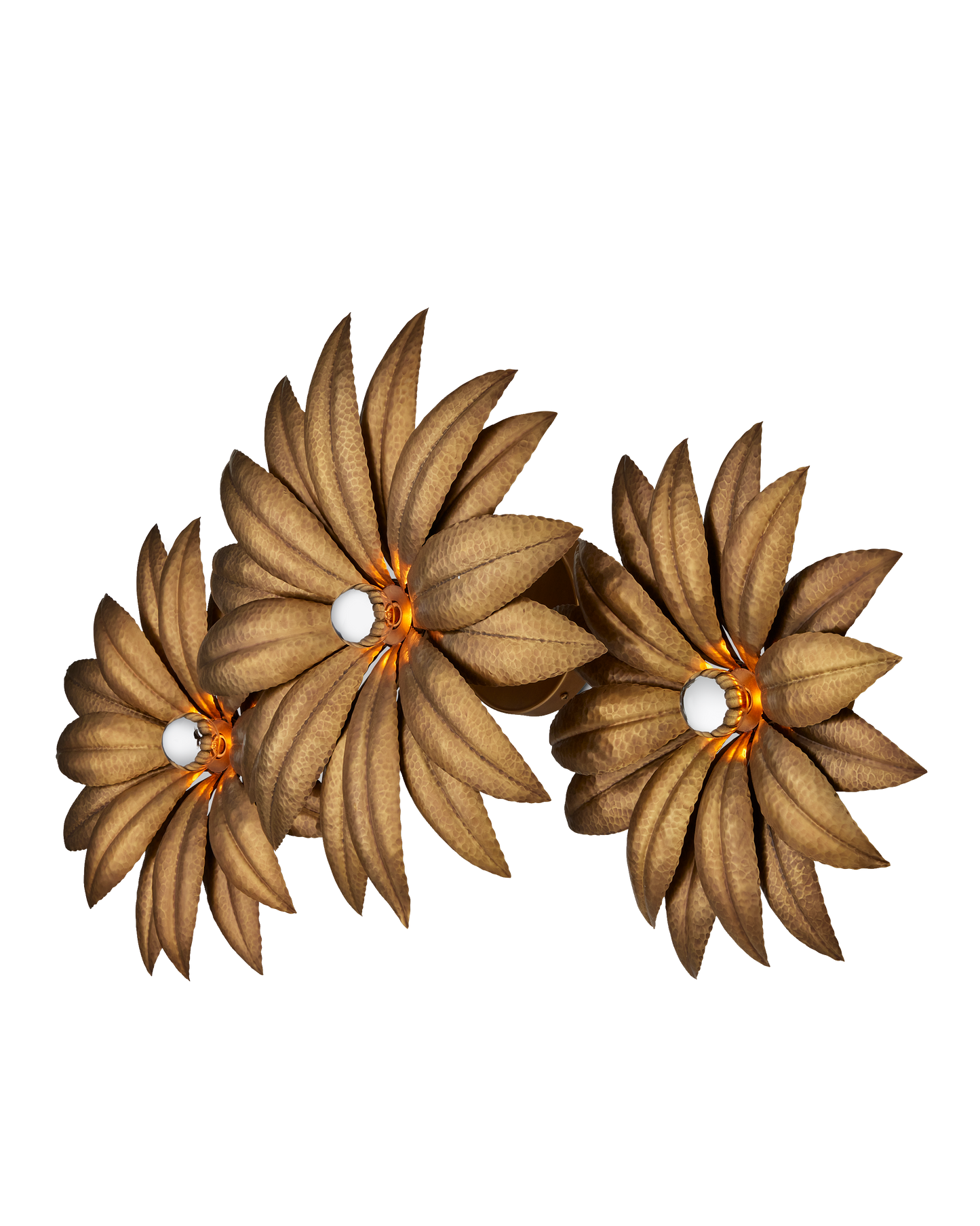 The Alithea Large Wall Sconce is made of brass in an antique brass finish. The petals on this nature-inspired gold sconce have been hand-hammered to give them lifelike personality. The floral sconce will be a pretty addition to any space it illuminates. The button-like bulbs bring the metal a luminous sheen.