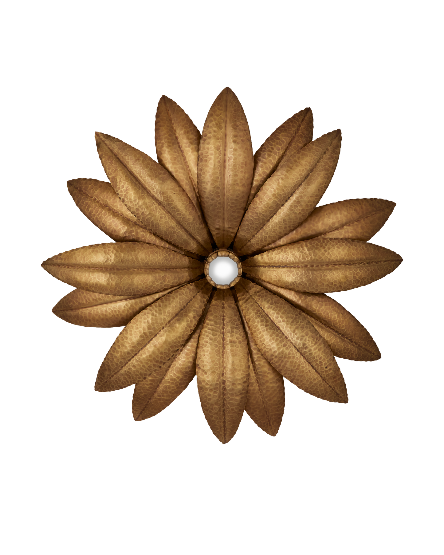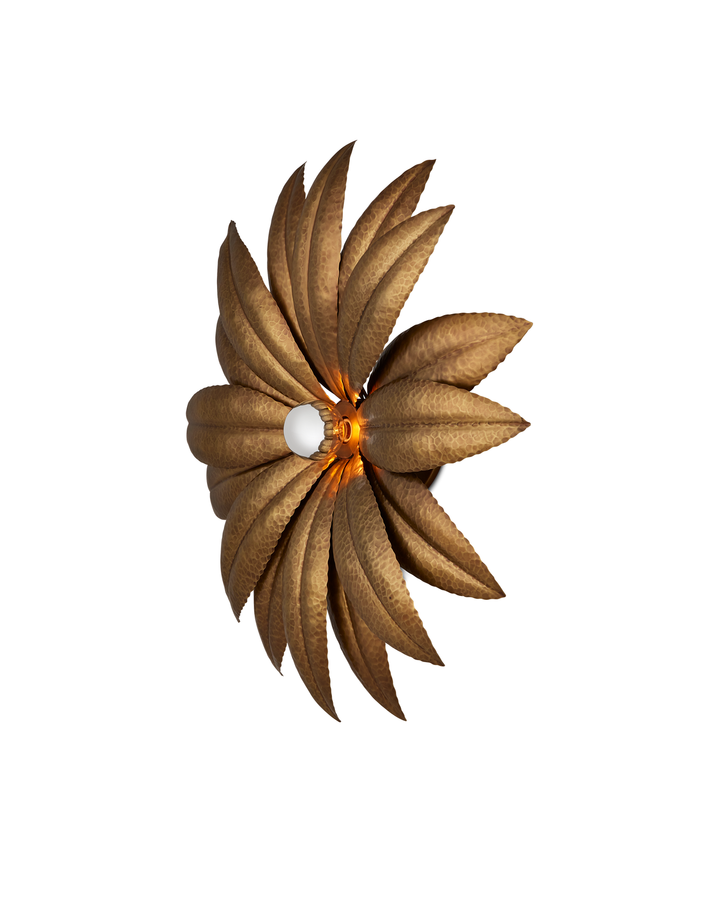 The Alithea Single Wall Sconce is made of brass in an antique brass finish. The petals on this nature-inspired gold sconce have been hand-hammered to give them life-like personality. The floral sconce will be a pretty addition to any space it illuminates. The button-like bulb brings the metal a luminous sheen.